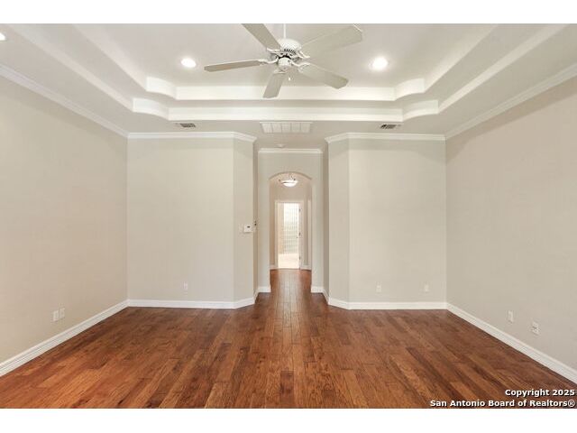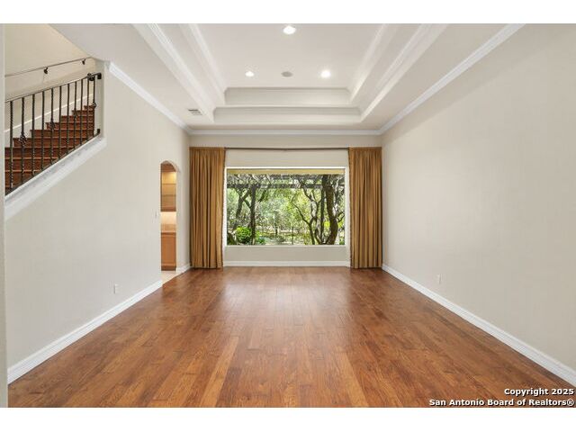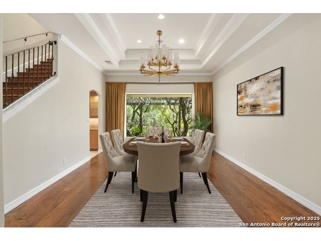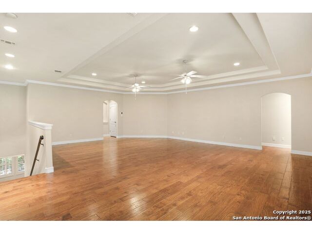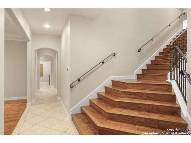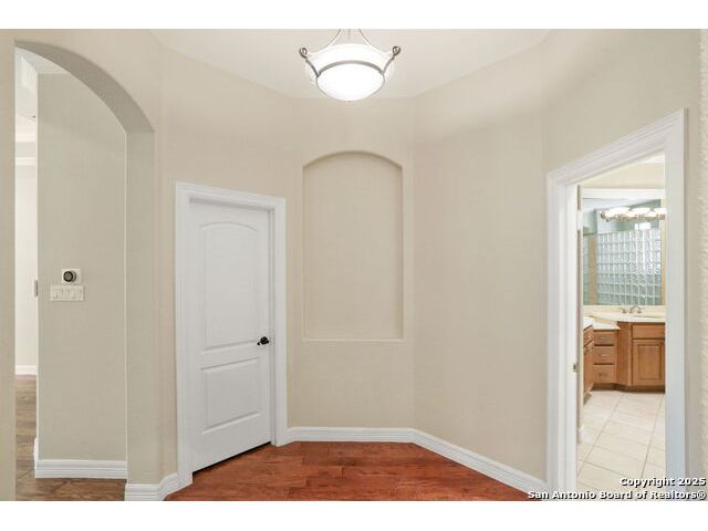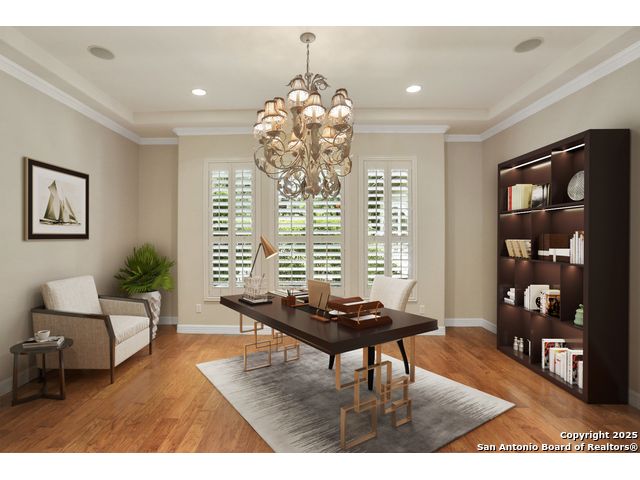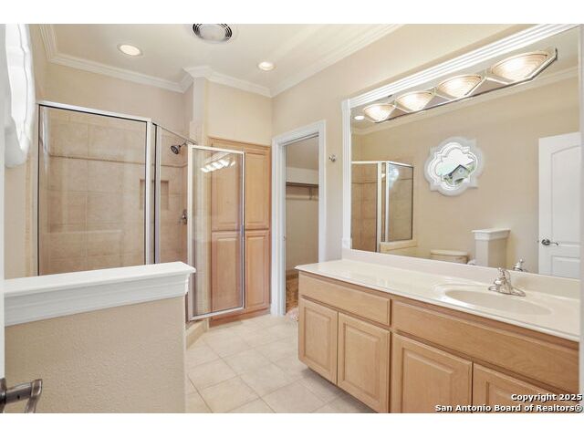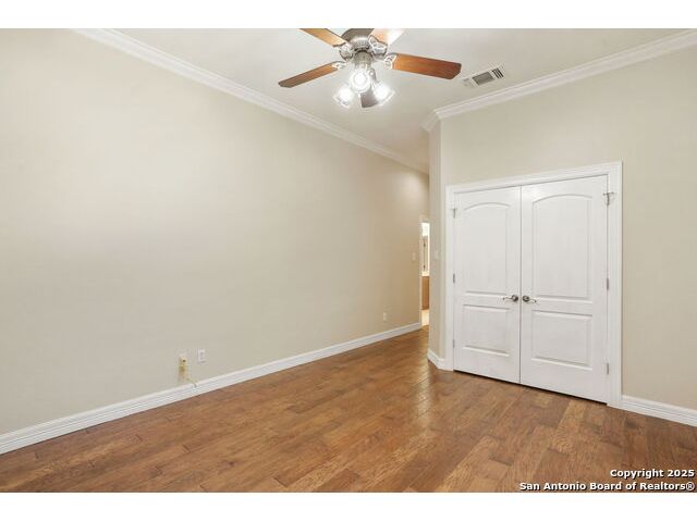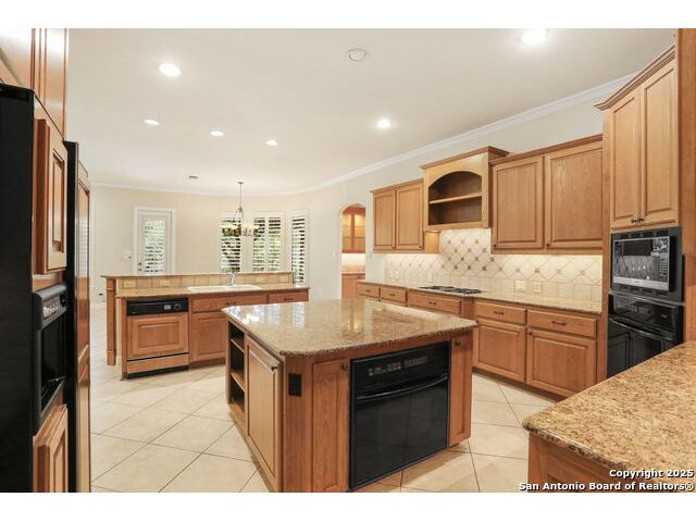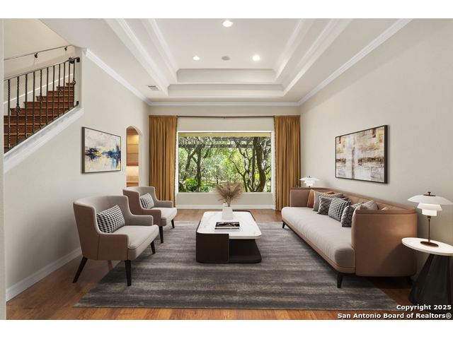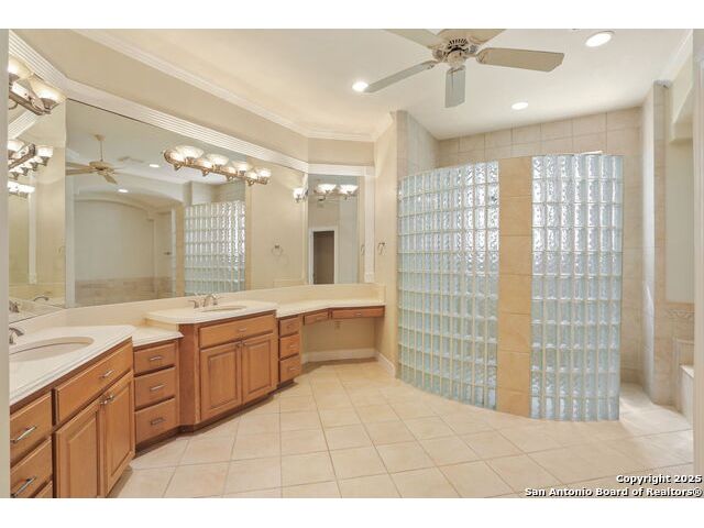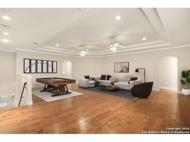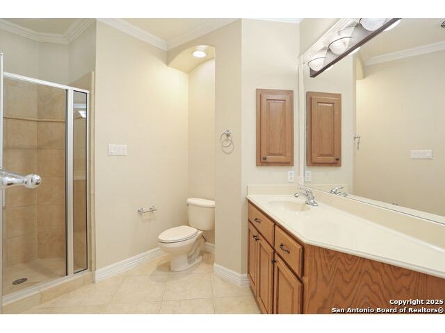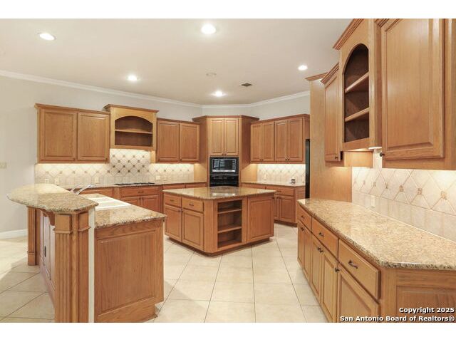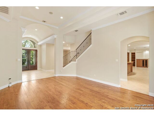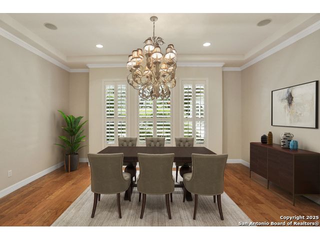 Location. Luxury. Lifestyle. Looking for the perfect blend of luxury living, unbeatable location and top-tier security? Welcome to The Estates of Canyon Springs- a prestigious guard-gated golf course community just north of Stone Oak. This exquisite one-owner Burdick Custom Home, set on a private greenbelt lot, is the ultimate expression of refined Hill Country living. Step inside and be captivated by the grand entry, flanked by a formal living and/or dining area-ideal for elegant entertaining or intimate family gatherings. The chef's kitchen is a culinary masterpiece, featuring abundant white oak custom cabinetry, a large center island, gas cooking, double ovens, a built-in refrigerator and thoughtful finishes that make cooking a joy. The open-concept great room impresses with a decorative TV wall and custom built-ins, including a hidden bookcase that leads to a secret study-a unique touch that adds both charm and function. Designed with privacy in mind, the primary suite is its own secluded retreat, complete with two generous walk-in closets, built-in drawer storage and a spa-like bath featuring a soaking tub and walk-in shower for the ultimate relaxation. A private guest suite is also located on the main level-perfect for multigenerational living or overnight visitors. Upstairs, you'll find three spacious secondary bedrooms (all with walk-in closets), two full baths (including an ensuite and a Jack-and-Jill), and an oversized game room-ideal for movie nights, gaming or homework zones. Step outside to your private backyard paradise. Lush landscaping surrounds a sparkling Keith Zars pool with a tranquil waterfall, attached hot tub and an expansive covered patio with a cozy outdoor fireplace. The extended pavilion is already outfitted with a gas hook-up-ready for your dream outdoor kitchen. Architectural details abound-from crown molding and plantation shutters to a water softener and more-this home is built for comfort, style and enduring quality. Luxury, Privacy and Timeless Elegance. Highly rated NEISD schools. Don't miss your chance to own a home that truly has it all.