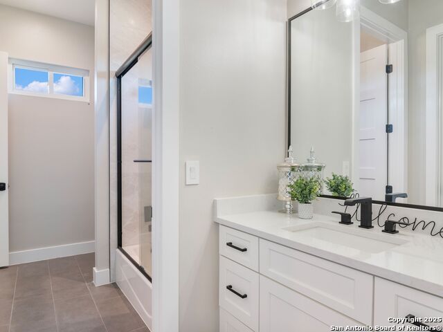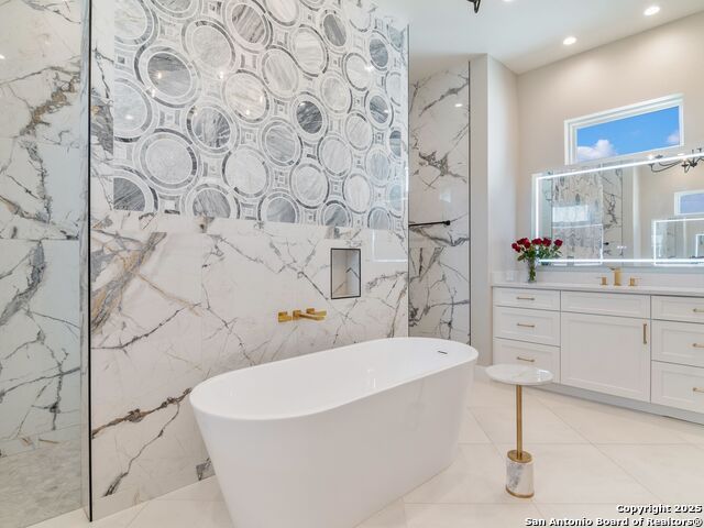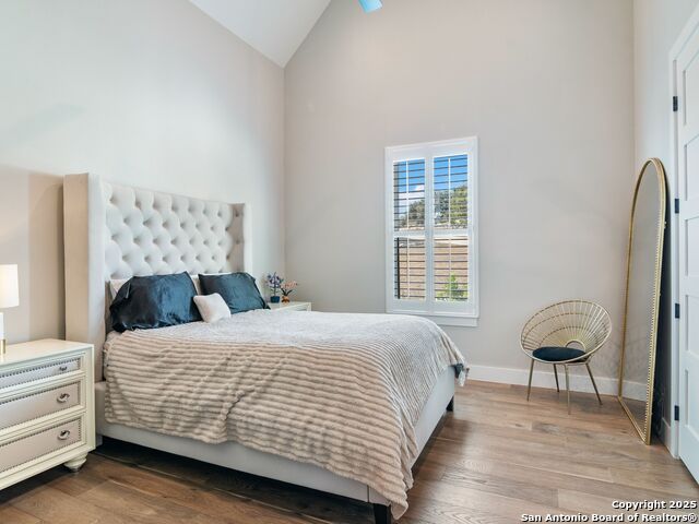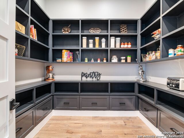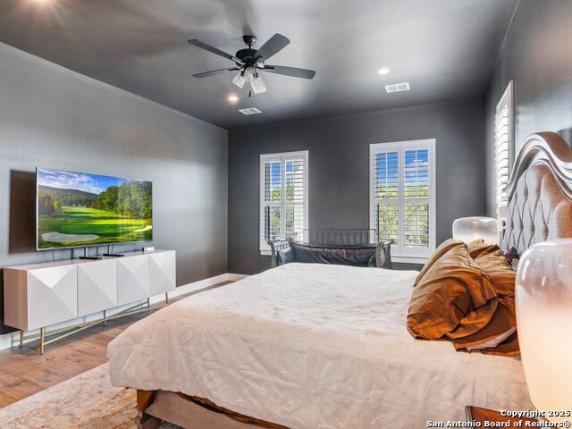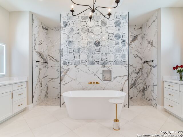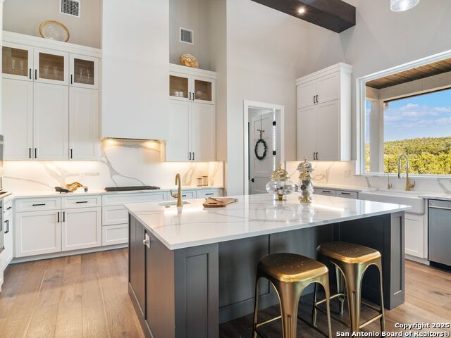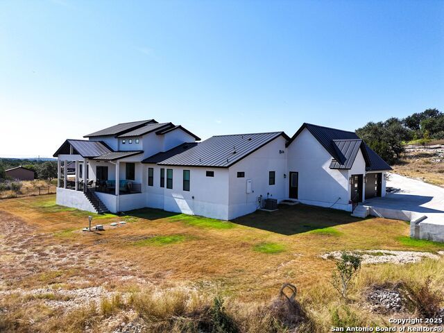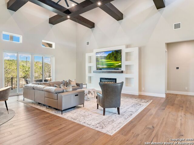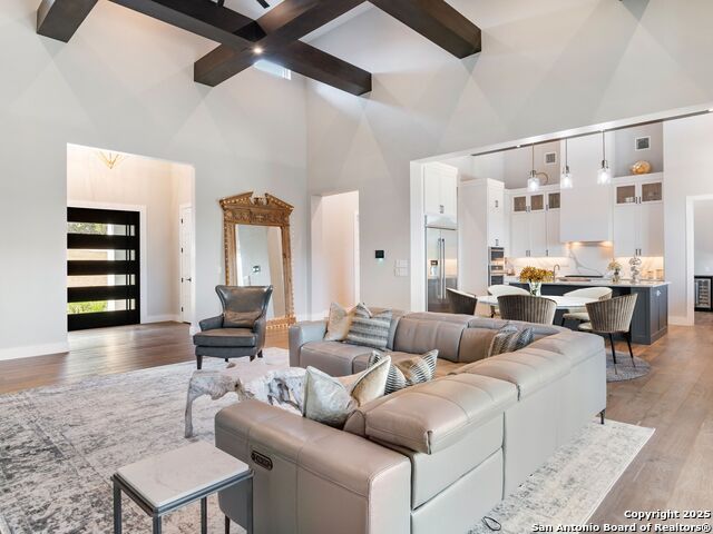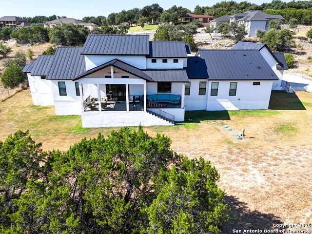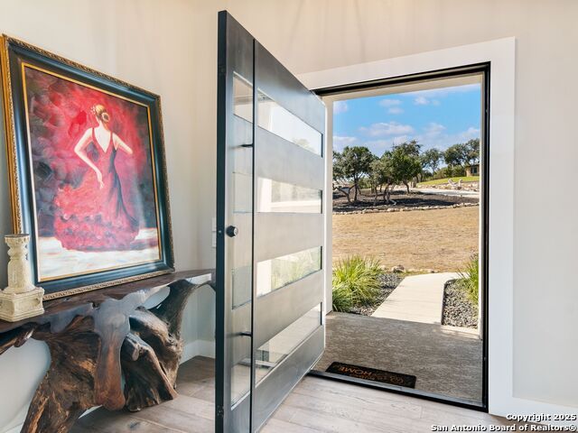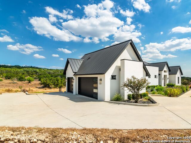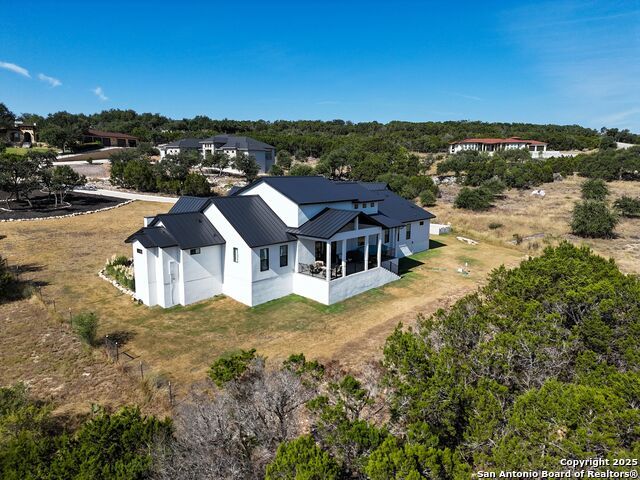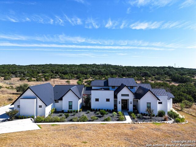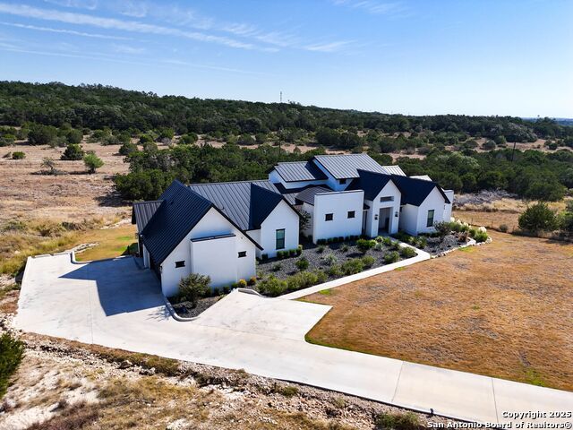 Breathtaking contemporary single-story with 4 beds, 3.5 baths, and 3873 sq ft situated on 1.44 acres in the coveted, gated subdivision of Ramble Ridge! Nestled amongst picturesque hills, the stately driveway leads you to the captivating front entrance. Upon entering, the 20ft high ceilings and custom beams commands your attention for the great room with fireplace and a wall of windows. The gourmet entertainer's kitchen is outfitted with Jenn Air appliances, stunning quartz countertops, designer fixtures, and soft-close cabinetry. No detail has been spared with the pantry that looks straight out of the Home Edit - with an on-trend custom paint, custom cabinetry. Don't miss the designer bar space, a great focal point off the kitchen. The flex space off the living room is used as a media room but can also be a formal dining space. The luxurious primary bedroom features scenic views with total privacy and connects to a spa-like ensuite with a large walk-in shower, dual water closets, a modern free-standing tub, and your dual dream closets! Off the primary suite wing, you will also find an additional space that can be used as a study, a nursery, or workout space. The secondary bedrooms have ensuite baths and high ceilings. Storage space abounds with an expansive laundry room and spacious 3 car garage with electric vehicle charging outlet, cabinetry, and a sports storage wall. Enjoy the Texas Hill Country evenings on the grand back patio, perfect for relaxing and entertaining! With a ranch behind your lot, you have unmatched privacy and views!! Dual Solaris units for indoor air quality; new water softener & osmosis system; Comal ISD. Welcome home!