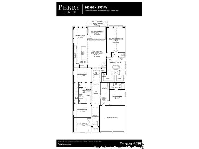 Home office with French doors set at entry with 12-foot ceiling. Coffered extended entry leads to open family room, kitchen and dining area. Family room features a wood mantel fireplace and wall of windows. Kitchen features corner walk-in pantry, 5-burner gas cooktop and generous island with built-in seating space. Primary bedroom highlights 12-foot ceiling and wall of windows. Double doors lead to primary bath with dual vanities, garden tub and separate glass-enclosed shower with separate walk-in closets. A guest suite with private bath adds to this one-story design. Covered backyard patio. Mud room off two-car garage.