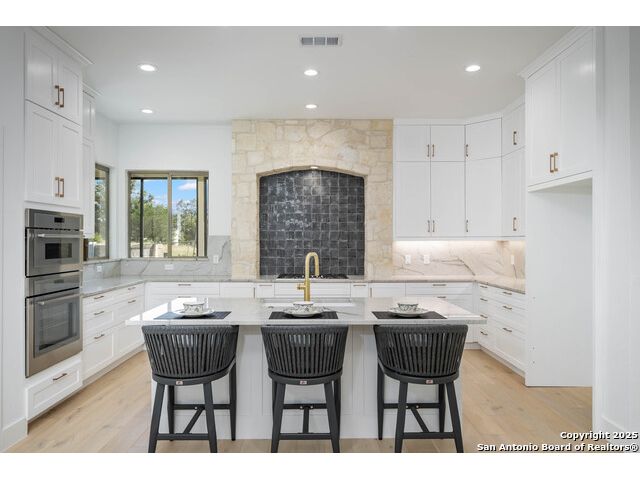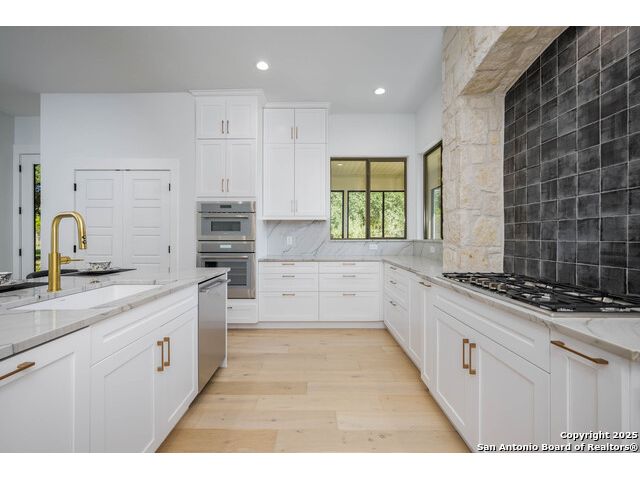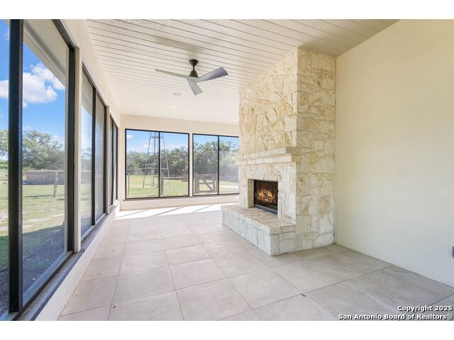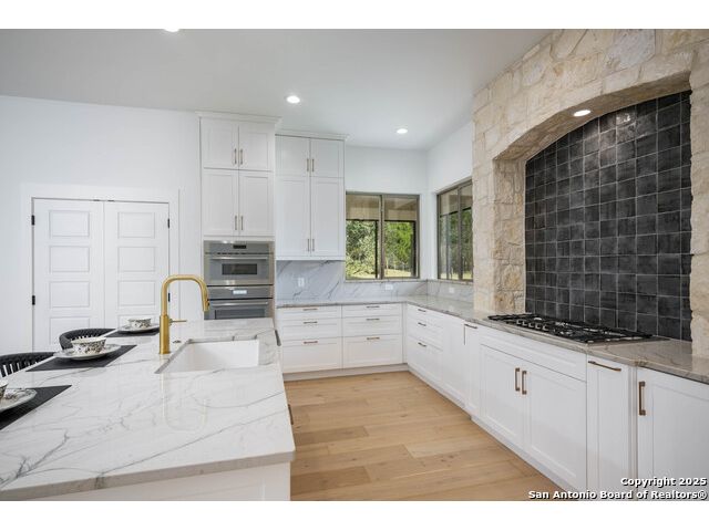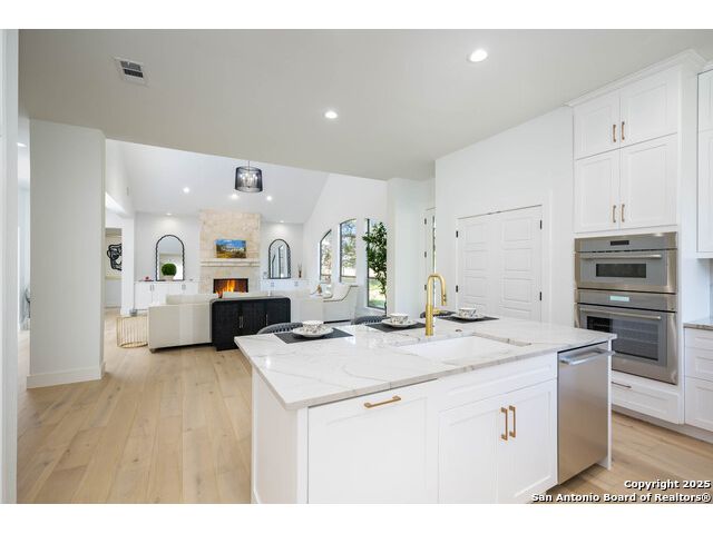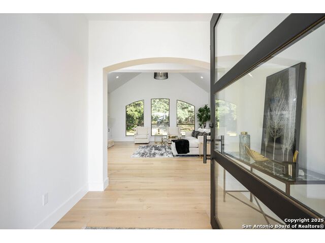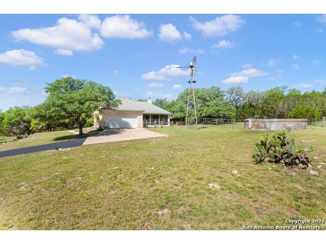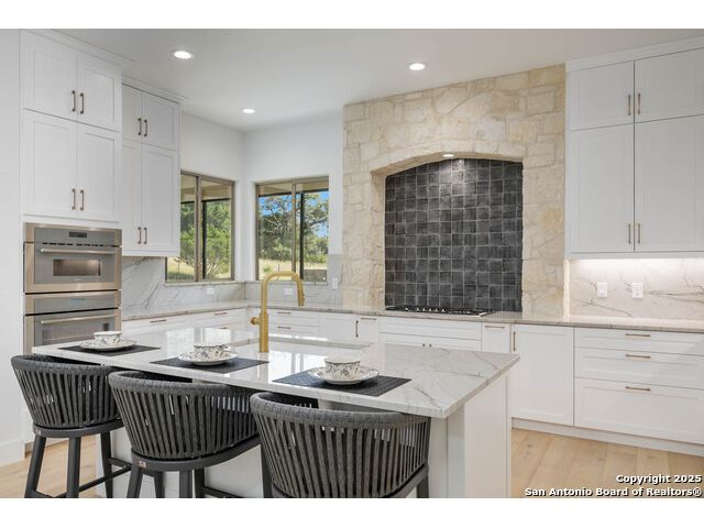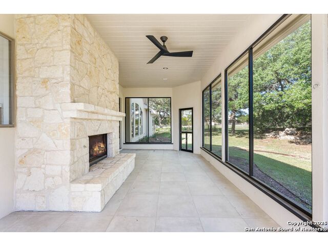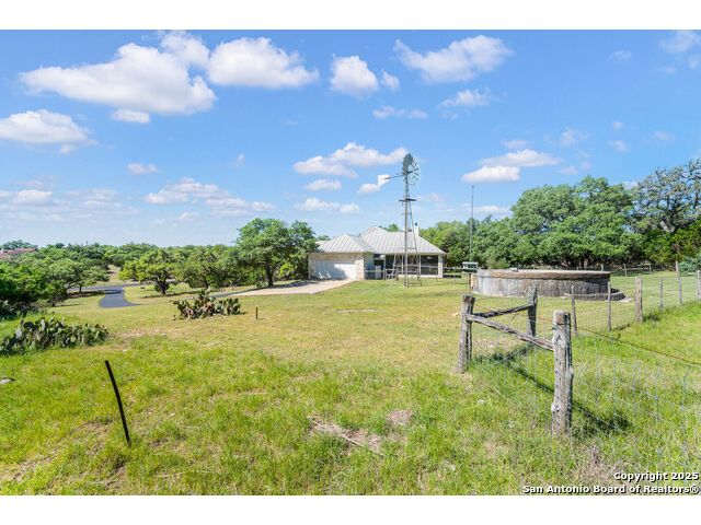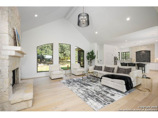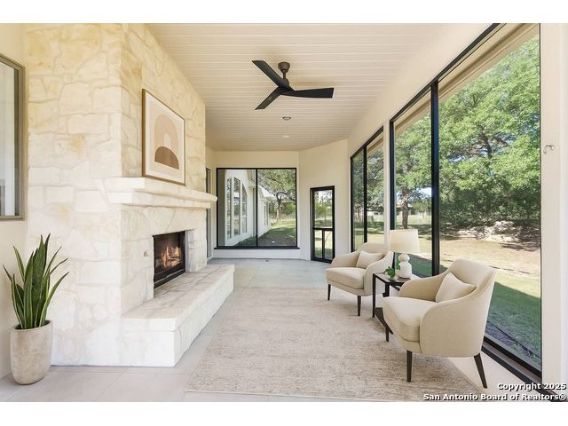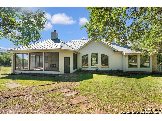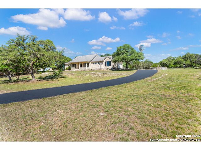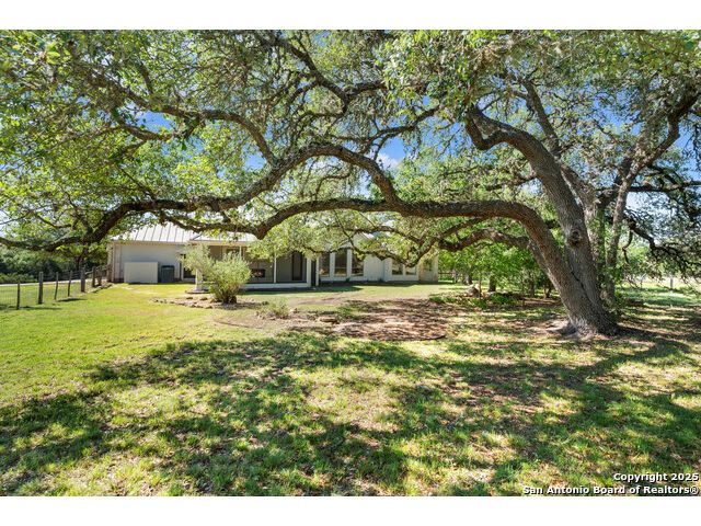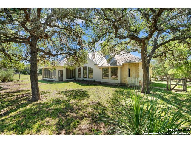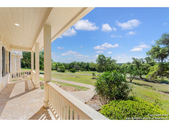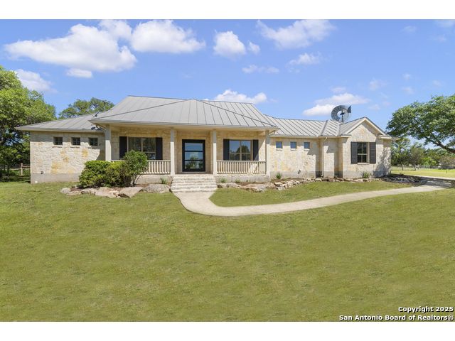 This exquisitely renovated single-story home is nestled on 5.14 acres with beautiful century old oaks! A charming meandering walkway leads to the front entrance, where custom exterior shutters elevate the home's curb appeal. Every inch of this transitional residence has been thoughtfully designed with impeccable attention to detail, featuring high ceilings, clean lines, and contemporary finishes throughout. Newly appointed finishes include wide-plank light hardwood flooring, designer lighting, decorative chandeliers, and custom hardware. Every aspect of the home has been meticulously upgraded, from the plumbing, including provisions for a water softener, to the soft-close custom cabinetry. The welcoming foyer, with its striking iron and glass pivot door, ushers you into the heart of the home. The great room features a soaring vaulted ceiling, anchored by a designer chandelier and a floor-to-ceiling stone fireplace that serves as the room's centerpiece. Flowing seamlessly from the living area is the dining space, which connects effortlessly to the chef-inspired island kitchen. This open concept layout enhances both functionality and style, creating an inviting atmosphere perfect for both entertaining and everyday living. The gourmet kitchen features quartzite countertops and top of the line Thermador appliances, including a 5-burner gas cooktop, built-in oven, microwave, and dishwasher. A convenient breakfast bar, a spacious pantry, and sliding windows opening to the screened-in patio making it ideal for both cooking and hosting. The primary suite is a private sanctuary designed for ultimate relaxation. A stepped ceiling adds an architectural touch, while the cozy window seat overlooks the beautifully landscaped backyard. With direct access to a private covered patio and an enclosed side yard, the space offers a serene retreat at the end of a busy day. The spa-like bath is equally luxurious, featuring a dual sink vanity with quartzite countertops in striking black and gray tones. The expansive walk-in shower is a true masterpiece, with dual seamless glass doors, dual rainfall showerheads, and a handheld extension for a truly indulgent experience. The home also includes two additional bedrooms, one of which could serve as a private study, as well as a utility room equipped with a sink and space for a refrigerator. The tranquil backyard is a paradise for outdoor living, offering a wraparound screened patio with a floor-to-ceiling stone fireplace and versatile spaces for lounging, dining, or playing games with family and friends. Overlooking the park-like grounds, the patio creates a seamless connection to nature, with mature trees and shaded canopies that provide a peaceful ambiance. A charming original ranch stone water trough and decorative windmill add rustic appeal to the landscape, while the expansive lawns are perfect for both leisure and play. This stunning property has been thoughtfully and tastefully reimagined, offering an ideal blend of modern sophistication and natural beauty. Conveniently located near the main entrance and clubs area, it offers the perfect opportunity to experience the serene luxury of Hill Country living.
