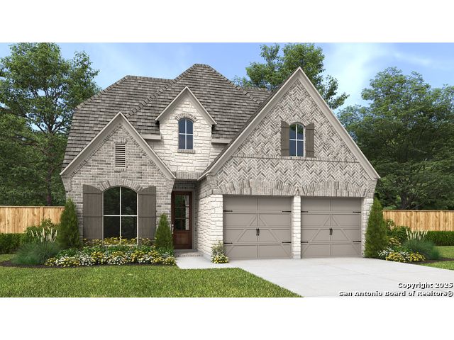 Home office with French doors set at two-story entry. Dining area opens to kitchen and adjacent two-story family room. Kitchen features walk-in pantry, 5-burner gas cooktop and generous island with built-in seating space. Family room features wall of windows. First-floor primary suite includes primary bath with dual vanity, garden tub, separate glass-enclosed shower and two walk-in closets. An additional bedroom is downstairs. A game room and two secondary bedrooms are upstairs. Covered backyard patio and 5-zone sprinkler system. Mud room off two-car garage.