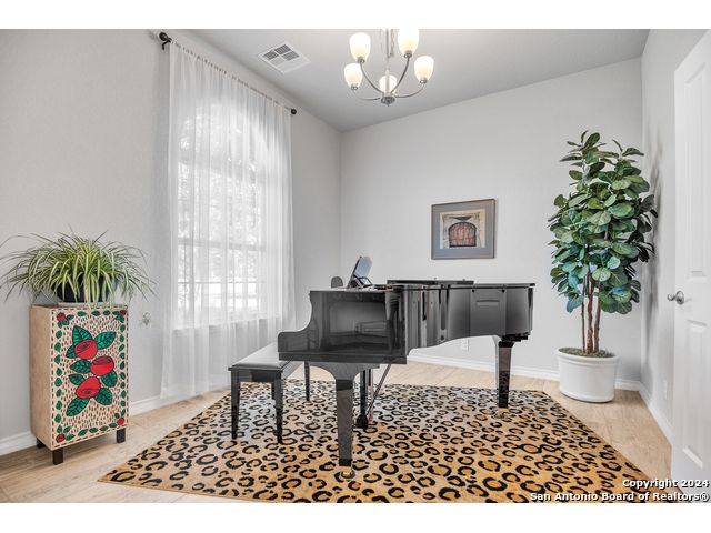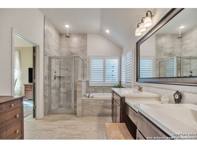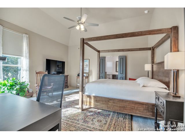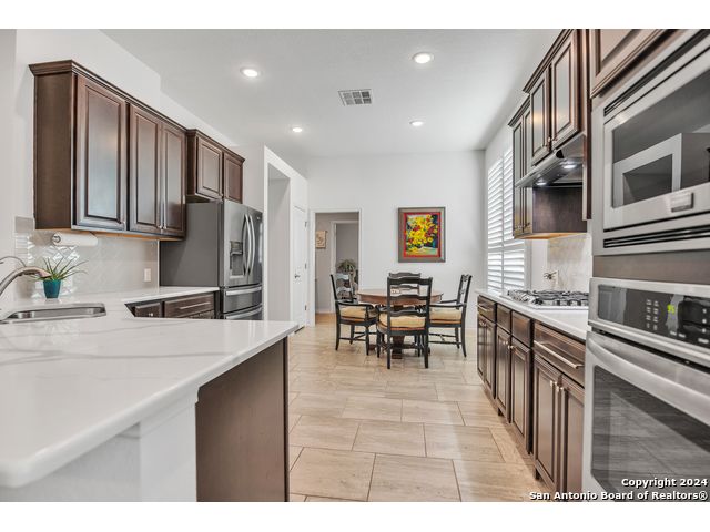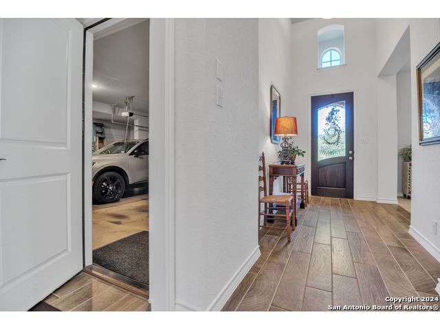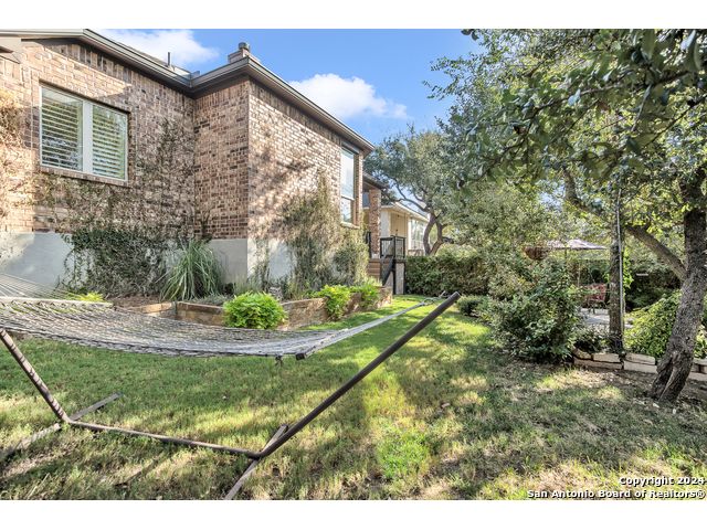 Beautiful one story, 4 sided brick Highland home offers 3 bedrooms, 2 bathrooms, dining room, study and 2.5 car garage. Open concept floor plan with large windows/custom shutters, tile flooring throughout. The spacious gourmet kitchen has stunning quart countertops, 42" cabinets and eat-in area. A butlers pantry/bar connects the kitchen to the formal dining room. The large primary suite has high ceilings and luxurious bathroom with garden tub, waterfall shower, double vanity and huge walk-in closet. The porch and lovely patio overlooks the private backyard and wooded greenbelt that will never have any back neighbors. Water softener and reverse osmosis, sprinkle system and mature trees. Prime location minutes from Guadalupe State Park and convenient to The Rim, Stone Oak shopping and schools.