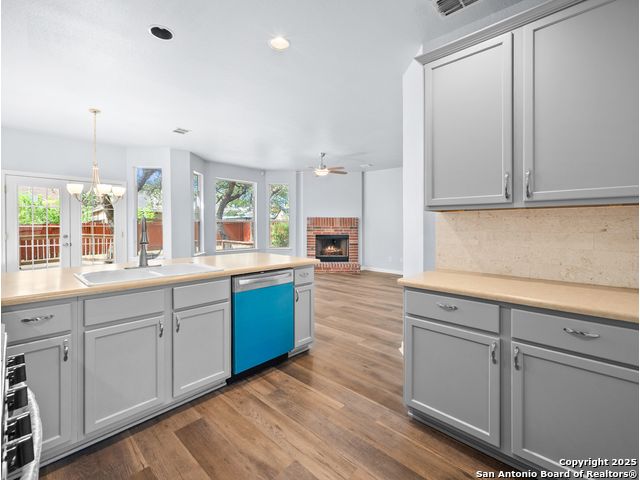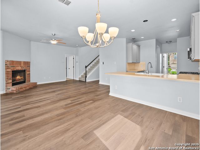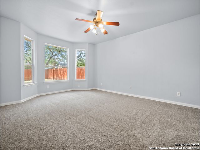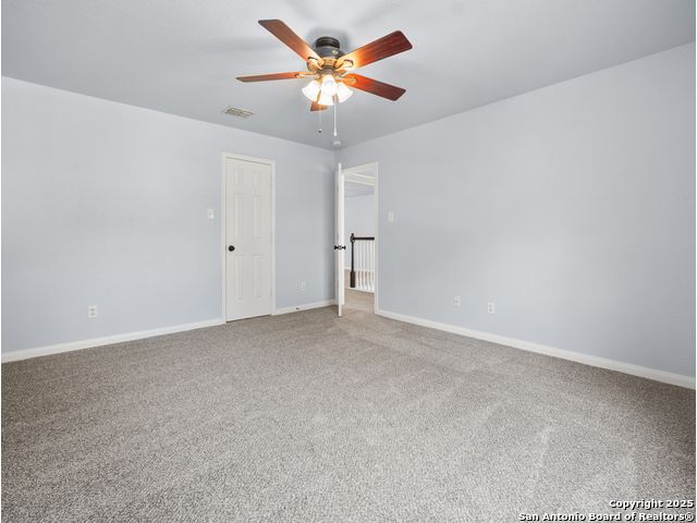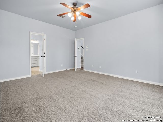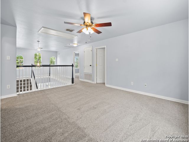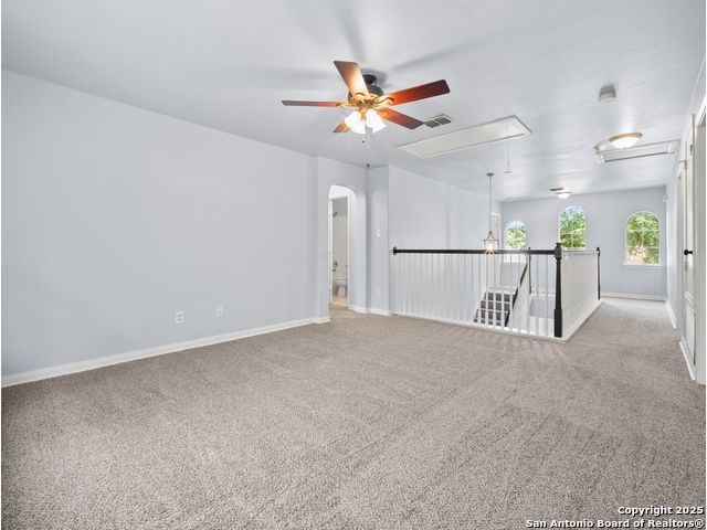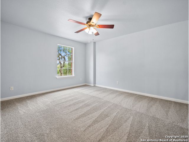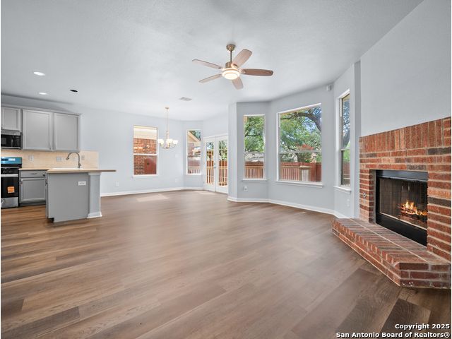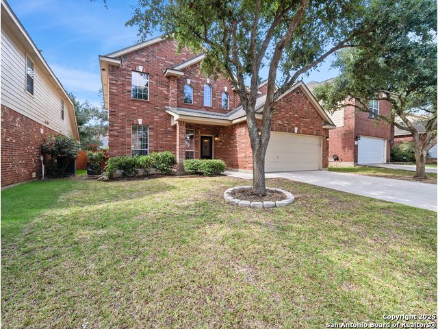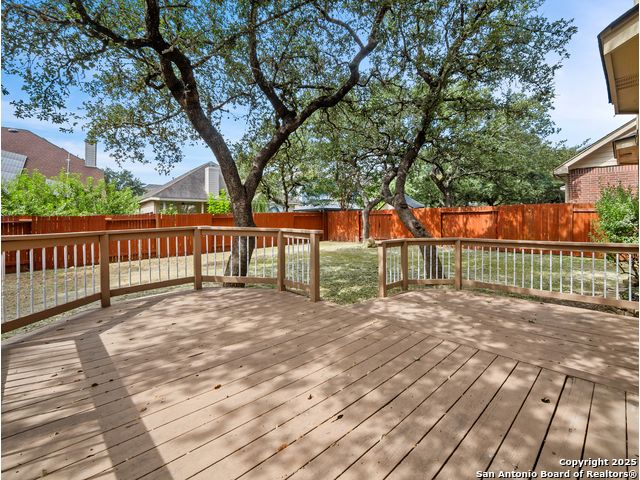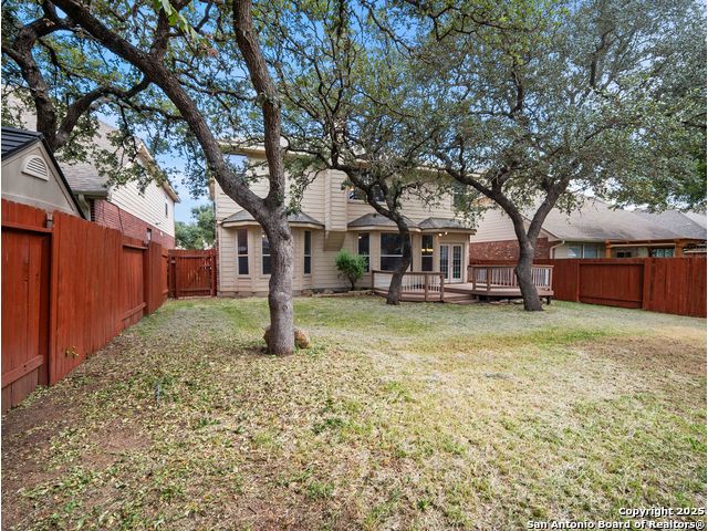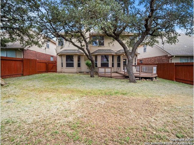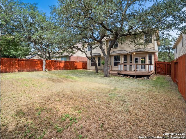 Welcome home to the prestigious and peaceful North 281 Corridor! This controlled access Canyon Springs Cove 5-Bedroom home has multiple living areas, great natural light, beautiful outdoor spaces and bedrooms for everyone! Downstairs you'll find an open concept kitchen and living room with fireplace, with a great kitchen bar and dining table. Kitchen recently had granite counter tops installed. A flex room for dining/office, whatever you need is located directly off the entry giving you multiple options for living on the ground floor. New vinyl plank flooring and new carpet in the bedrooms. Also featured - a desirable first floor primary suite with luxurious ensuite bath and large walk-in closet. Still more room to get away can be found upstairs with a spacious loft and four large bedrooms with walk-in closets. This home sits on the interior of the Canyon Springs Cove loop - the peaceful interior lot has mature trees and a large deck and backyard. Great location with a number of dining and shopping establishments just a block or two away. Total convenience. Home is located in the prestigious Smithson Valley School district and zoned to brand new Pieper High School. This is a great family home!