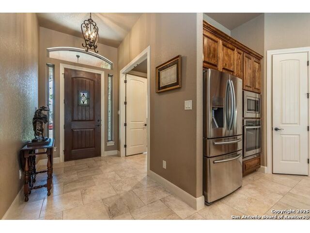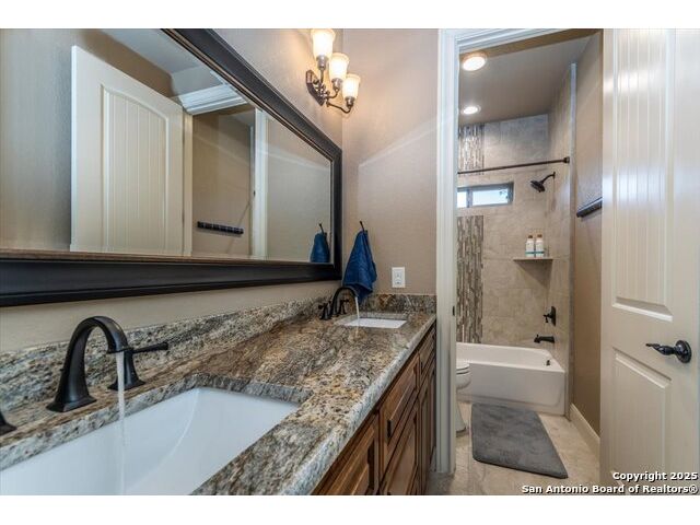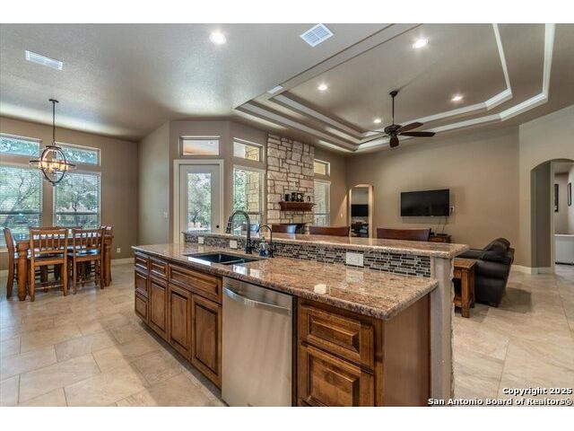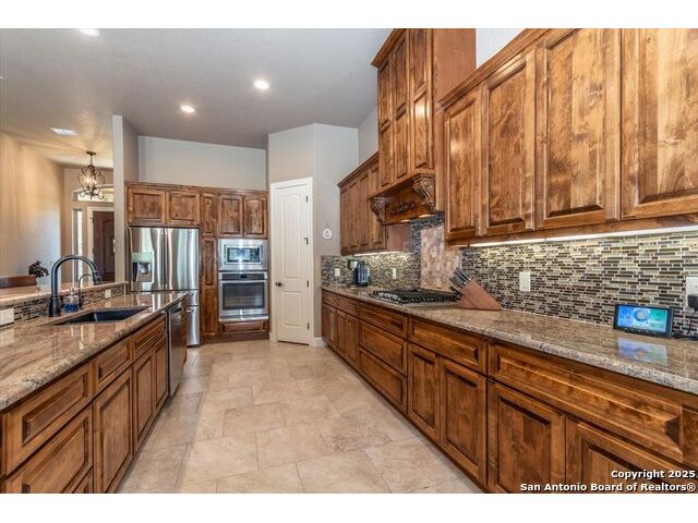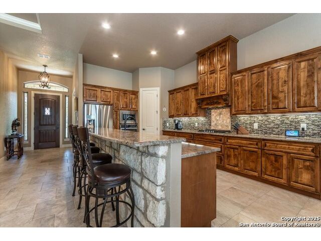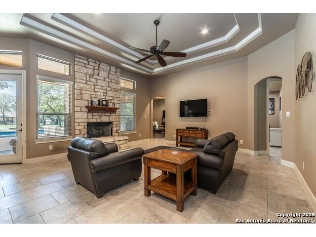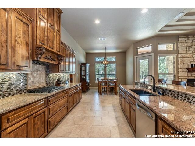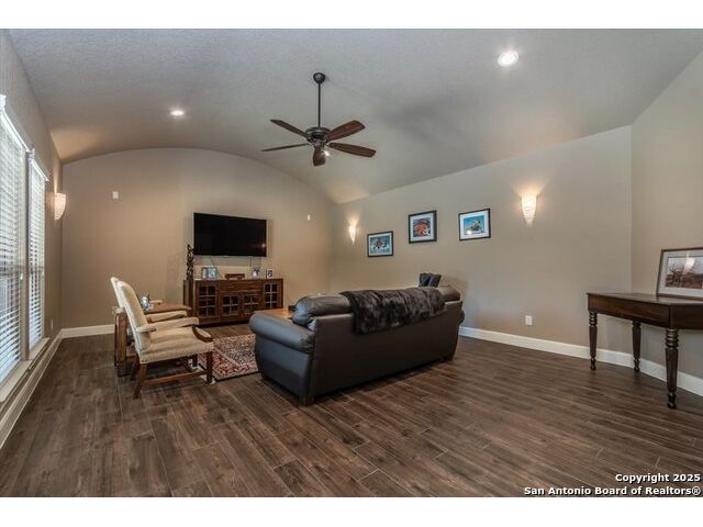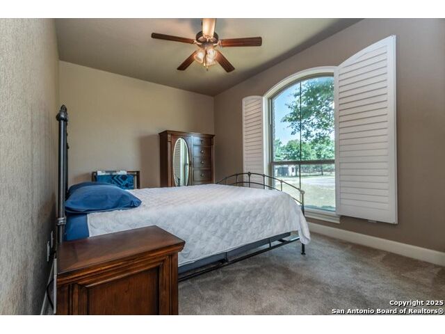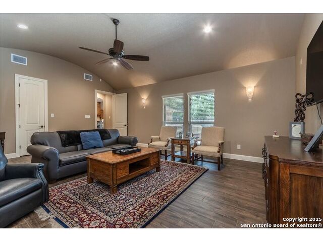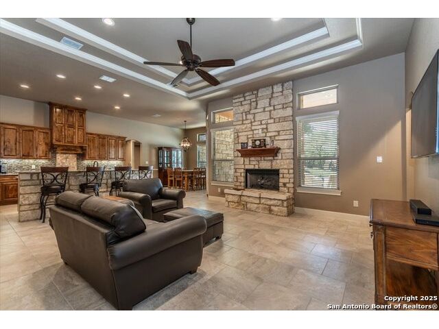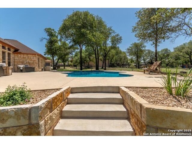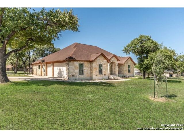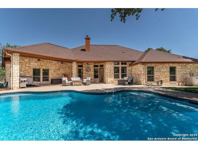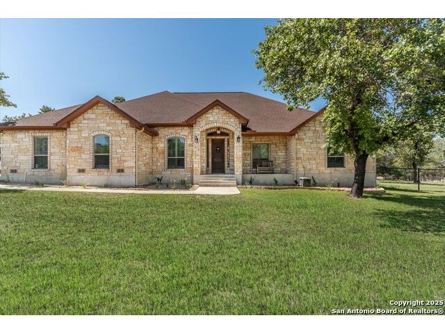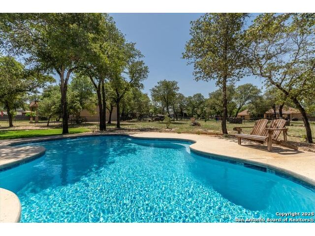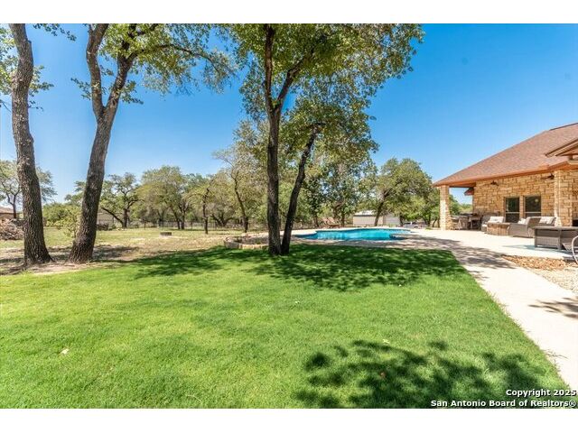Enjoy the country life but also enjoy being convenient to San Antonio and LaVernia areas. This home is on a quiet culdesac lot and has been carefully cared for. It has 4 bedrooms, a separate study and a media/gameroom too (all on one level).. It is perfectly suited for a pool table. The kitchen, eating areas are open to high ceilings of the family room with a floor to ceiling rock fireplace with gas logs. The primary suite is separated from the other bedrooms. Walk out to spacious covered patio where you will be welcomed by your beautiful pool and spacious yard. A place to enjoy the stars at night.