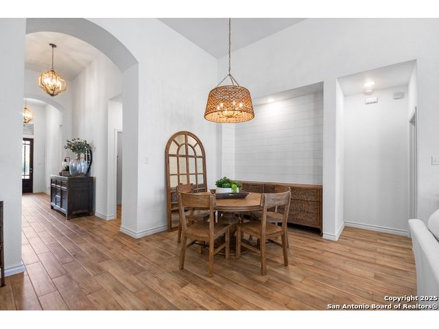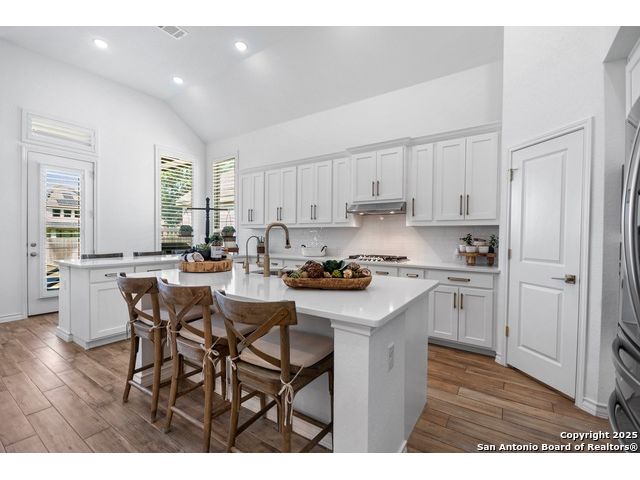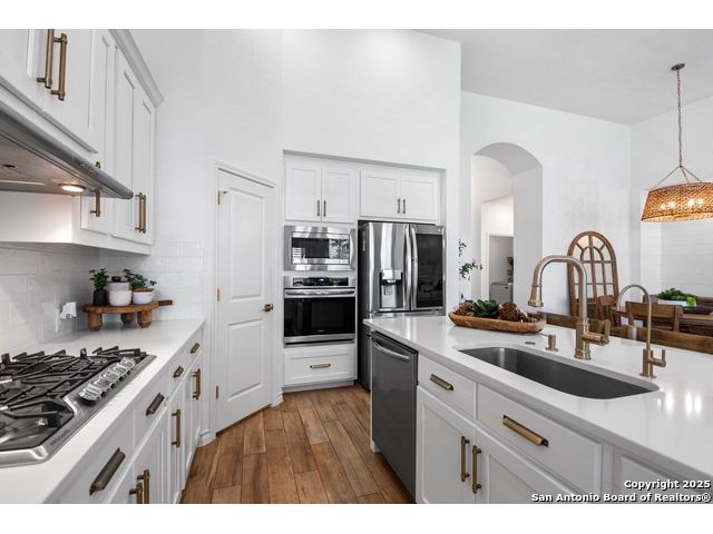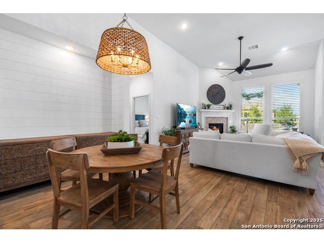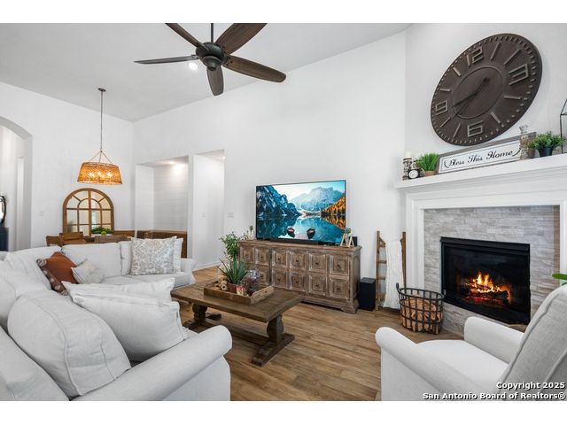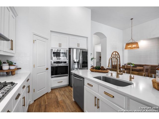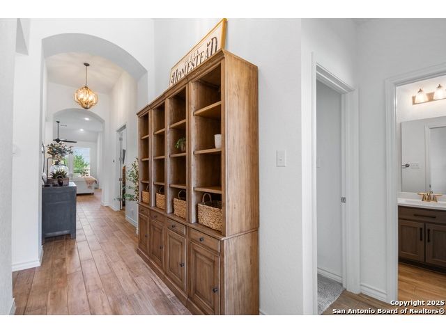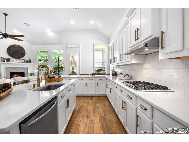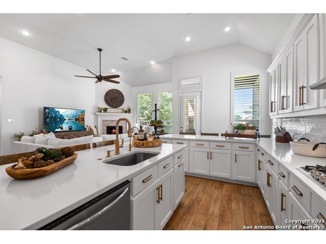 Styled like a Pottery Barn magazine, this one-story residence in the gated Ranches at Creekside is 2,248 sq ft, with four bedrooms and three full bathrooms, and a dedicated office. Light wood look tile floors, crisp white cabinetry with brass hardware, plantation shutters, and new lighting fixtures make this house a home. The kitchen's clever layout offers an L-shaped island plus a second island for double the seating. So many upgrades, you'll have to see in person! A few are year-round lighting, a RO system, and a water softener. The very flat backyard is perfectly suited for a future pool. Located in Boerne ISD and just minutes from Main Street and La Cantera, the Ranches at Creekside does not have a MUD tax. *Buyer to pay a one-time $500 working capital fee at closing.