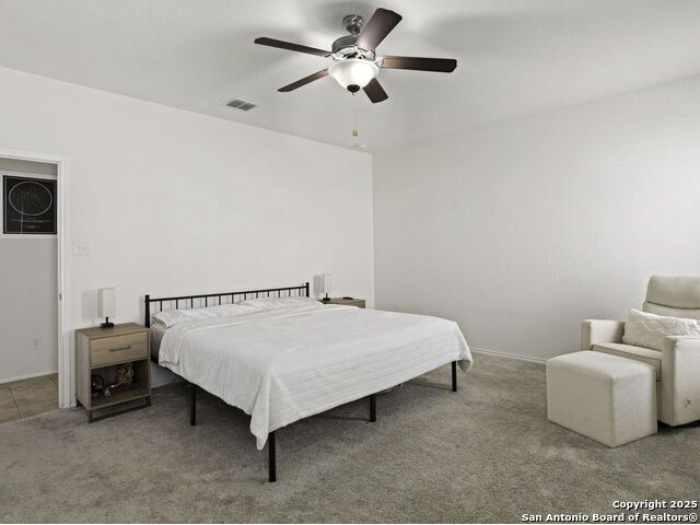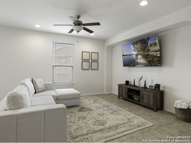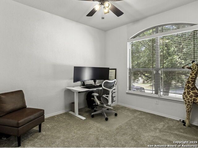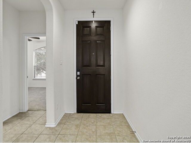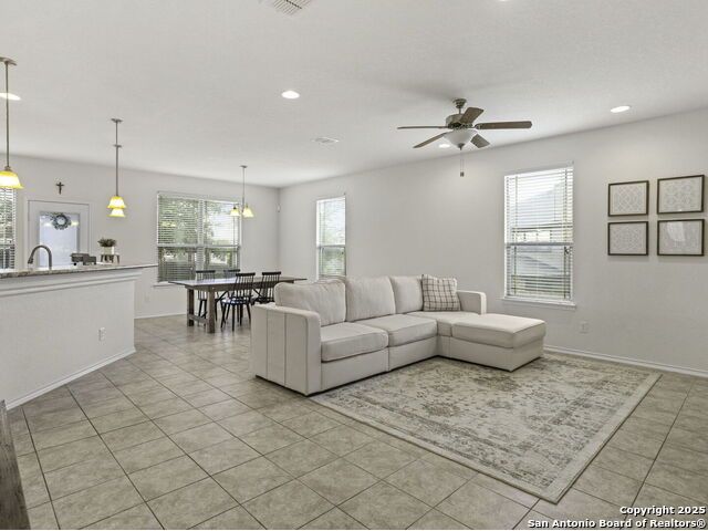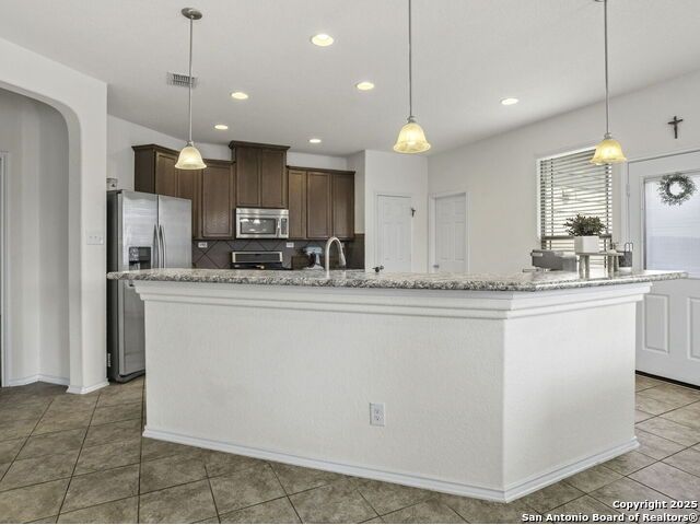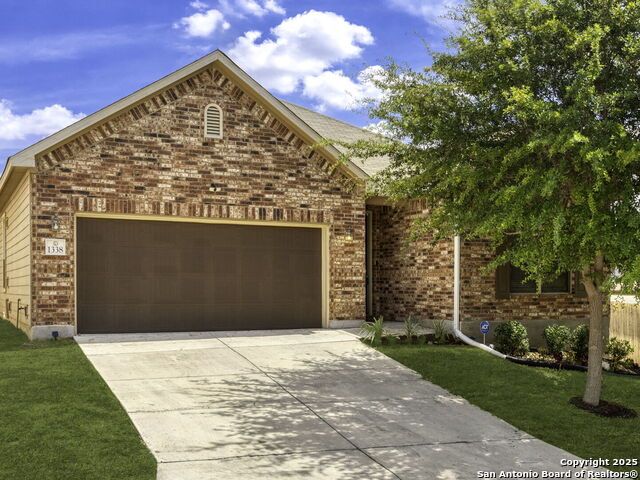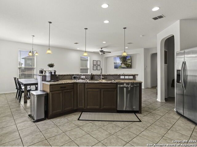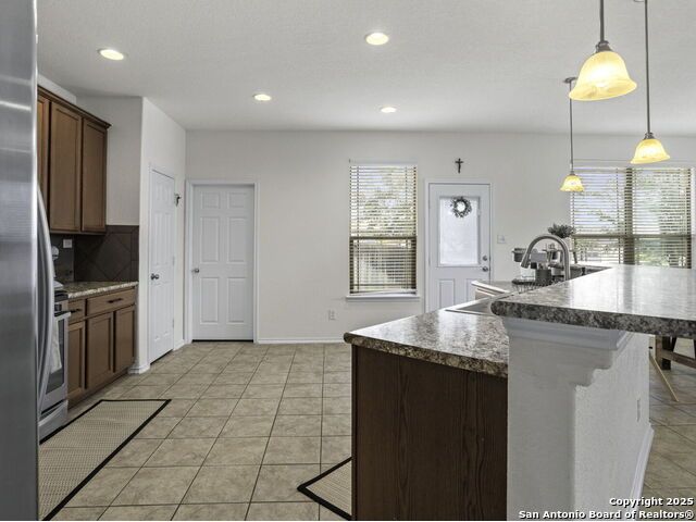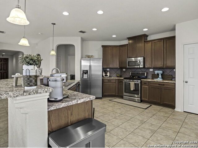 This wonderfully cared for 3-bedroom, 2-bathroom home is your dream come true! Immaculate and thoughtfully designed, this one-story residence features an open concept living and dining area that flows seamlessly into the kitchen with walk in pantry. A striking mahogany-stained entry door sets the tone, while 9-ft. ceilings and rounded corners add style and character throughout. The kitchen is a true centerpiece, offering 42-in. upper cabinets with crown molding, bar-style seating, stainless steel appliances, and ample cabinet space. Inside, discover a bright interior with neutral tile floors and plush carpet in all the right places. The luxurious primary suite boasts a spacious walk-in closet and an en-suite bath for your comfort and retreat. Energy-efficient solar panels help lower monthly electric bills, while gutters add to the home's polished, well-maintained appeal. Step outside to enjoy a private backyard with lush grass keep that is maintained by sprinkler system in the front and back - the perfect spot to relax with your favorite drink. This must-see home blends style, comfort, and function in every detail!