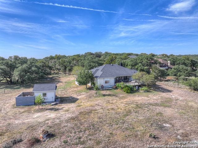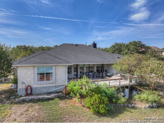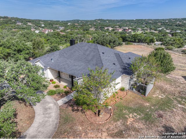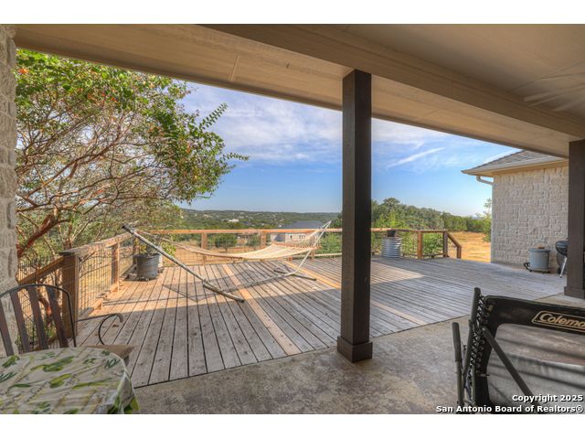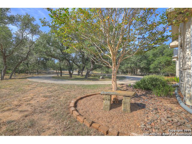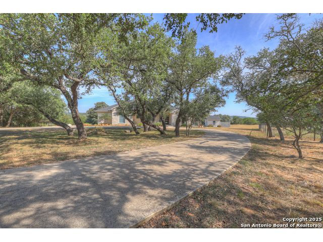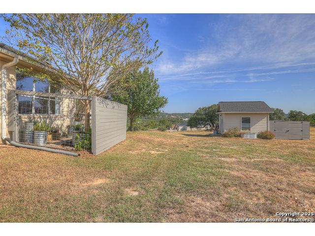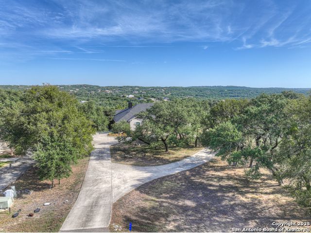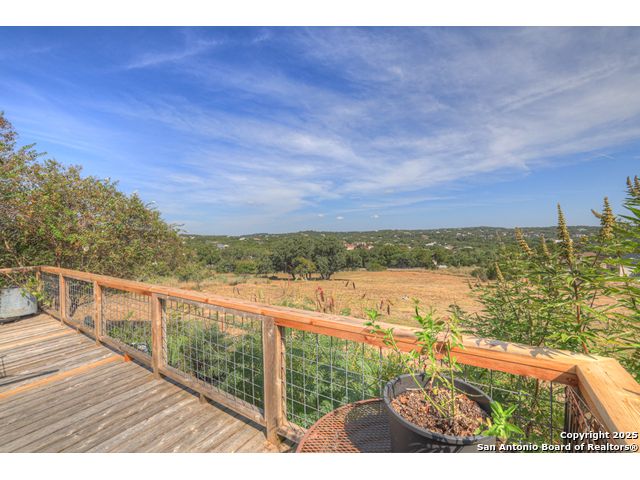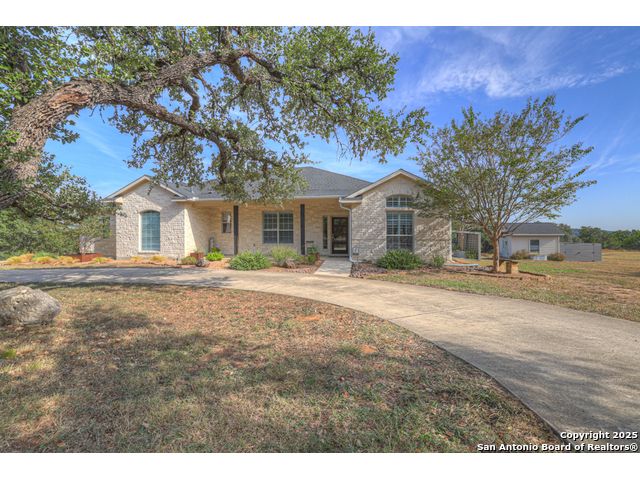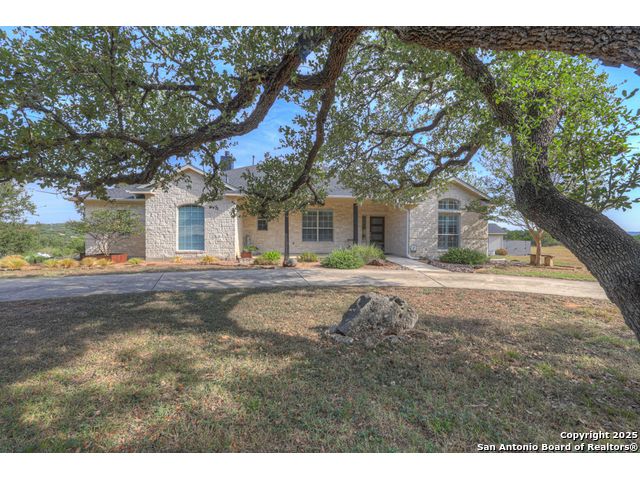 $20,000 OFFERED TO BUYERS FOR BUY DOWN/CLOSING COSTS ON THIS BEAUTIFUL SINGLE STORY HOME WITH SPECTACULAR VIEWS. Open floor plan features a rock fireplace with gas starter, and a wall of windows overlooking the deck, backyard and distant hills. The floor plan consists of 4 bedrooms PLUS a study with double French doors, formal dining room, breakfast room, and 3 full bathrooms. The spacious island kitchen has granite counter tops, gas cook top, built-in oven and microwave, and walk-in pantry. You will love the elegantly remodeled primary bathroom with a soaking tub and tiled shower. The laundry room features a sink, cabinets, and ample counter space for folding. All of the trim, shelves and crown molding and baseboards have been freshly painted. A storage building provides additional space for your lawn equipment and supplies. The cul-de-sac street is supremely quiet and private having just 3 homes. The adjacent lot to the rear is available for purchase with the house. River Chase amenities include 2 parks: a 58-acre park on the Guadalupe River with pavilion, hiking trails, camping grounds, and sports courts, plus the 32-acre clubhouse park with pools, fitness center, walking trails, tennis courts, disc golf, fishing pond, and Veteran's garden. Located just minutes from Historic Gruene, restaurants, retails shopping, music venues, theatres, and health care, and convenient to both Austin and San Antonio.