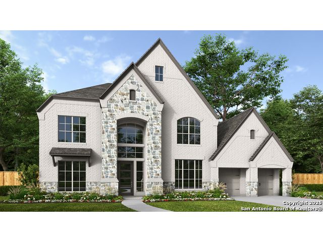 Home office with French doors and dining room frame the two-story entry. Two-story family room with wall of windows opens to kitchen and morning area. Kitchen features island with built-in seating space and Butler's pantry. Upstairs media room, game room, secondary bedrooms with a Hollywood bath. Downstairs guest suite with full bath and walk-in closet. Garden tub, separate shower and two walk-in closets in the primary suite. Additional staircase just off morning area. Covered backyard patio. Three-car garage.