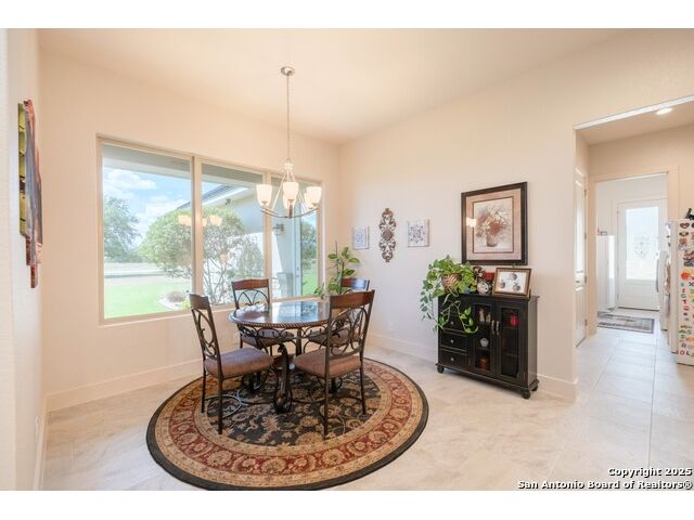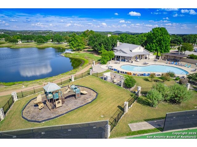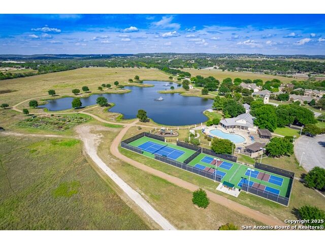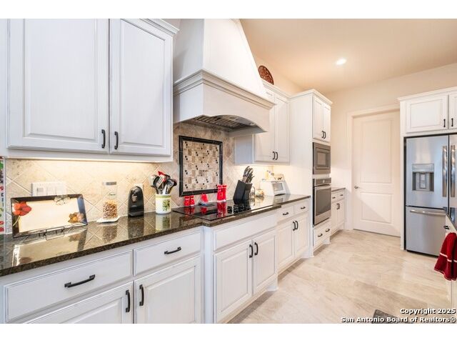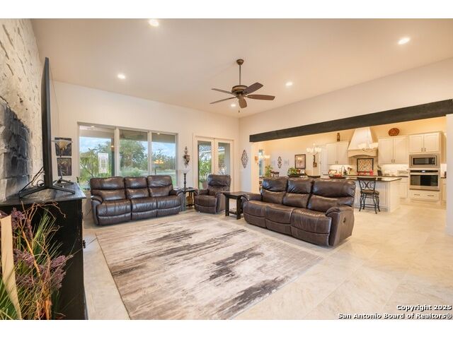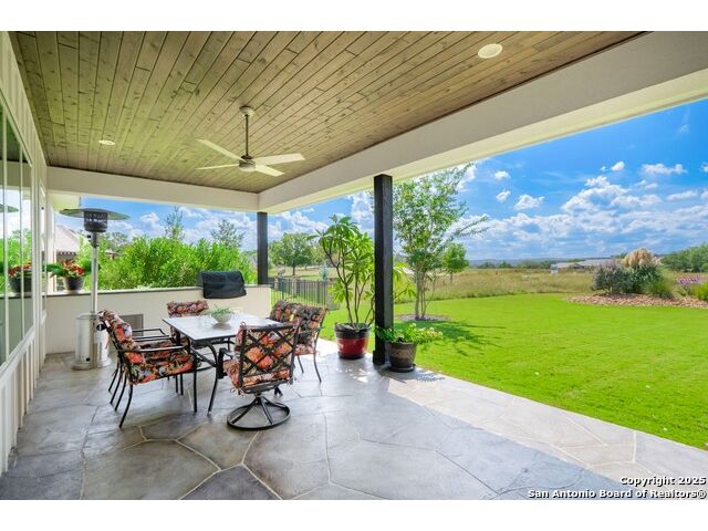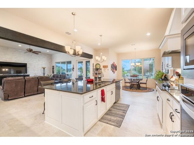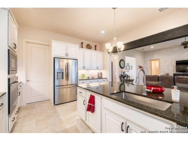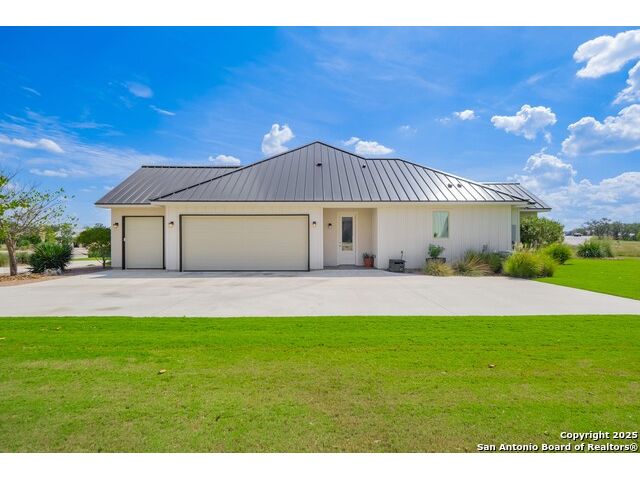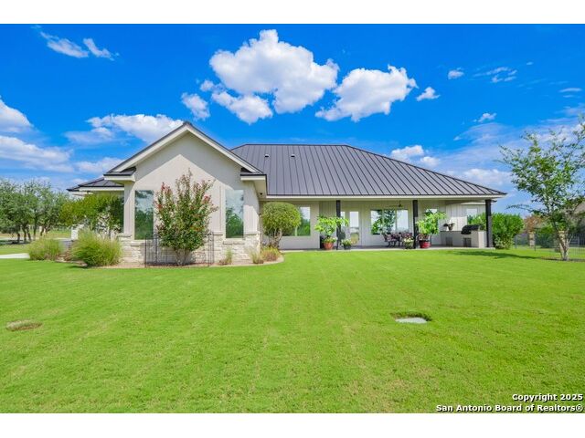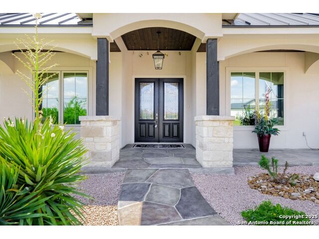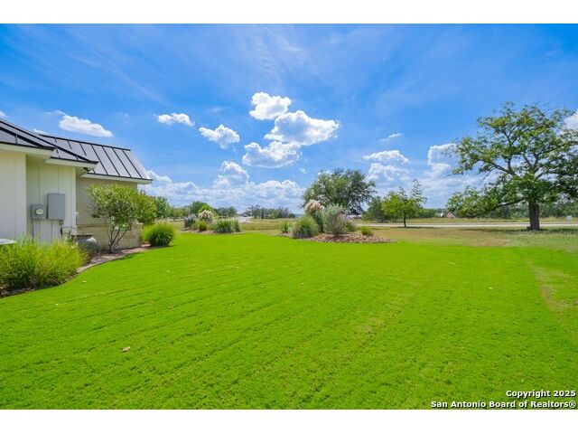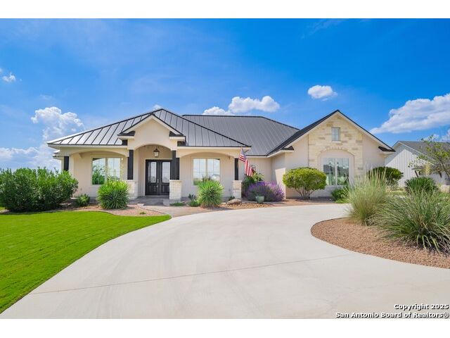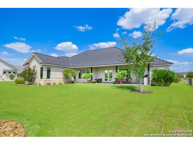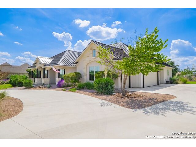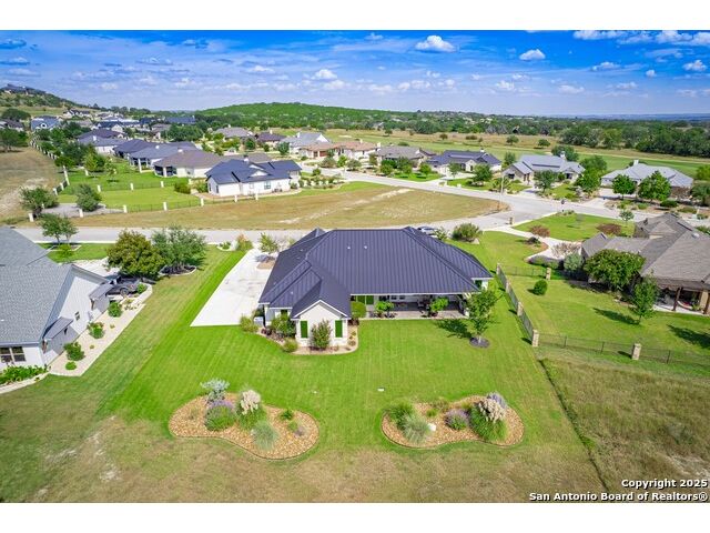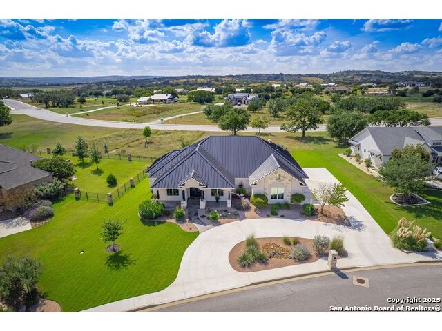 Experience Hill Country living at its finest in this stunning 3-bedroom, 2-bath custom home set on a spacious 0.57-acre lot in the prestigious Comanche Trace community. Built in 2020, this 2,689 sq. ft. single-story residence blends thoughtful design, modern comfort, and resort-style amenities in a highly sought-after golf cart community. Inside, the split floor plan offers privacy and functionality, with the primary suite tucked on one side and two secondary bedrooms on the other. Just off the foyer, a separate dining room offers an elegant space for gatherings. The spacious open-concept living area features a stone accent wall, wood beam detail, and large windows that fill the space with natural light. The kitchen is designed for both style and function, showcasing granite countertops, stainless steel appliances, abundant cabinetry, a walk-in pantry, and a large center island with breakfast bar seating. The primary suite is a retreat of its own, highlighted by a striking stone accent wall and an ensuite bath with dual vanities, a walk-in shower, and generous storage. The home also includes a 2-car side-entry garage plus a golf cart bay, providing both storage and convenience. The home emphasizes outdoor living with a spacious back porch that serves as an extension of the living space. Complete with a grill, its ideal for entertaining or simply relaxing while enjoying Hill Country views. Additional upgrades include a durable metal roof, ceramic tile flooring throughout (no carpet), tinted windows with remote shades, and motorized bedroom shades that will remain with the home. Living in Comanche Trace means more than just owning a beautiful home, it's about embracing a lifestyle. Residents enjoy 27 holes of championship golf, a country club with restaurants, pool and kids water park, pickleball courts, hiking trails, frequent community events, and Guadalupe River access. The community also offers excellent accessibility, just minutes from Tivy High School and Antler Stadium. This property combines elegance, functionality, and an unmatched community atmosphere, an exceptional place to call home.