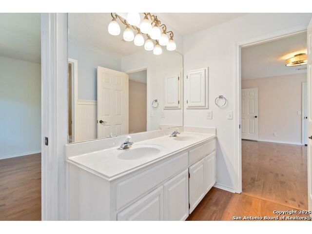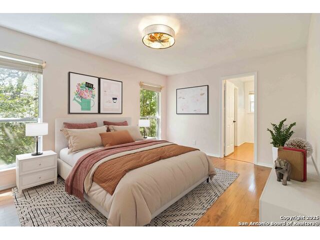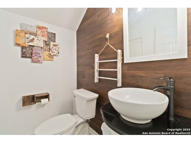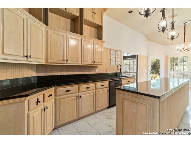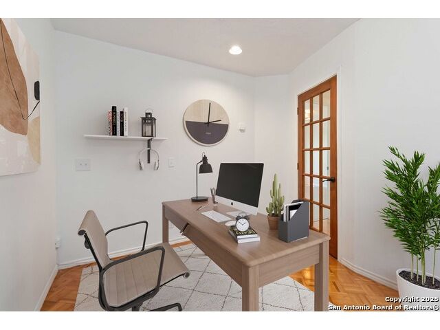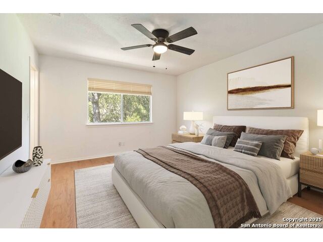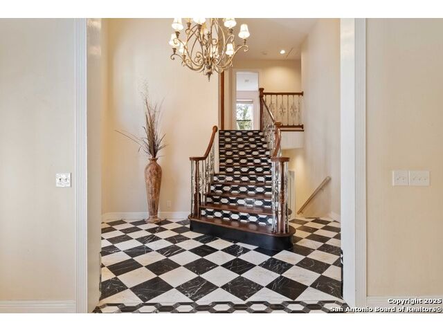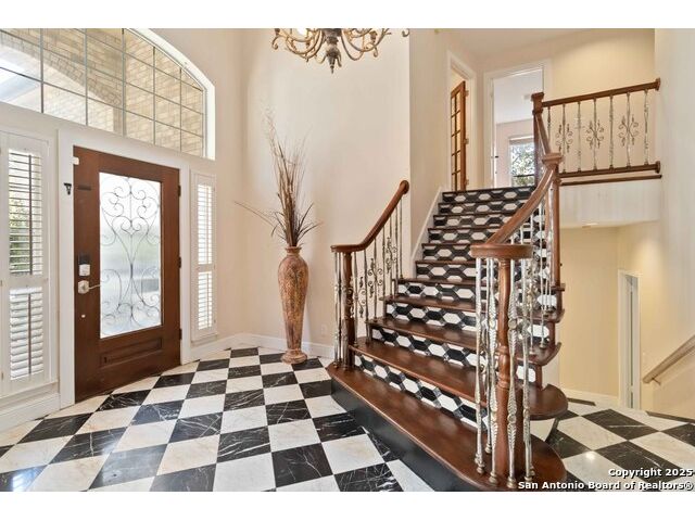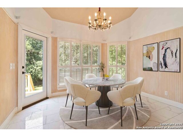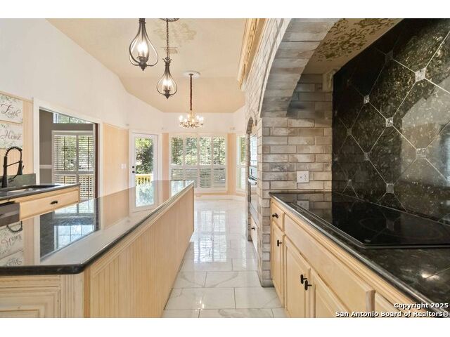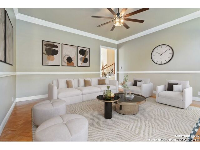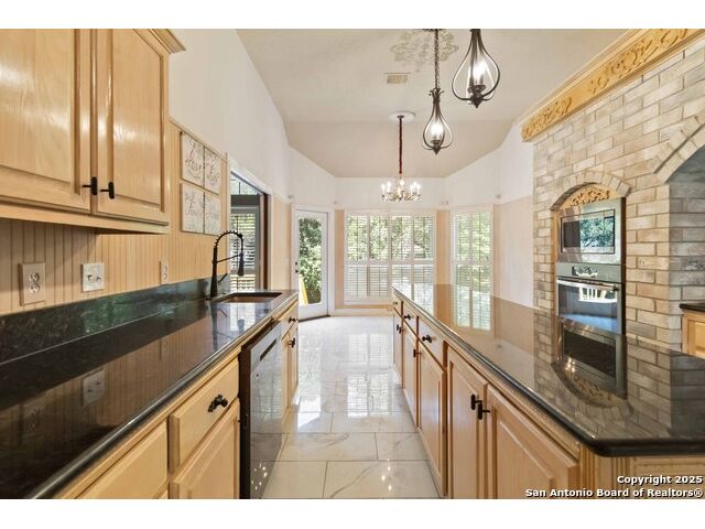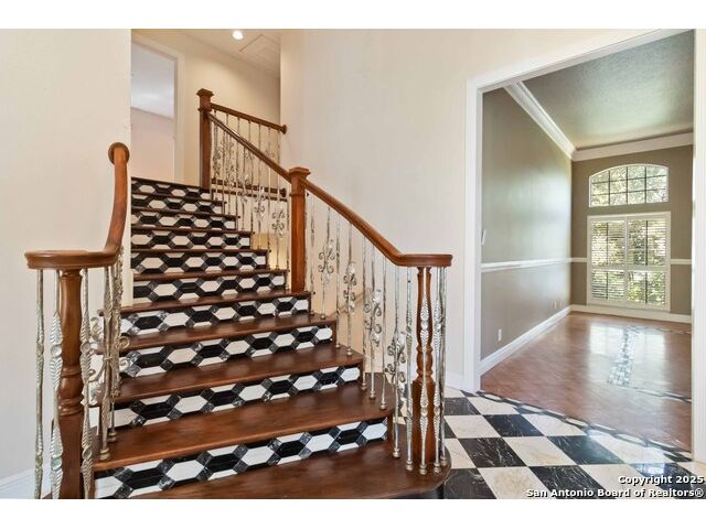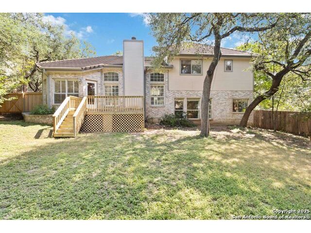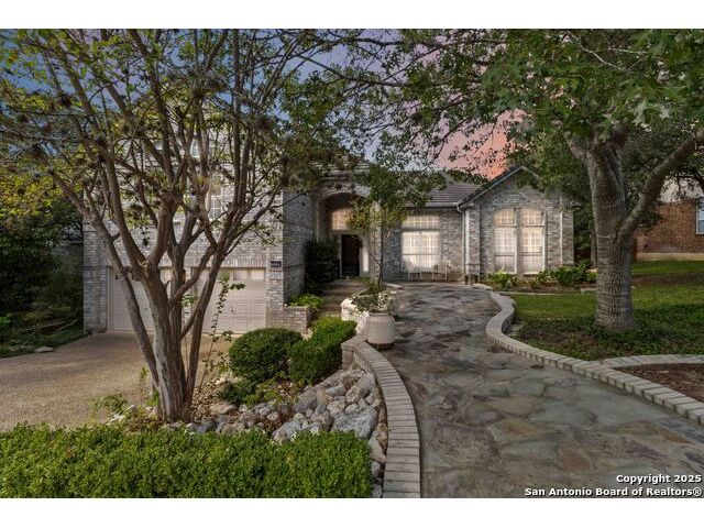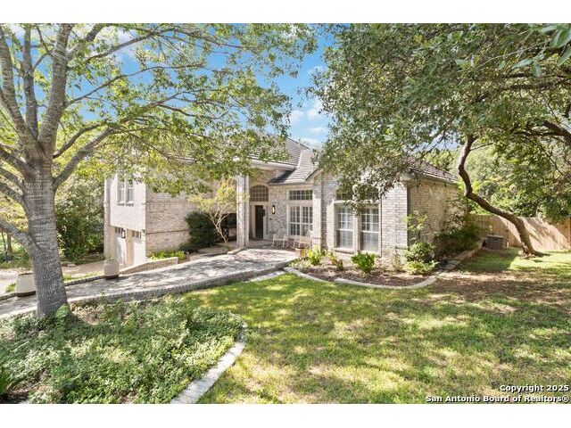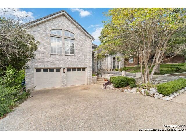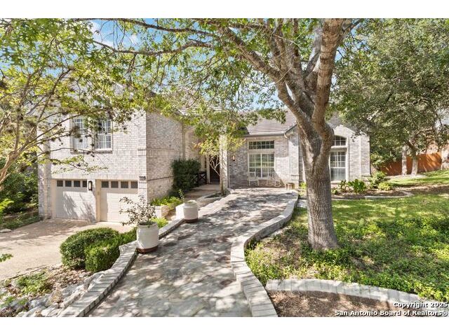 Tucked away behind the gates of the exclusive, guard-gated Mission Ridge community, this custom Sitterle home with 3147 sf, 4 bedrooms, 3.5 bath, offers privacy, charm, and timeless style. With mature trees and lush landscaping framing every window, you'll enjoy a serene, green view from every room. Designed with both elegance and comfort in mind, this spacious home features an abundance of natural light, classic upgraded finishes, and plantation shutters throughout. The thoughtfully designed floor plan includes zero-step entry for convenience and accessibility. The main level starts with the classic checkerboard tiled entry with lovely winding half staircase leading to the guest rooms. To the right relax in the formal living and dining anchored by custom parquet wood flooring accented with checkerboard edges perfectly bringing the entry and formal areas together. The large family room features a floor to ceiling fireplace for cozy evenings at home and sight lines to the sunlit breakfast nook. The chef's kitchen with a center island, induction cooktop, and ample counter space-is perfect for everyday living and entertaining alike. Just a half-flight down, you'll find the private primary suite and garage, providing a peaceful retreat without sacrificing accessibility. Up the stately half staircase off the entry , discover the secondary bedrooms connected by a Jack-and-Jill bath, a dedicated office, and a generously sized 4th bedroom/secondary primary with its own en suite bath. The 4th bedroom would make a great bunk room or flexible enough to be a game room or prewired media room. Outside, the front yard has been professionally xeriscaped for low-maintenance beauty, while the backyard is a quiet, tree-lined haven offering both privacy and potential, with a grassy area ready for your personal touch-be it a garden, pool, or play space. Recent upgrades include a HVAC system, dishwasher, garage doors (securing the extra deep 2 car garage), and lighting fixtures-all within the past few years-adding peace of mind to this already exceptional home. All of this in a prime location just minutes from 281 and 1604, with a convenient 20-minute commute to downtown San Antonio. Don't miss your opportunity to live in one of the city's most sought-after neighborhoods-this home truly has it all.