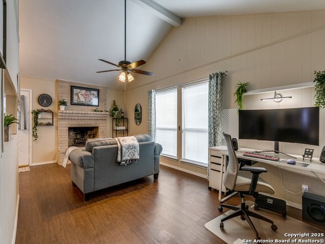 Welcome to this charming three bedroom home tucked away in a quiet neighborhood, just minutes from major highways for easy commuting. Step inside to find spacious living areas filled with natural light, soaring vaulted ceilings, and sleek hard flooring throughout. The kitchen is equipped with granite countertops, offering both style and function. The primary bedroom features sliding glass doors that open to a shaded backyard, complete with a covered porch and a handy shed. Perfect for relaxing or entertaining outdoors. With its thoughtful layout, bright open spaces, and desirable location, this home truly has it all!