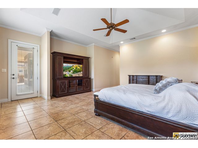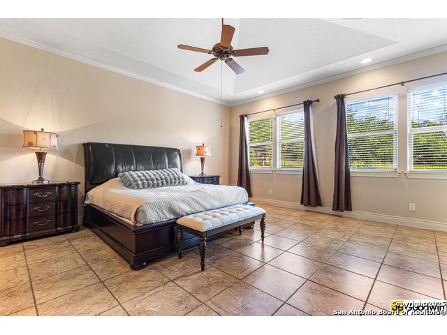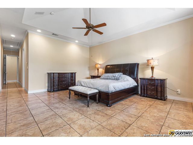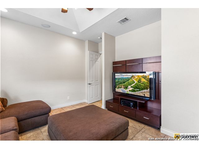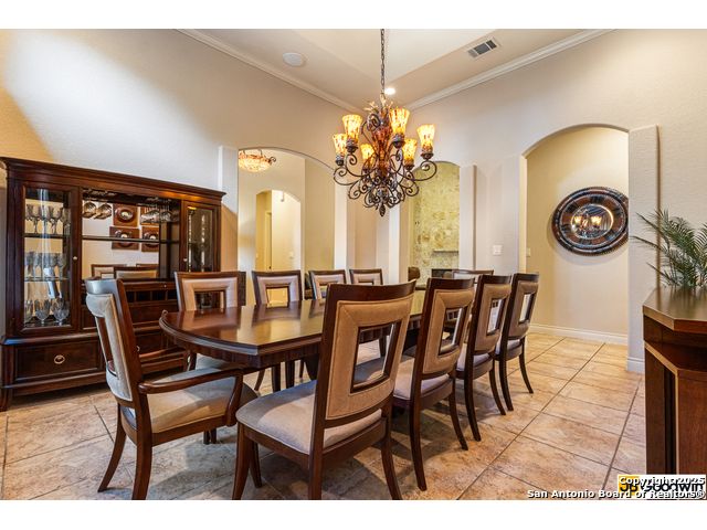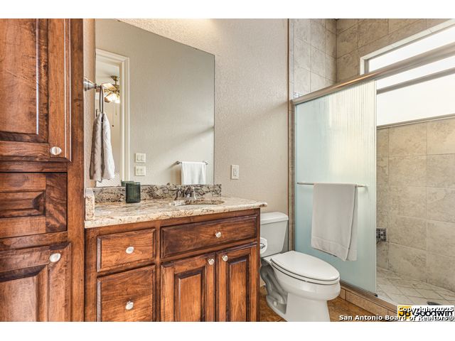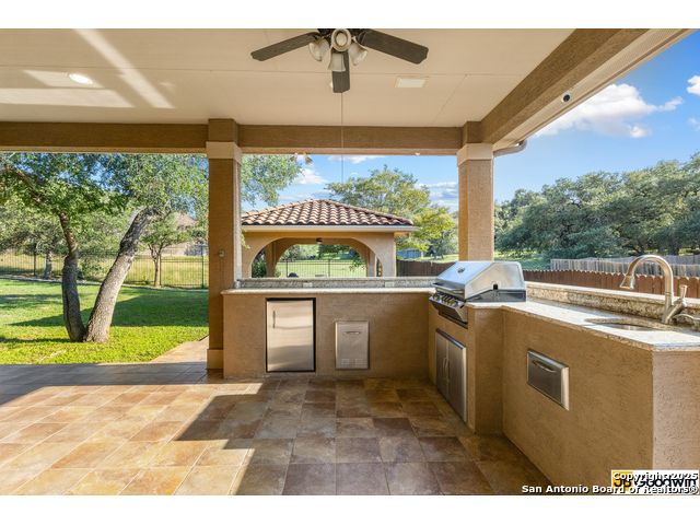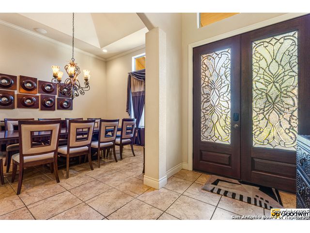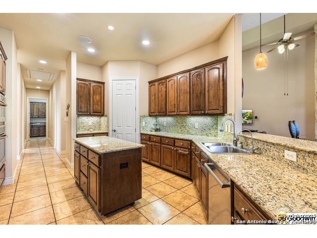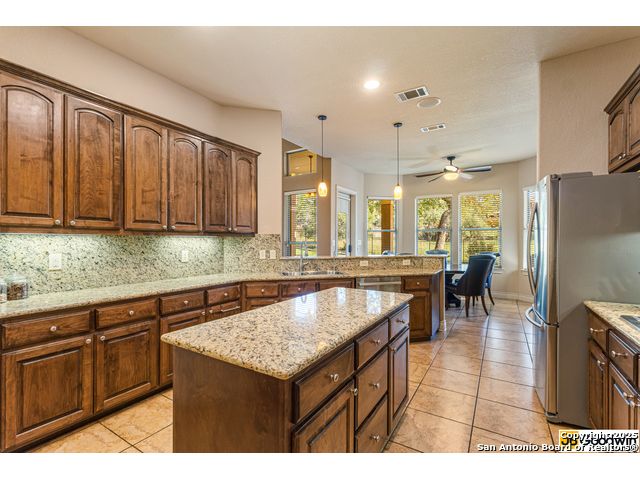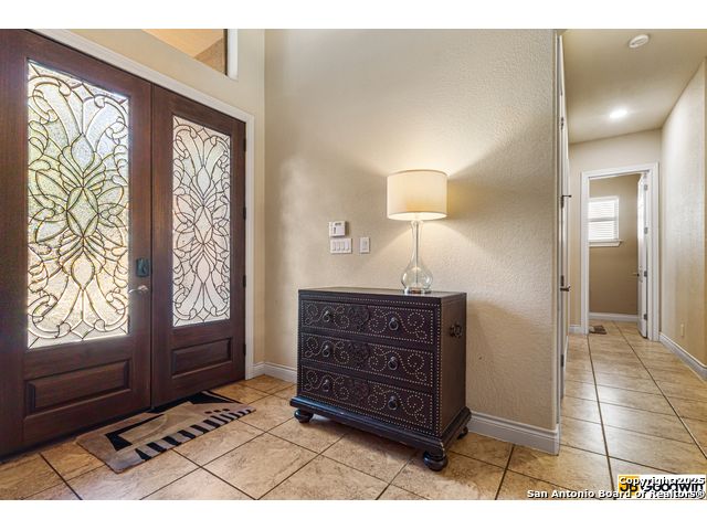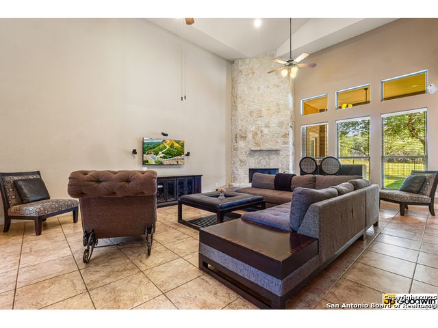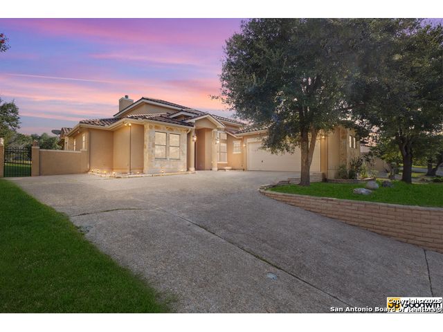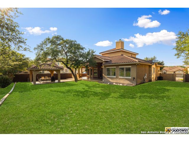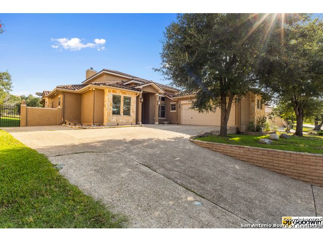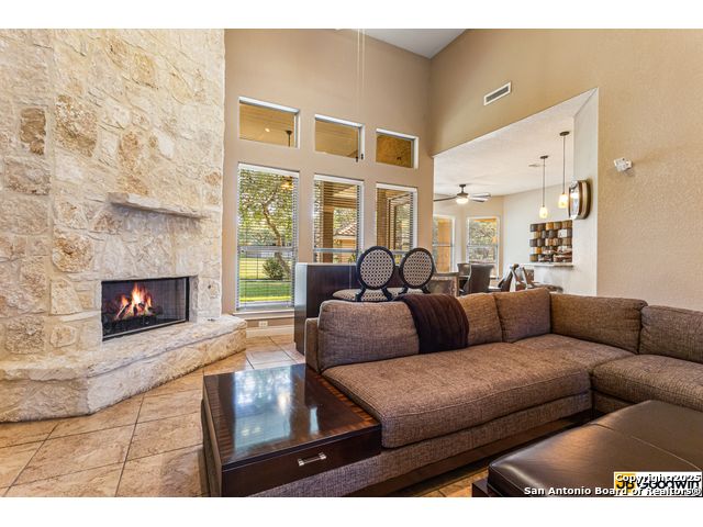 Elegant single-story custom Mallorca plan on a .29-acre greenbelt lot in gated Estancia within the Heights at Stone Oak. This 3,008 sq ft home offers 3 bedrooms each with private bath, a study, and half bath. Soaring 10-ft ceilings, rounded corners, and designer tile throughout create a timeless backdrop. The great room features a floor-to-ceiling stone fireplace and walls of windows. A chef's kitchen boasts granite counters, gas cooktop, pot filler, large island, custom oak cabinetry with crown molding, and a walk-in pantry. The private owner's suite includes patio access, dual vanities, jetted tub, frameless shower, and spacious walk-in closet. Upgrades include hard-maple cabinets, extended covered patio, patio/gazebo with dedicated connection for a future hot tub, granite backsplashes, upgraded plumbing/lighting, reverse-osmosis water system, and sound system wiring. Energy-efficient features include dual HVAC, low-E windows, PEX plumbing, and an oversized garage. Neighborhood amenities: guarded gate, security patrol, Olympic-style pool, tennis & basketball courts, sand volleyball, and NEISD schools.