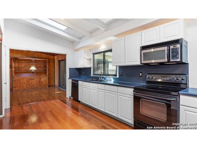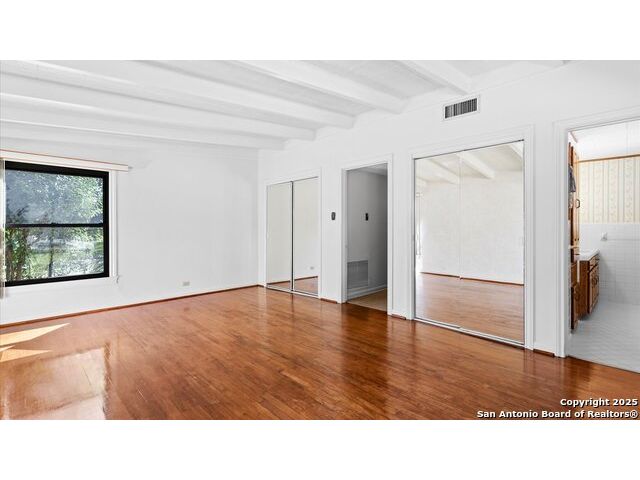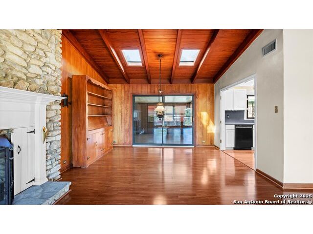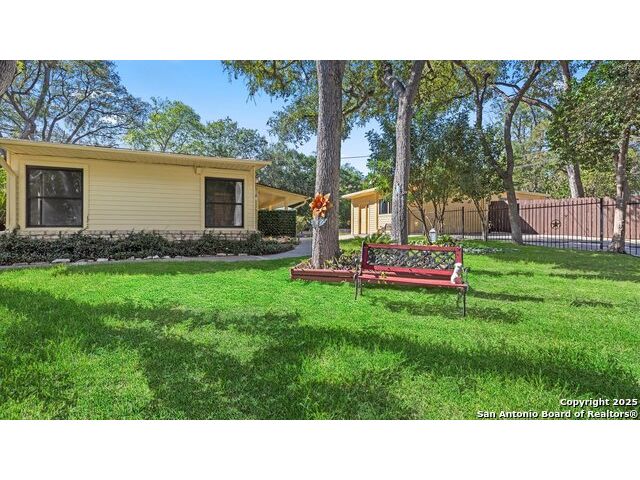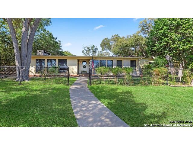 Vintage charm meets modern comfort in this beautiful one-story ranch-style home located in the highly desirable Terrell Hills area. Resting on a picturesque park-like corner lot of over one-third acre, this property is surrounded by mature trees, lush landscaping, and multiple outdoor spaces perfect for entertaining or relaxing by the custom-designed pool. Step inside to discover an inviting open-concept living, dining, and kitchen area that feels both spacious and warm. The main living room features a striking floor-to-ceiling stone gas fireplace, a vaulted wood-lined ceiling with exposed beams, and three large picture windows that fill the space with natural light. Skylights in the dining area enhance the bright and airy atmosphere, while a side nook offers a convenient spot for a home office. A bonus room off the dining area adds flexibility. Ideal for use as a sunroom, game room, craft space, or cozy second living area. Throughout the home, wood, laminate and tile flooring and vaulted ceilings with exposed beams blend timeless style with practical comfort - and there's no carpet in the house. The primary suite includes private backyard access, a spacious ensuite bath with both a tub and separate shower, and generous natural light. The secondary bedrooms are equally inviting, featuring vaulted ceilings and multiple windows. Both bathrooms retain their original vintage character, maintaining the home's nostalgic appeal. Outdoors, you'll find several seating areas to enjoy the shade and scenery, along with a detached two-car garage and a charming casita complete with kitchenette, full bath, and its own private outdoor area, perfect for guests or a studio space. Additional highlights include a metal roof, newer HVAC system (10-year warranty, which includes twice a year service Maintenance, 10 years parts & labor), gutter system, cedar closet with double doors, separate storage area and a utility area with sink behind the garage that can easily be relocated to the main home if desired. Located in the coveted Terrell Hills community, this home enjoys access to its own dedicated police department, located less than two miles away, and a shared fire department with Alamo Heights. You'll love the convenient location, just one mile to several shopping centers including H-E-B, Walmart, Lowe's, and Target, and only a quarter-mile to numerous restaurants. It's also minutes from major freeways, close to Ft. Sam Houston, and just a few blocks from Terrell Hills Kiddie Park. Nearby, enjoy bike and walking trails along the San Antonio Riverwalk, lined with cafes and entertainment, and the DoSeum (Children's Museum) across from Brackenridge Park, all just a short drive away. This home perfectly combines vintage charm, modern conveniences, and an unbeatable location, making it a rare find in one of San Antonio's sought-after neighborhoods.