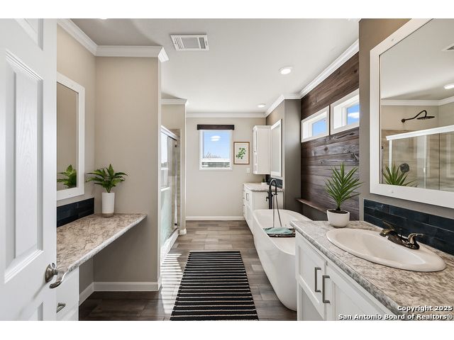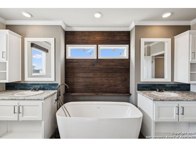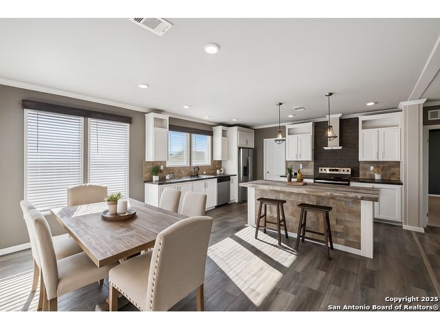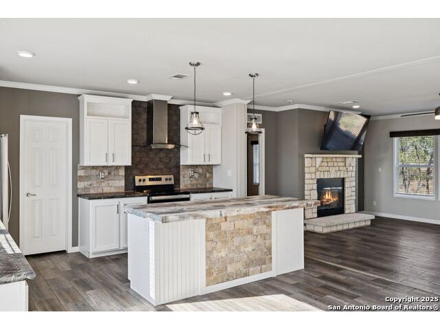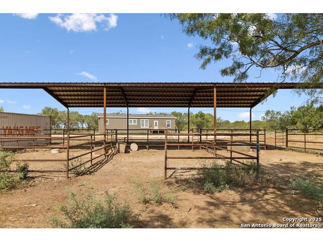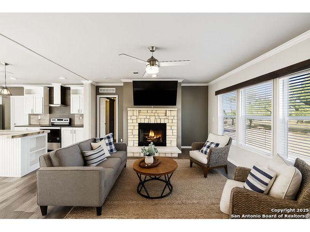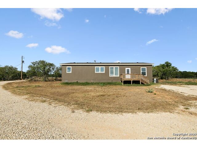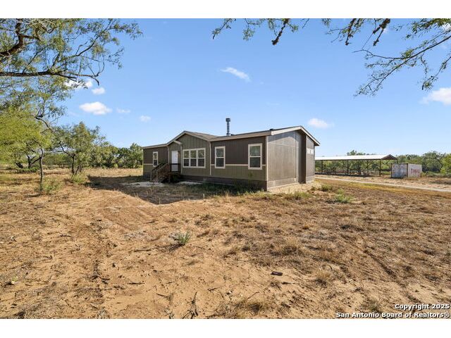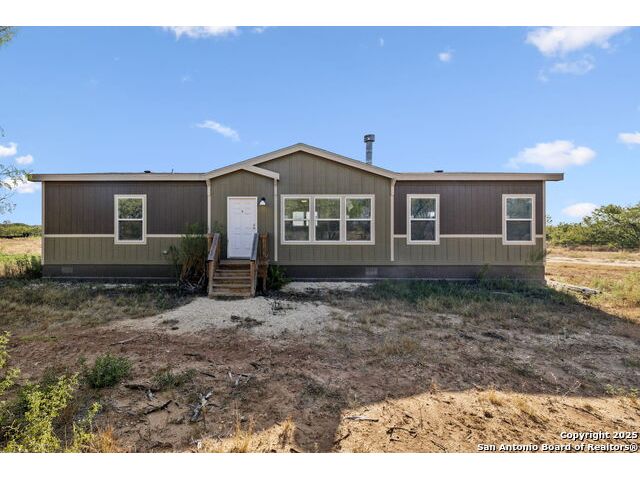 Beautifully set on 10.01 acres in Pleasanton, TX, this modern country chic 3-bedroom, 2-bath manufactured home blends style and comfort with wide-open spaces. Inside, the open-concept living area welcomes you with a cozy fireplace, while the kitchen shines with a center island, stainless steel appliances, pendant lighting, and recessed lighting. The primary suite features an accent wall, sliding barn door, and a spa-like bath complete with a garden tub, walk-in shower, and dual vanities. Two additional bedrooms and a full bath provide plenty of room for family or guests. Outside, enjoy mature trees, a covered horse stall, and a peaceful pond-perfect for country living. All just under an hour from downtown San Antonio.