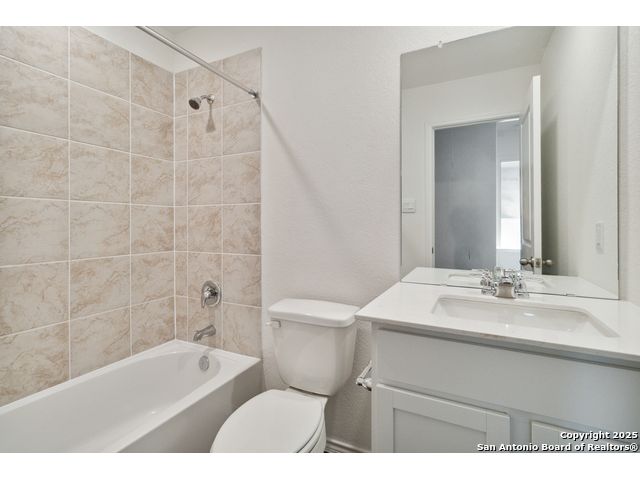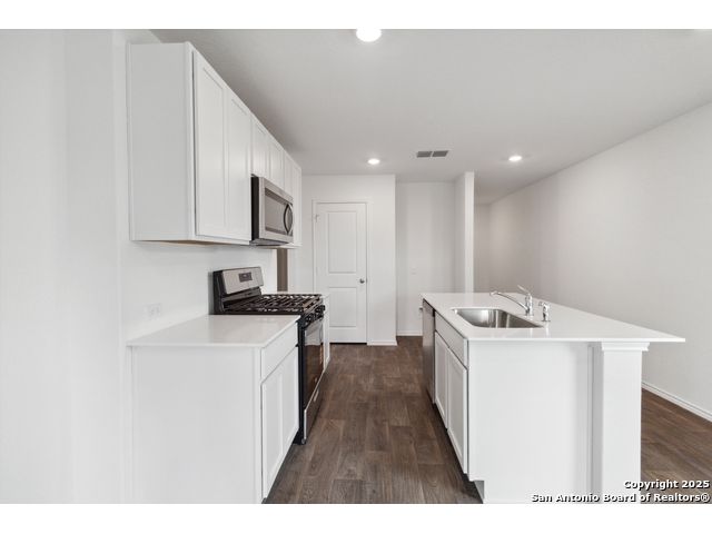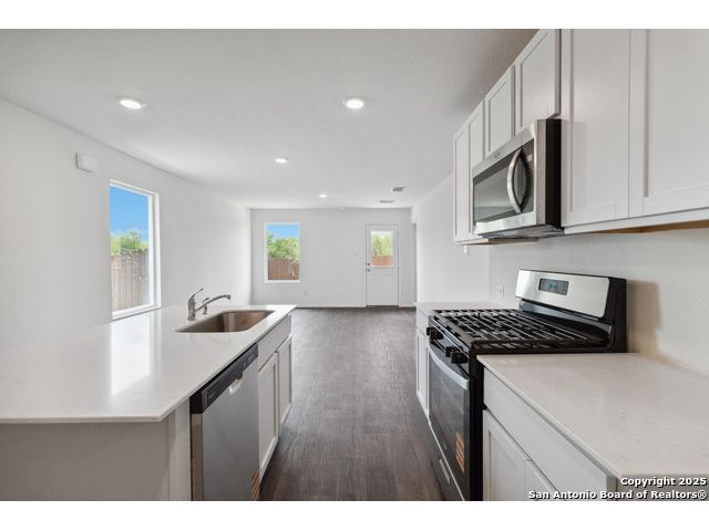 The Estero is a charming one-story home featured in Avenida in Converse, TX. Featuring 2 classic front exteriors, this 4 bedroom, 2 bathroom home also offers 1586 square feet of living space and a 2-car garage. A front porch (per plan) welcomes you into the home and opens to the gourmet kitchen which includes quartz counter tops, shaker style cabinets, stainless steel appliances and an open concept floorplan with the kitchen flowing seamlessly into the dining room and living room. The main bedroom has an attractive ensuite bathroom that features a quartz vanity countertop, shaker style cabinetry and a spacious tiled walk-in shower. Enjoy additional storage with a large walk-in closet in the primary bedroom. Your secondary bedrooms all feature quality carpet flooring and a closet, and can be used as bedrooms, offices, work out spaces or other bonus rooms. The possibilities are endless with The Estero floor plan. Additional features include sheet vinyl flooring in entry, living room, and all wet areas, quartz counter tops in all bathrooms and HOME IS CONNECTED base package. Using one central hub that talks to all the devices in your home, you can control the lights, thermostat and locks, all from your cellular device.
