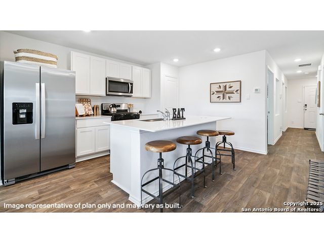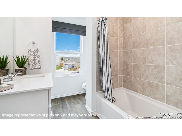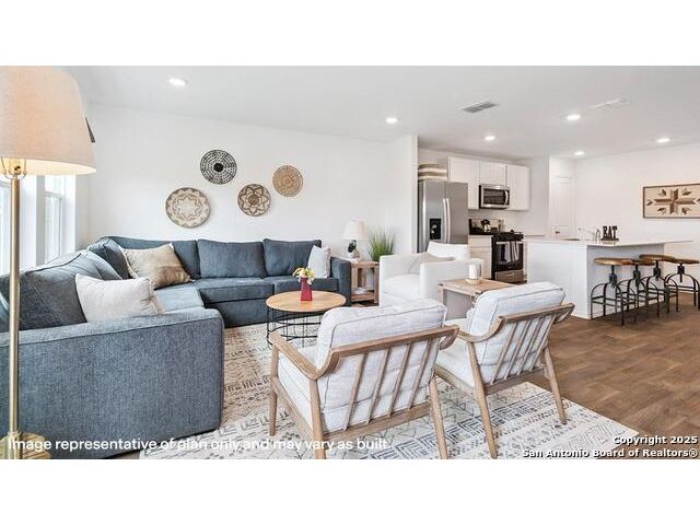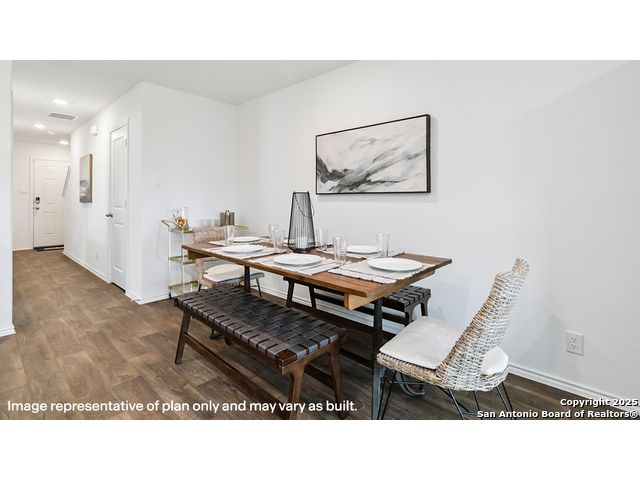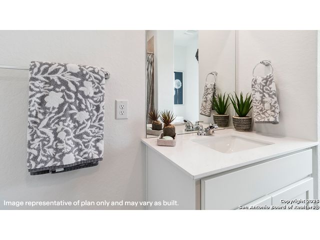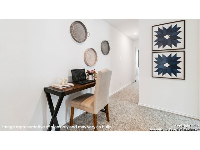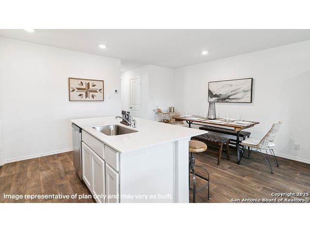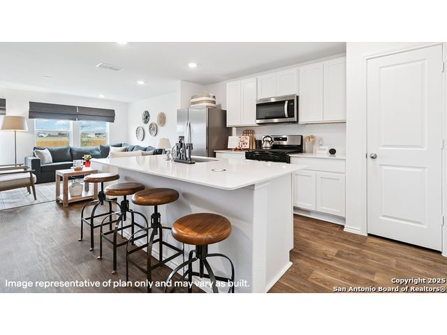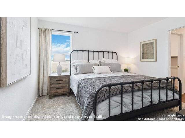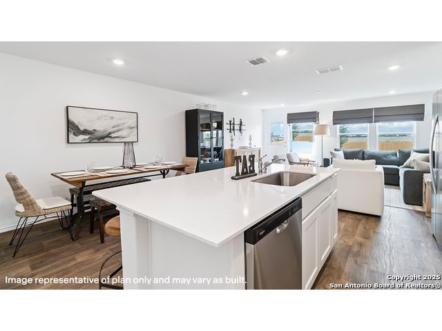 The Altaria is a charming two-story home featured at Blue Ridge Ranch in San Antonio, TX. Featuring 2 classic front exteriors, this 4 bedroom, 2.5 bathroom home also offers 1543 square feet of living space and a 1-car garage. A front porch (per plan) welcomes you into the home and opens to the gourmet kitchen which includes quartz counter tops, quality cabinets, stainless steel appliances and an open concept floorplan with the kitchen flowing seamlessly into the dining room and living room. The main bedroom has an attractive ensuite bathroom that features a quartz vanity countertop and quality cabinetry. Enjoy additional storage with a walk-in closet located off of the primary bathroom. Your secondary bedrooms all feature quality carpet flooring and a closet, and can be used as bedrooms, offices, work out spaces or other bonus rooms. The possibilities are endless with The Altaria floor plan. Additional features include sheet vinyl flooring in entry, living room, and all wet areas, quartz counter tops in all bathrooms and HOME IS CONNECTED base package. Using one central hub that talks to all the devices in your home, you can control the lights, thermostat and locks, all from your cellular device.