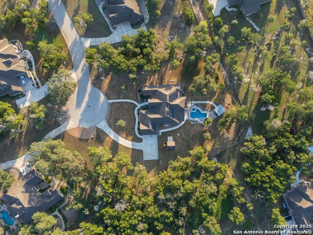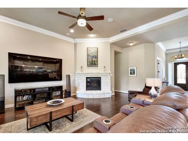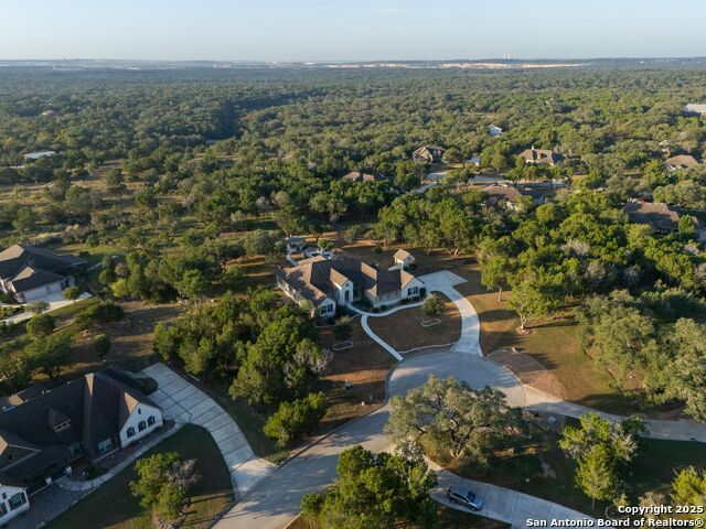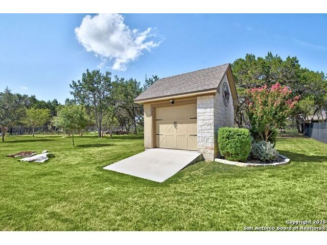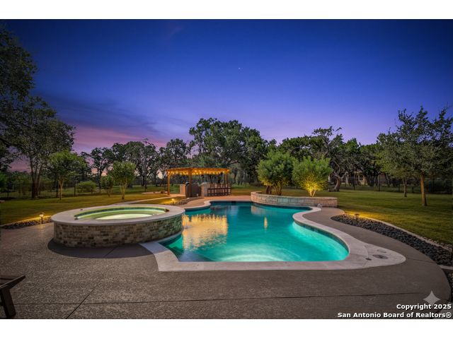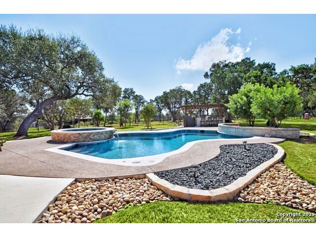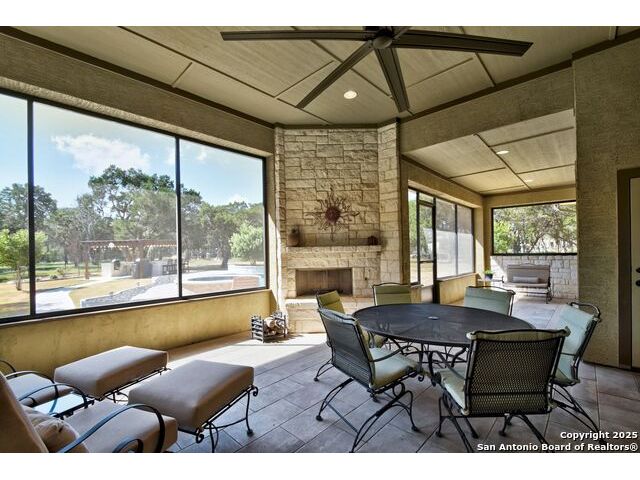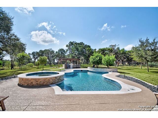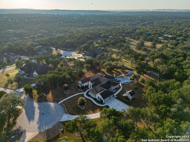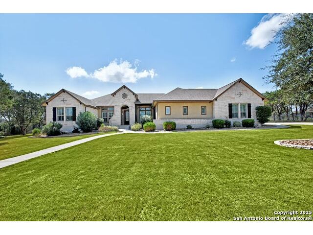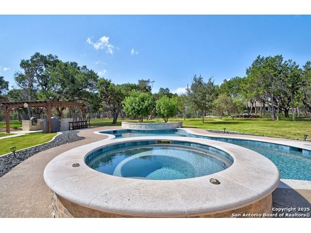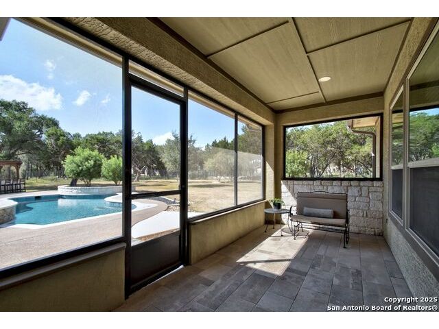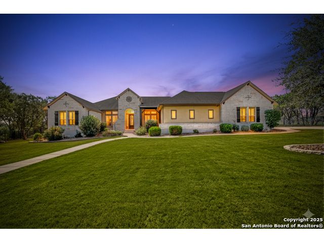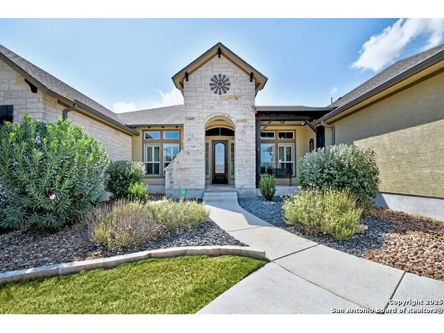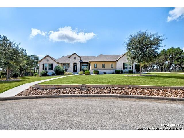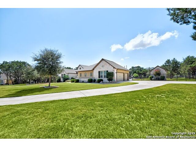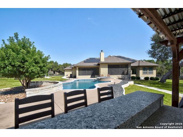 Welcome to 10816 Steinstall Court - a sophisticated single-story residence nestled on a private 1.26-acre cul-de-sac lot in the highly coveted, gated community of Rockwall Ranch. This exceptional 3,606 sq ft home has been meticulously maintained to 'like new' condition. Step inside to discover a thoughtfully designed open layout featuring three spacious bedrooms, each with a private en-suite bath, a dedicated office, a sunroom/craft room and flex space currently being used as an exercise room. At the heart of the home lies a chef's kitchen appointed with stainless steel appliances, an oversized island, and custom cabinetry - the perfect balance of function and form. The owner's retreat is a sanctuary unto itself, boasting a spa-inspired bathroom and an expansive, custom walk-in closets designed to impress. This property is as smart as it is stunning, with energy-efficient features including paid-off solar panels, spray-foam insulation, extra insulation added in the attic and a high-end water softener system. Designer lighting, custom shutters, and Sonos sound inside and out elevate every moment. The meticulously landscaped outdoor living space is nothing short of resort-caliber: enjoy year-round entertaining with a heated pool and spa, a full outdoor kitchen, a screened in porch with fireplace, and extensive hardscaping surrounded by mature trees offering the ultimate in privacy. Located within acclaimed Comal ISD and offering access to Rockwall Ranch amenities-clubhouse, pool, tennis courts, playground, and more-this estate offers refined Hill Country living just minutes from the vibrant energy of New Braunfels, San Antonio, and Canyon Lake. Truly a rare opportunity to own a private, turn-key luxury residence in one of the area's most distinguished communities. Shown by appointment only.