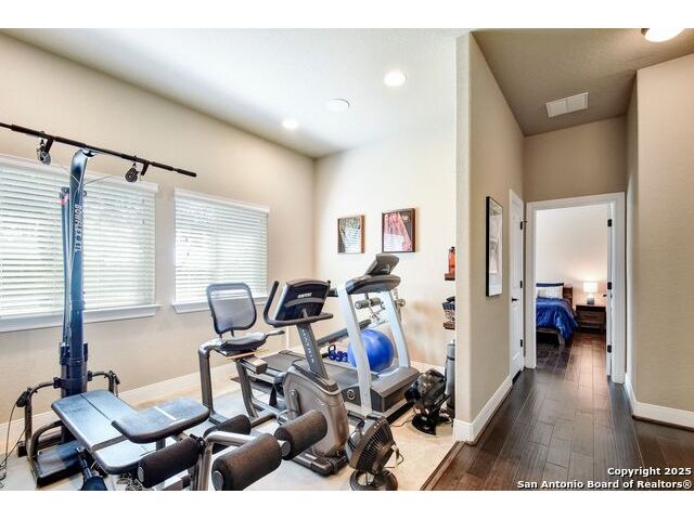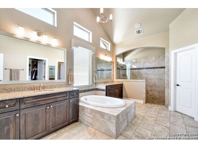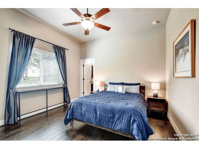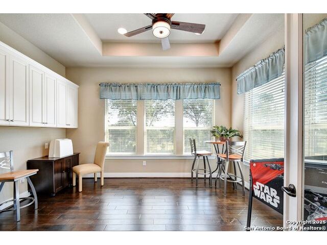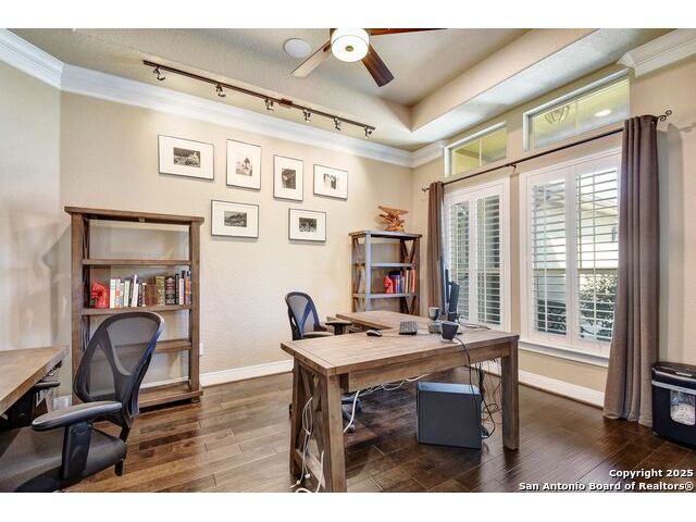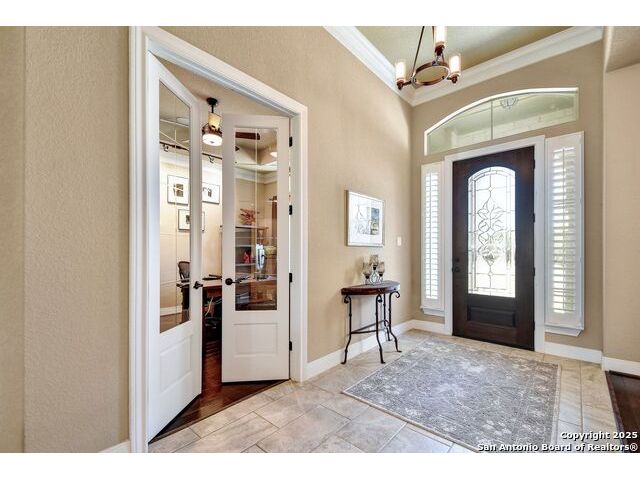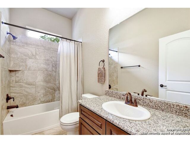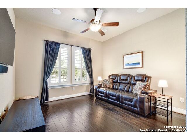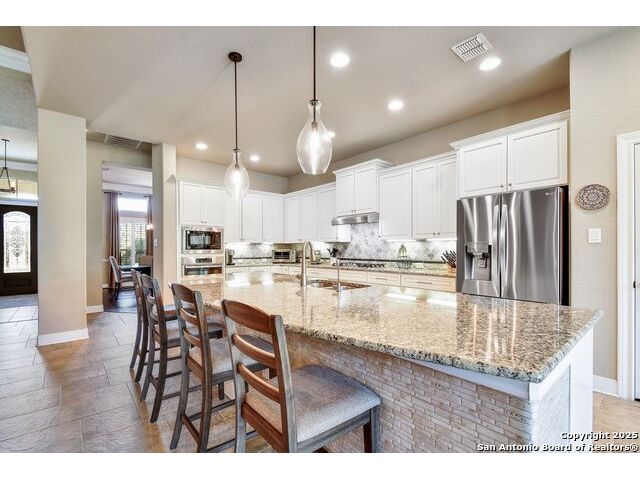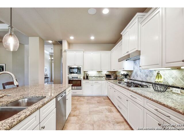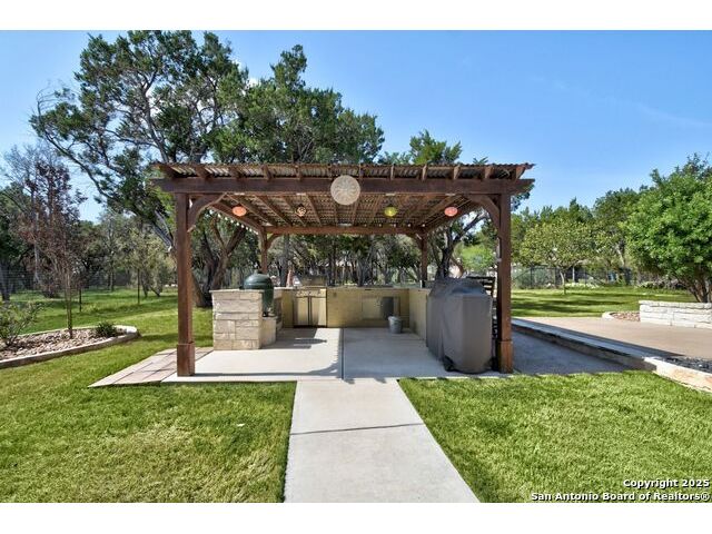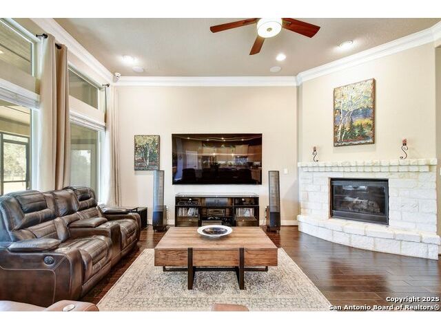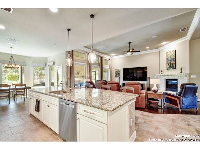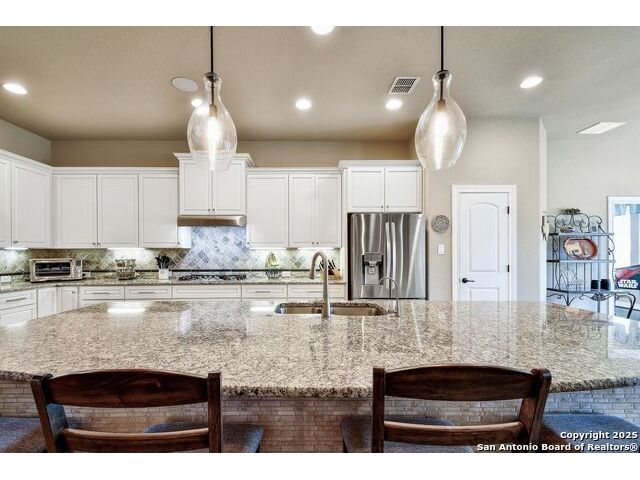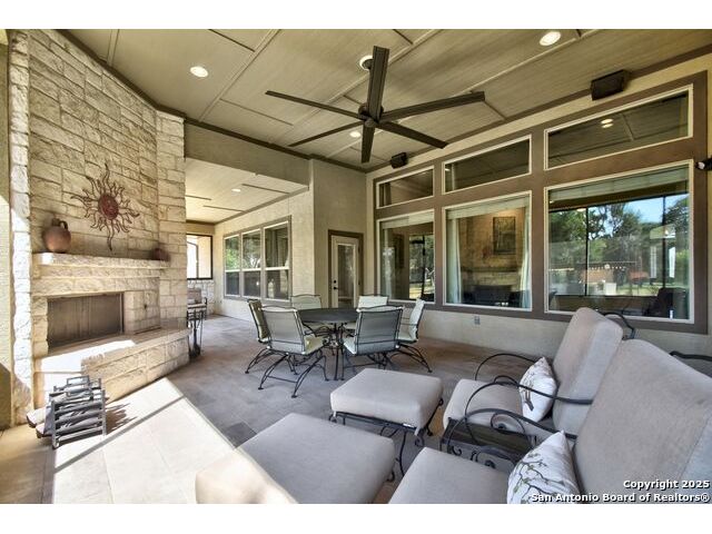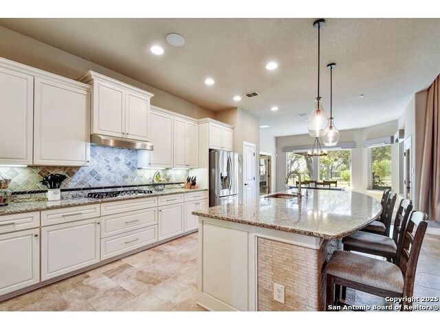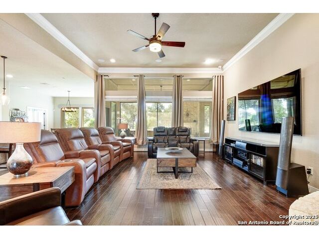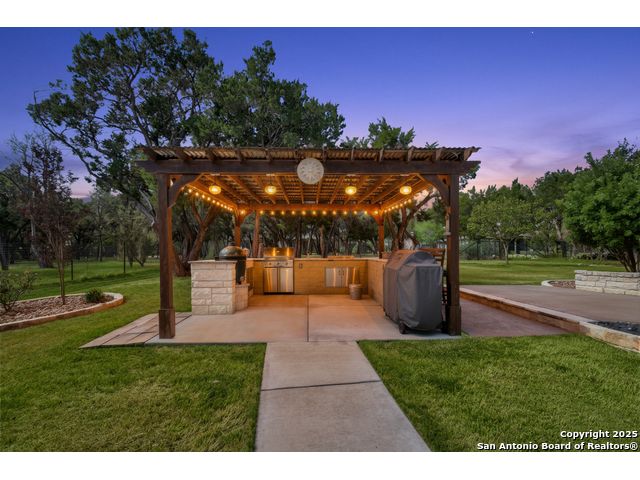 Welcome to 10816 Steinstall Court - a sophisticated single-story residence nestled on a private 1.26-acre cul-de-sac lot in the highly coveted, gated community of Rockwall Ranch. This exceptional 3,606 sq ft home has been meticulously maintained to 'like new' condition. Step inside to discover a thoughtfully designed open layout featuring three spacious bedrooms, each with a private en-suite bath, a dedicated office, a sunroom/craft room and flex space currently being used as an exercise room. At the heart of the home lies a chef's kitchen appointed with stainless steel appliances, an oversized island, and custom cabinetry - the perfect balance of function and form. The owner's retreat is a sanctuary unto itself, boasting a spa-inspired bathroom and an expansive, custom walk-in closets designed to impress. This property is as smart as it is stunning, with energy-efficient features including paid-off solar panels, spray-foam insulation, extra insulation added in the attic and a high-end water softener system. Designer lighting, custom shutters, and Sonos sound inside and out elevate every moment. The meticulously landscaped outdoor living space is nothing short of resort-caliber: enjoy year-round entertaining with a heated pool and spa, a full outdoor kitchen, a screened in porch with fireplace, and extensive hardscaping surrounded by mature trees offering the ultimate in privacy. Located within acclaimed Comal ISD and offering access to Rockwall Ranch amenities-clubhouse, pool, tennis courts, playground, and more-this estate offers refined Hill Country living just minutes from the vibrant energy of New Braunfels, San Antonio, and Canyon Lake. Truly a rare opportunity to own a private, turn-key luxury residence in one of the area's most distinguished communities. Shown by appointment only.