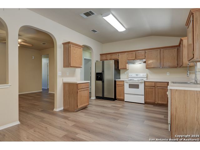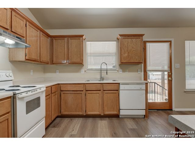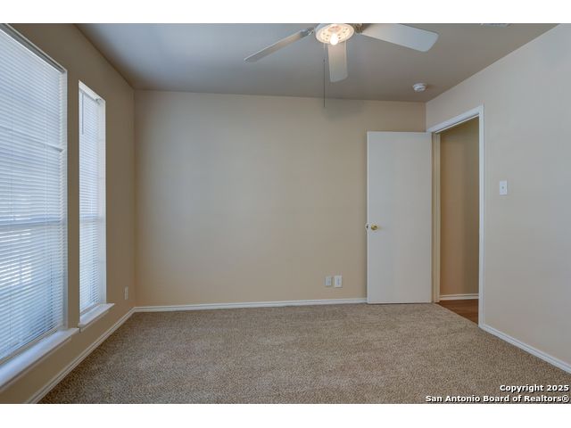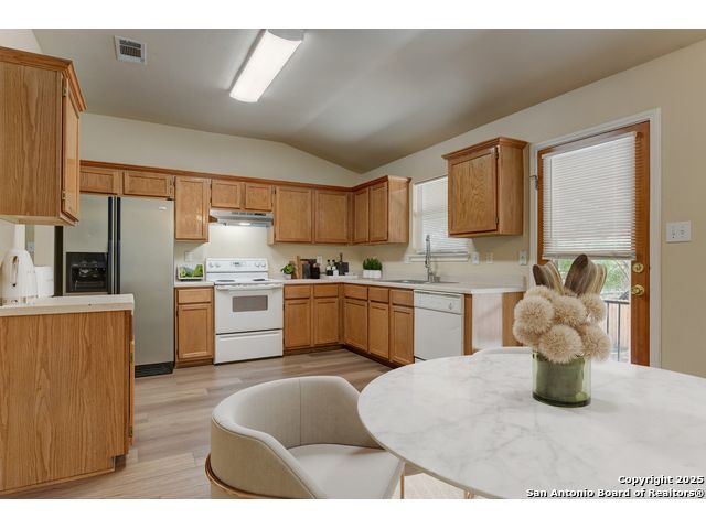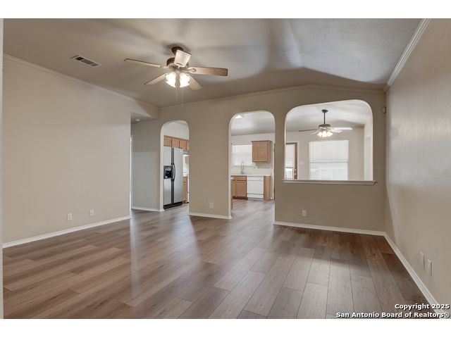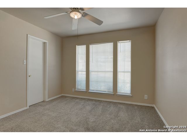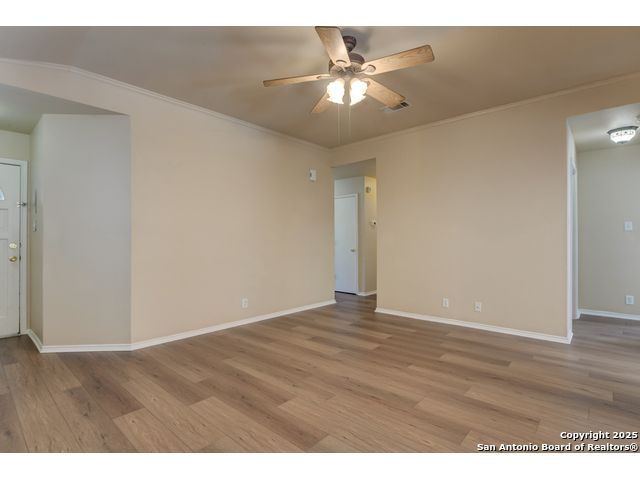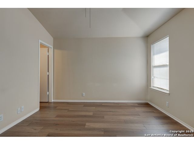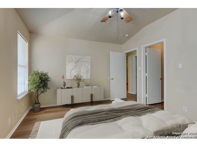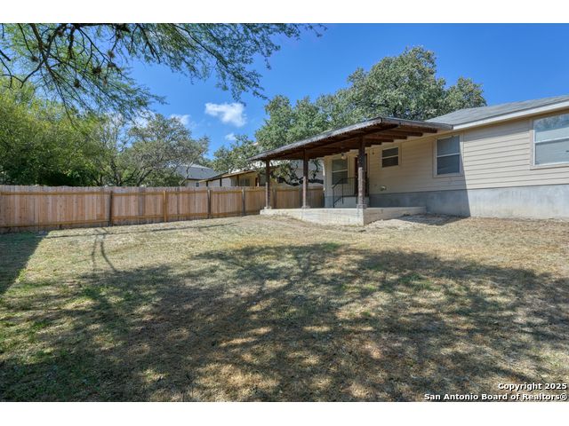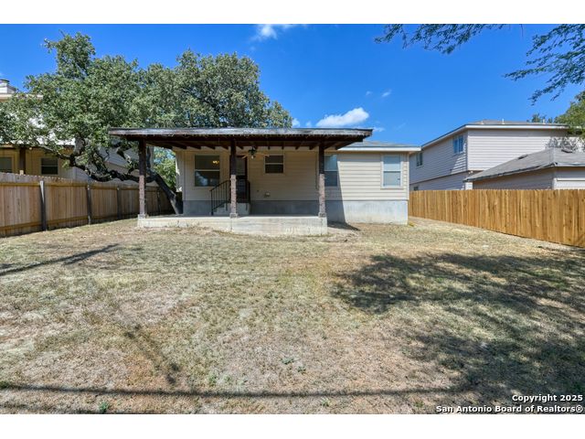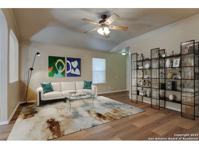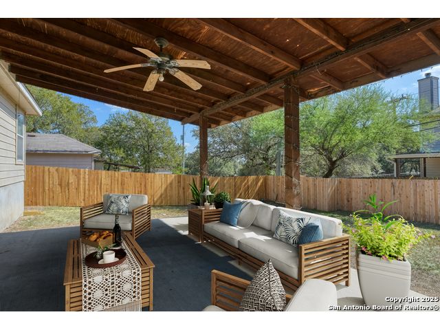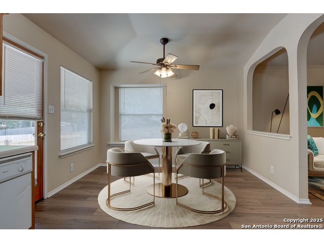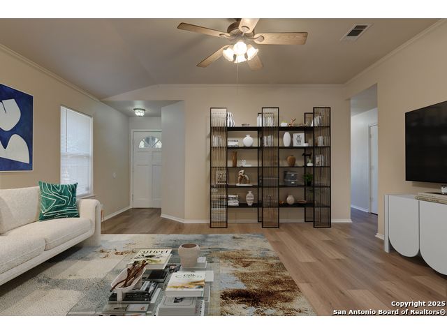 Charming residence blends warmth, functionality, and a spacious layout. Step inside to a bright living area with fresh laminate wood flooring that flows seamlessly throughout the main spaces, creating a cohesive and welcoming atmosphere. Natural light and neutral tones provide the perfect blank canvas to make the home your own. The open floor plan connects the living, dining, and kitchen areas, making it ideal for everyday living and entertaining. The kitchen features ample cabinet storage and direct access to the backyard, bringing in plenty of natural light and making outdoor dining or gatherings effortless. The converted garage offers a versatile flex space-perfect for a media room, home office, or playroom. Built-in shelving provides added functionality and convenience, while ceiling fans throughout the home help with energy efficiency. The primary bedroom is designed for comfort and includes an en suite bath, while two additional bedrooms and a second full bathroom offer flexibility for guests, family, or workspace. The laundry room features shelving for added storage and organization, keeping daily chores simple and efficient. Step outside to enjoy the relaxing covered patio, complete with a ceiling fan for year-round comfort. The private fenced backyard offers plenty of room for outdoor fun, gardening, or simply relaxing in the shade. This move-in-ready home combines thoughtful design with recent updates to create a warm and inviting space inside and out. Conveniently located near the city, restaurants, and shopping, it offers both comfort and accessibility. Please be aware that some photos have been virtually staged.