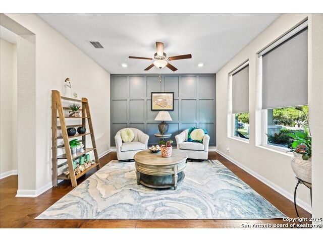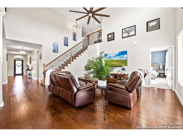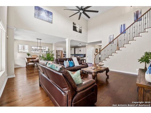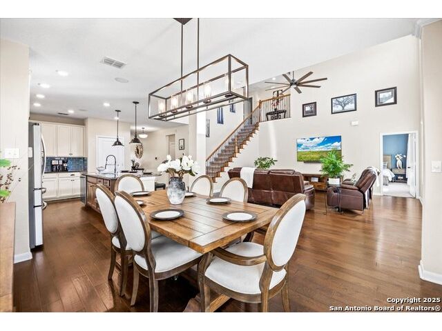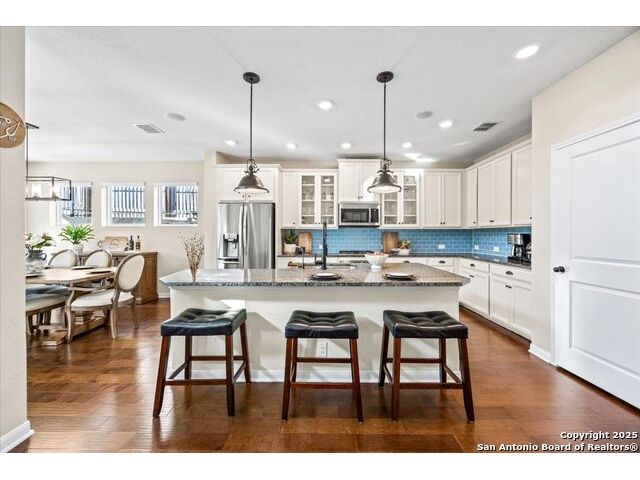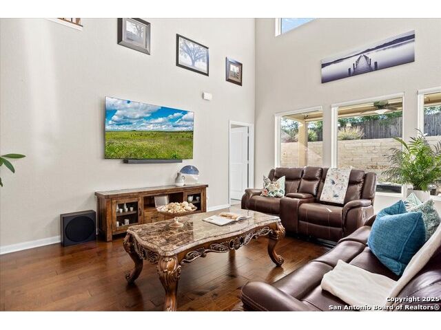 Welcome to this former David Weekley model home, designed with thoughtful details and modern comfort. Located just steps from the community pool, splash pad, playground, clubhouse, and sports court, it feels like having your own recreational center right across the street. Inside, rich wood floors flow through the main living areas, creating a warm and inviting feel. The dedicated dining room features a professionally designed custom accent wall, adding style and personality. The family room impresses with soaring ceilings and expansive windows that fill the space with natural light. The kitchen is bright and functional, featuring a gas cooking range, upgraded cabinetry, and a stylish backsplash. It opens seamlessly to the family room and breakfast area, keeping everyone connected whether cooking, dining, or relaxing. Thoughtful touches such as upgraded light fixtures enhance the home's character. The primary suite, conveniently located on the main level, offers privacy and ease. Its bath includes a large stand-alone shower and a well-planned layout. The laundry room is equipped with cabinetry and a folding area, making everyday tasks simpler. Upstairs, you'll find the rest of the guest bedrooms (one of them being a true junior suite featuring its own in suite full bathroom), and bathrooms along with a spacious flex room - ideal as a game room, media room, or even a fifth bedroom to suit your needs. Step outside to a generous covered patio, perfect for enjoying quiet evenings or entertaining friends. The backyard offers multiple levels and no neighbors behind, adding to the sense of space and privacy. A true three-car garage provides ample room for vehicles, storage, or hobbies. Unlike any other, the garage is climate controlled and it boasts epoxy floors for easy maintenance. The home's location also offers a short commute to major highways, keeping you connected while enjoying a community-centered lifestyle. This property blends comfort, convenience, and thoughtful upgrades-ready to welcome you home.