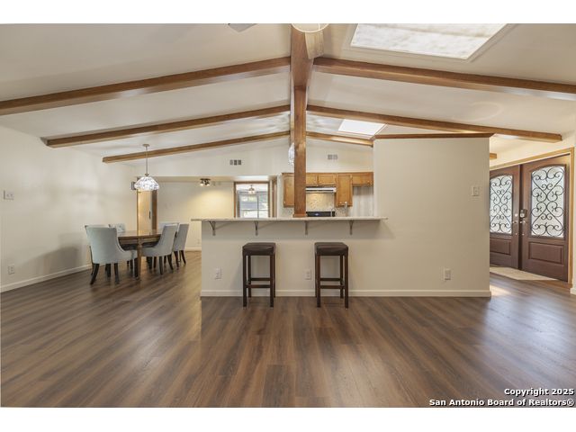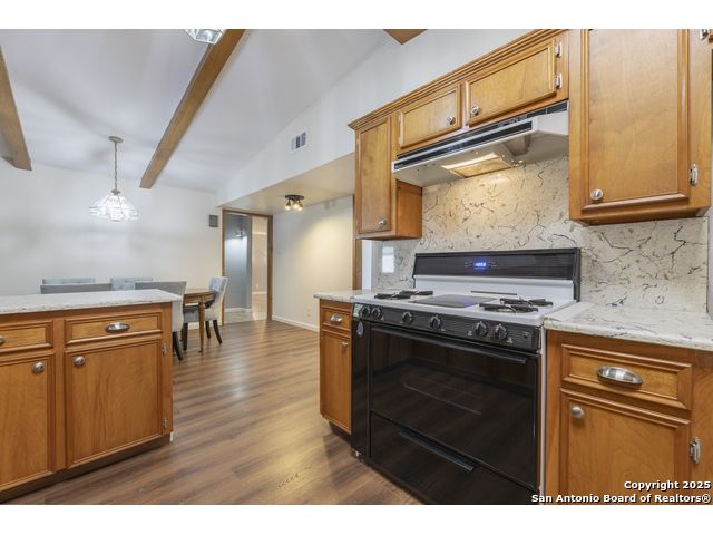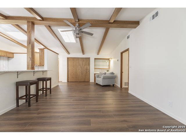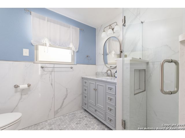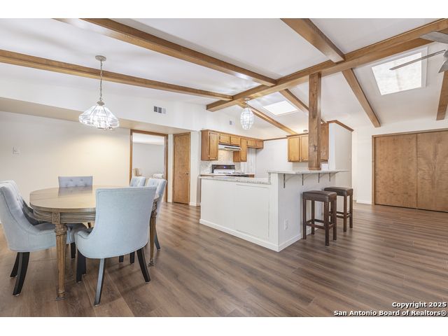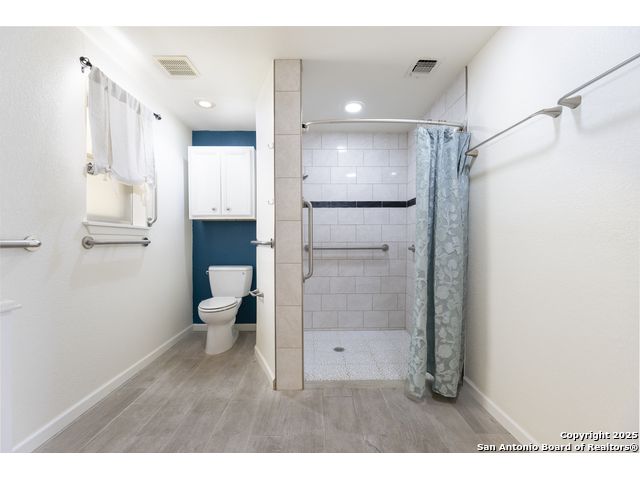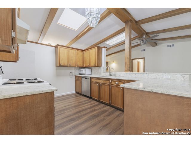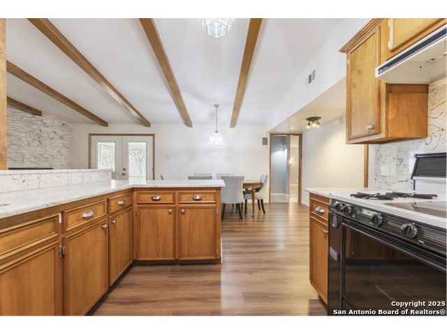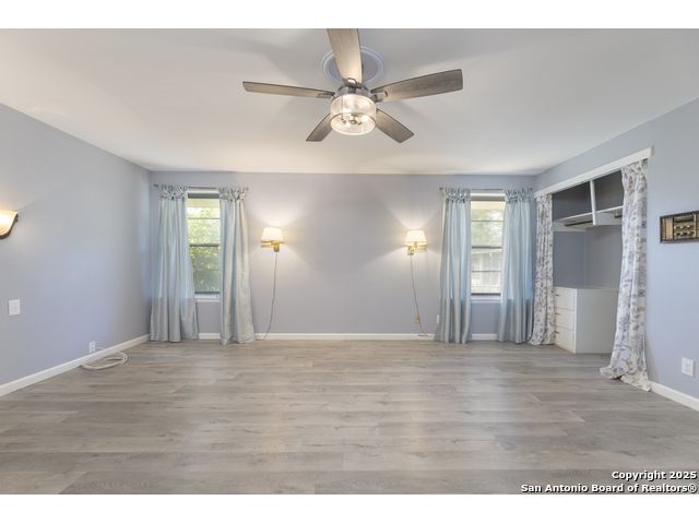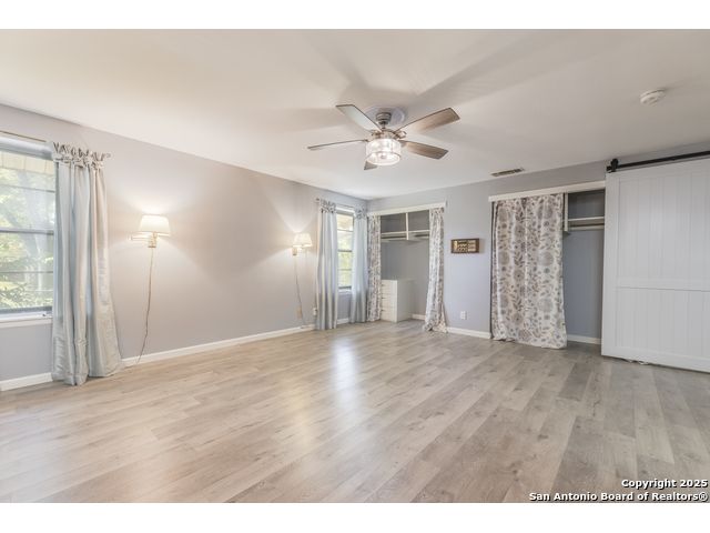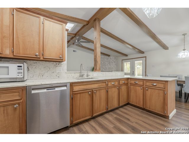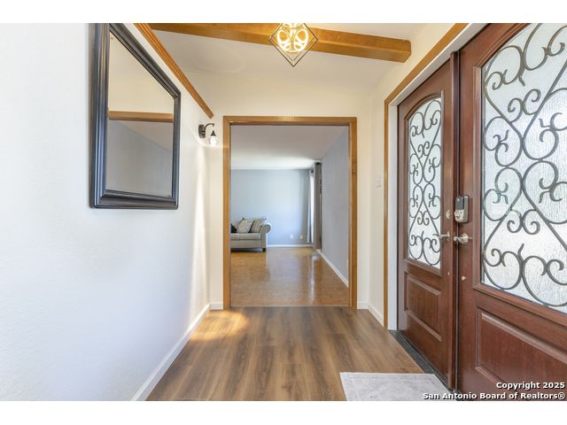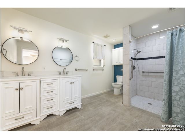 Spacious, immaculately maintained and upgraded 2400+sqft / 3bdrm, 2-bthrm residence offering new flooring and designer upgraded bathrooms. The remodel was done by the owners- not a flip house- it was done right with love and excellence over the last 7 yrs. It includes the whole house re-wiring which is an important safety concern for many older homes in Windcrest. Newer roof, HVAC, water heater- this is a clean, move in ready home! Has great ADA modifications in place for those who have mobility concerns. Just down the street from the elementary school in the highly sought-after Windcrest subdivision. Home sits on a generous .344-acre lot with great trees and combines timeless design with unique character. Low maintenance stone exterior and circular driveway are framed by mature trees create a welcoming first impression. A 3-car portico provides plenty of parking and convenience plus a new shed in back yard for additional storage and 2 additional outdoor accessed storage closets make this house incredibly functional. The covered patio out back is plumbed with gas for outdoor grill and perfect for hosting gatherings or simply enjoying the tranquil, shaded yard. The spacious living room with vaulted ceiling features a curved front gas plumbed fireplace as its centerpiece, enhanced by charming wood beams that extend into the kitchen, creates a cohesive Mid-Century Modern appeal. The kitchen is designed with both function and comfort in mind, offering ample space for preparing meals while staying connected to the heart of the home. Each bedroom offers generous proportions, with natural light filtering through the many windows. The expansive level lot provides plenty of room for play, gardening, or entertaining, making it a true retreat within the city. Windcrest is a community known for its beautiful tree-lined streets, parks, and a welcoming neighborhood atmosphere, this home offers not just a place to live, but a lifestyle. With easy access to shopping, dining, and major highways, convenience is always close by while still enjoying the peace and charm of an established neighborhood. Don't miss the opportunity to make this timeless property your own - schedule a same day private showing today!