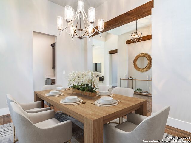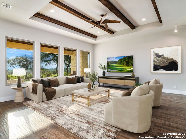 Set on 3.3 acres in the gated Summit Ridge community, this single-story custom home offers privacy, functionality, and striking Hill Country views. Designed with an open layout and thoughtful finishes throughout, it delivers both everyday comfort and an ideal setting for entertaining. Inside, the gourmet kitchen stands as the centerpiece with professional-grade Viking, Thermador, and Bosch appliances, complemented by custom cabinetry and expansive living and dining spaces. Wide-plank wood tile flooring carries throughout the main areas with no carpet in the home, while touches like touchless faucets, built-in cabinetry, and a flexible bonus room enhance convenience. The garage includes a workbench and additional storage, and energy-efficient details such as a tankless water heater, in-wall pest system, blown-in insulation, and dual Trane HVAC units provide peace of mind. Outdoors, the property transforms into a resort-style retreat. A sparkling pool and spa anchor the backyard, complete with an outdoor fireplace and grill for gatherings. The expansive lot offers unmatched privacy with no rear neighbors, while the west-facing orientation frames dramatic sunsets over rolling hills and Medina Lake. With its quiet setting, custom design, and seamless blend of style and function, this home captures the essence of Hill Country living.
