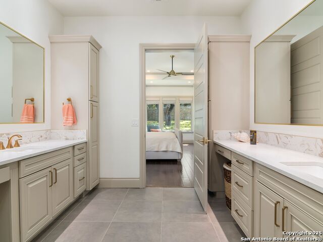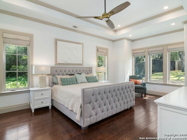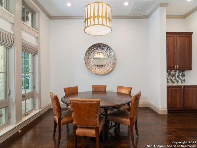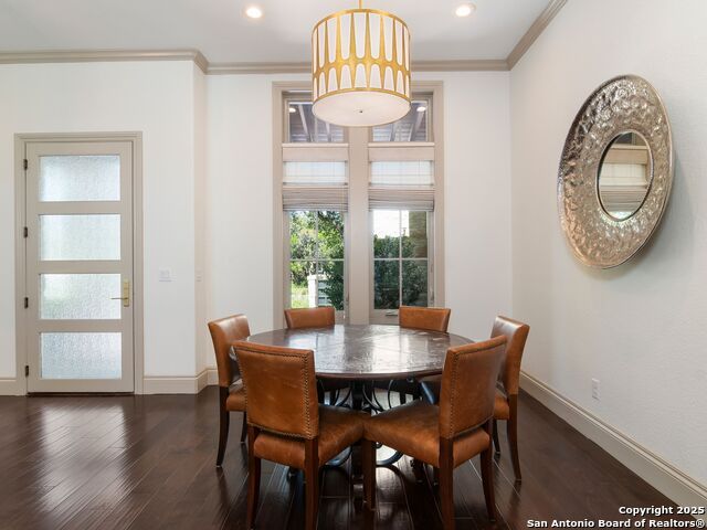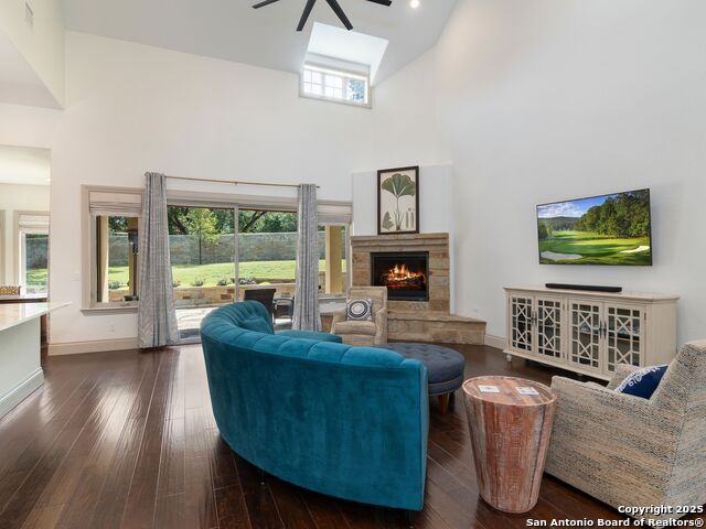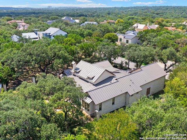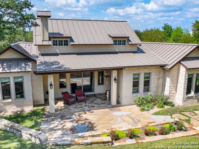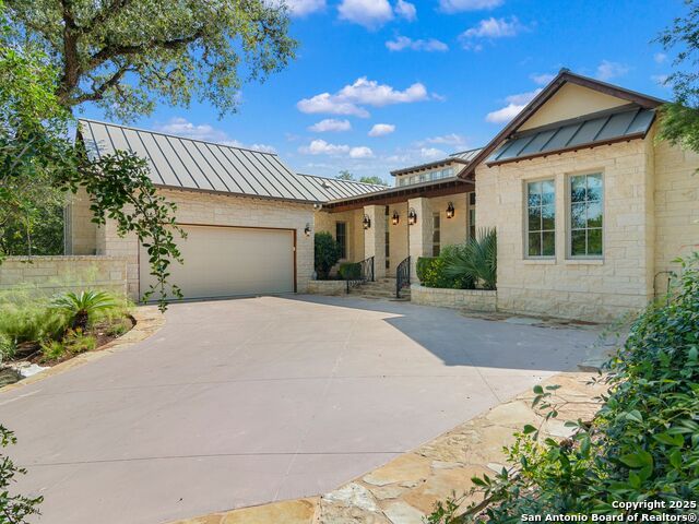 This distinguished single-story residence in Inverness captures the essence of Texas Hill Country architecture with a contemporary touch. Set beneath a canopy of mature oaks, the home rests on a private 28-acre lot that provides a true park-like ambiance. Crafted with an emphasis on quality and design, the Texas limestone exterior, standing seam metal roof, and expansive windows create a seamless connection between indoors and out. Inside, hardwood floors flow through open and light-filled living areas, balancing warmth and sophistication. The chef's kitchen is appointed with professional-grade stainless steel appliances, quartz countertops, an oversized island with seating, and a farmhouse sink. The primary retreat offers a spa-like bath with custom cabinetry, a walk-in shower accented with intricate tilework, and a spacious walk-in closet. Secondary bedrooms are generously scaled, each with ample closet space. Outdoors, a large covered patio overlooks beautifully landscaped grounds, providing a serene backdrop for both quiet relaxation and entertaining. Located in the exclusive, guarded, and gated community of Inverness, this residence offers a rare combination of privacy and convenience, just moments from the Medical Center, Hardberger Park, the JCC, and Alon Town Centre.