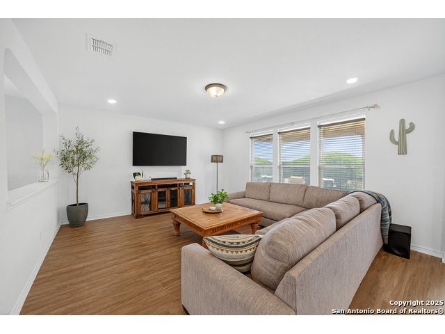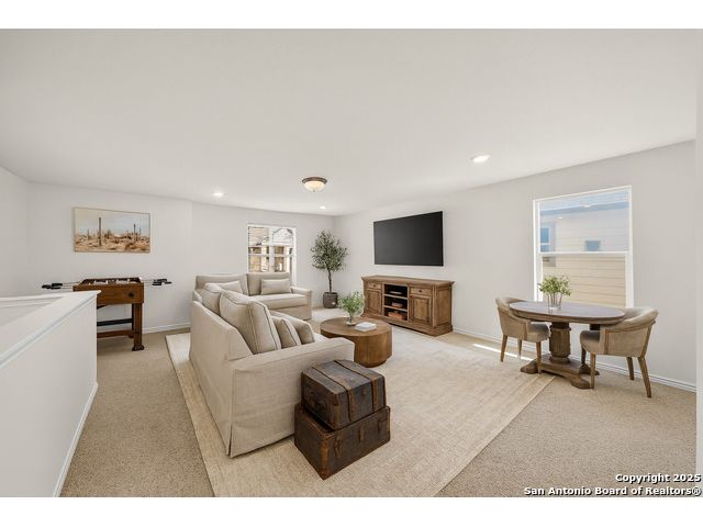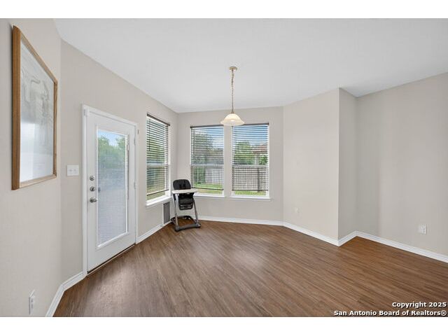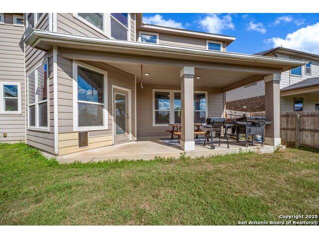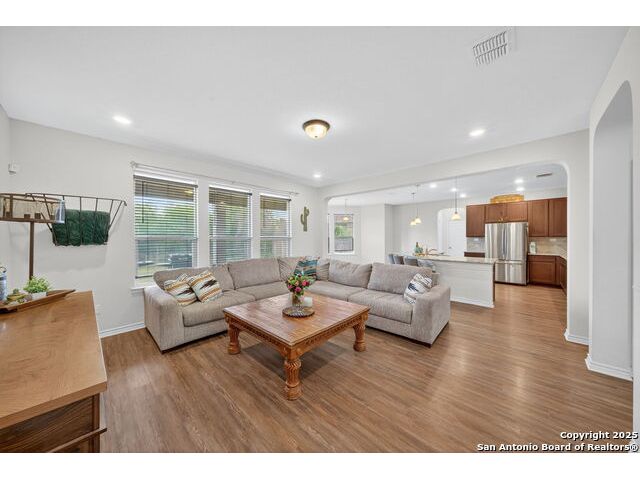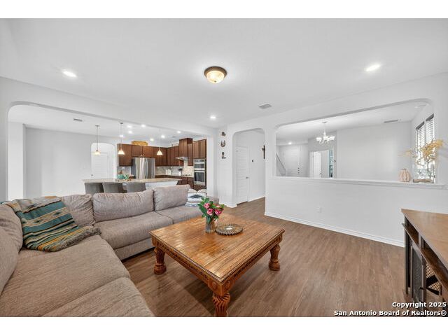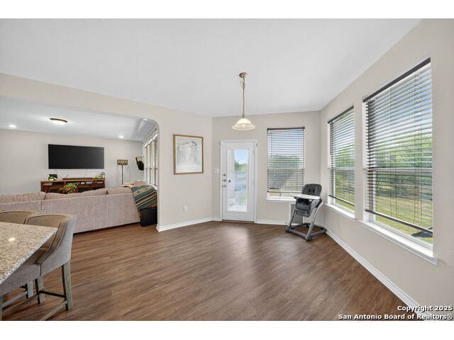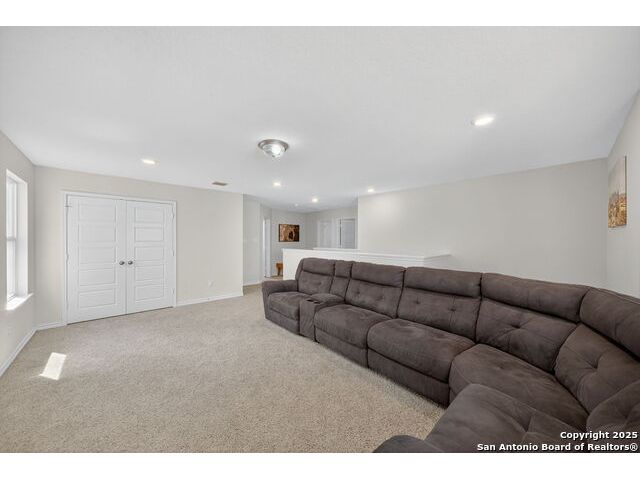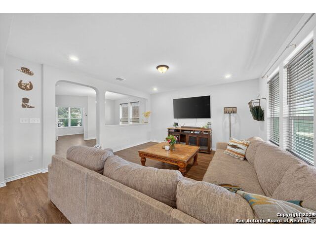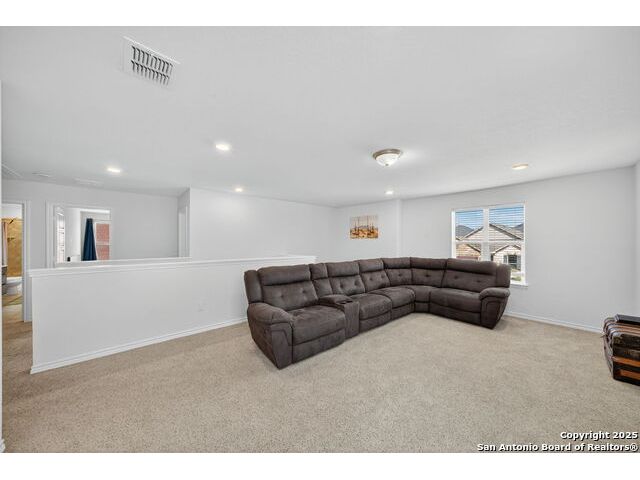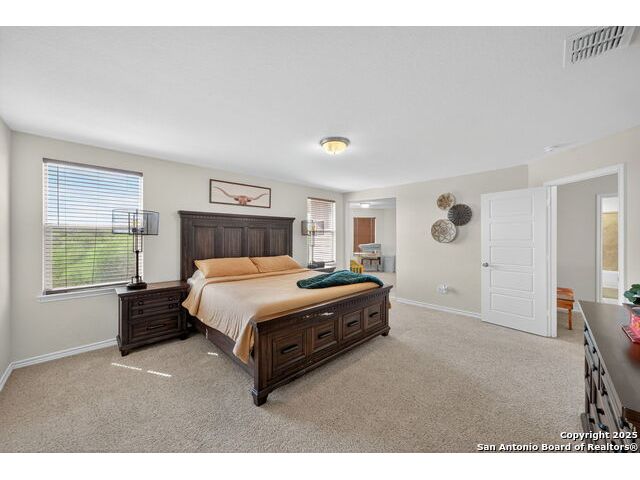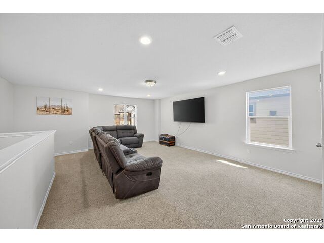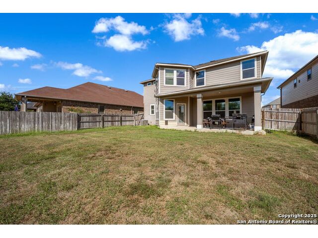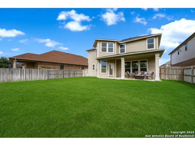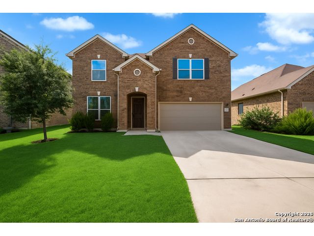 Welcome to this beautifully maintained two-story home set in a wonderful neighborhood and backing to a peaceful greenbelt. From the moment you step inside, the open floor plan and abundance of natural light create a warm, inviting atmosphere perfect for both entertaining and everyday living. At the heart of the home, the chef's kitchen boasts rich wood cabinetry, gleaming granite countertops, stainless steel appliances with WiFi connectivity, and a generous center island with bar seating. A cozy breakfast nook and large family room wrapped in windows make this the ideal gathering space. For those working from home, a private study with double doors offers quiet and functionality. Upstairs, a spacious game room provides plenty of room for fun, while the private primary retreat impresses with its sitting area, spa-inspired ensuite featuring dual sinks, a multi-head walk-in shower, and a large walk-in closet. Secondary bedrooms are well-sized, providing comfort for family or guests. Step outside to a covered patio overlooking a generous backyard framed by lush greenbelt views-perfect for summer barbecues, evening relaxation, or playtime. Ideally located just minutes from Loop 1604, top-rated schools, Alamo Ranch Shopping Center, SeaWorld, and countless dining and entertainment options, this home truly blends comfort, convenience, and lifestyle.