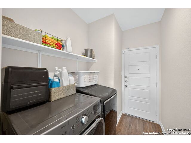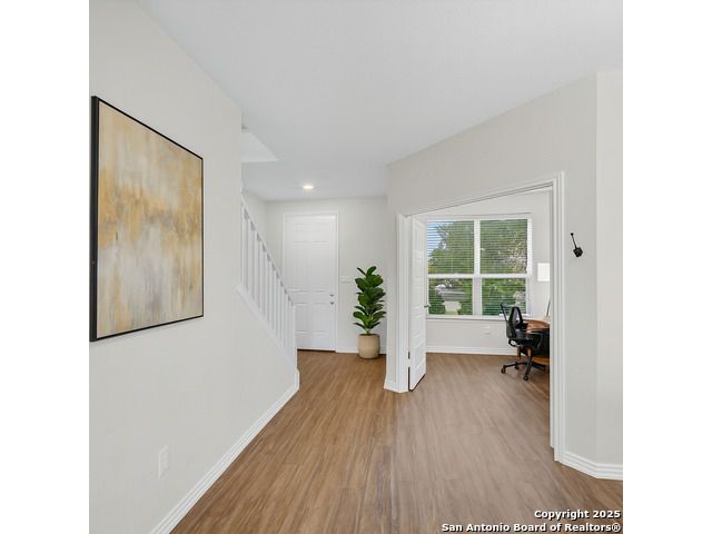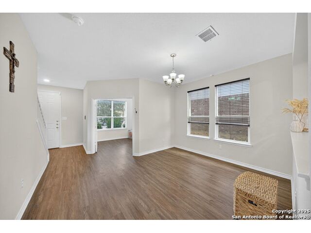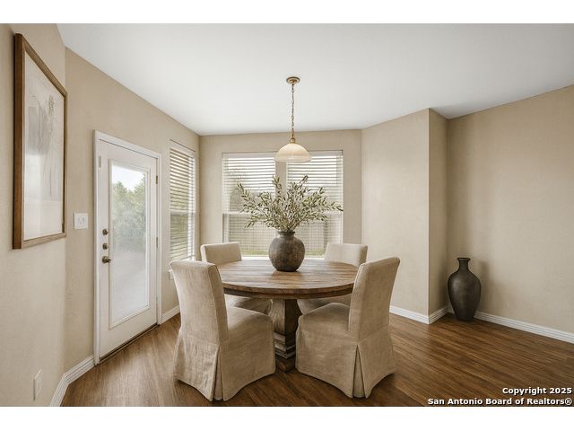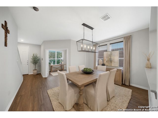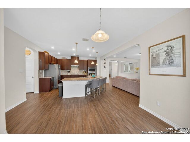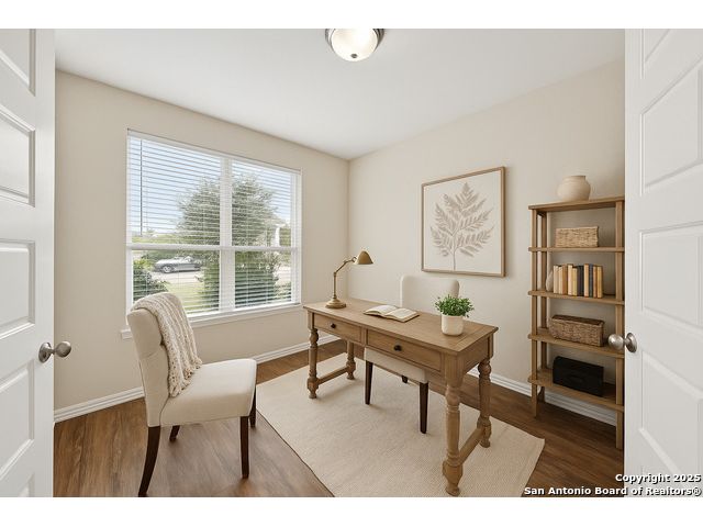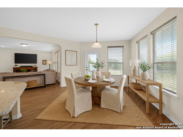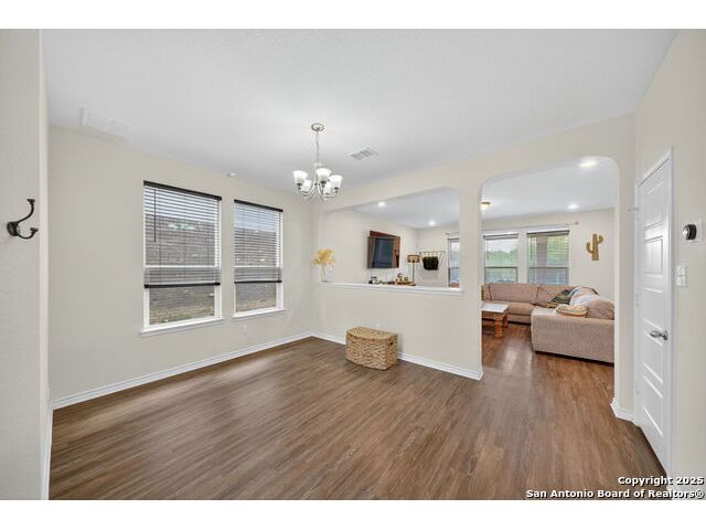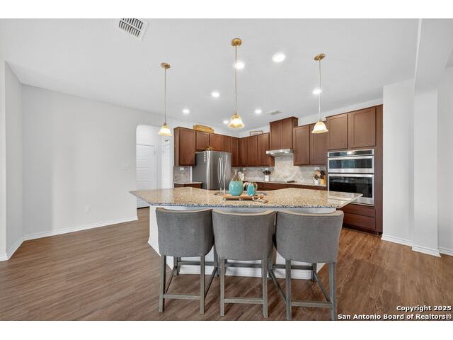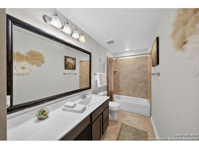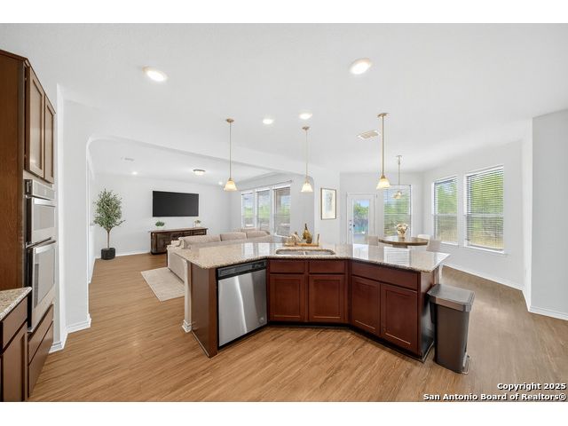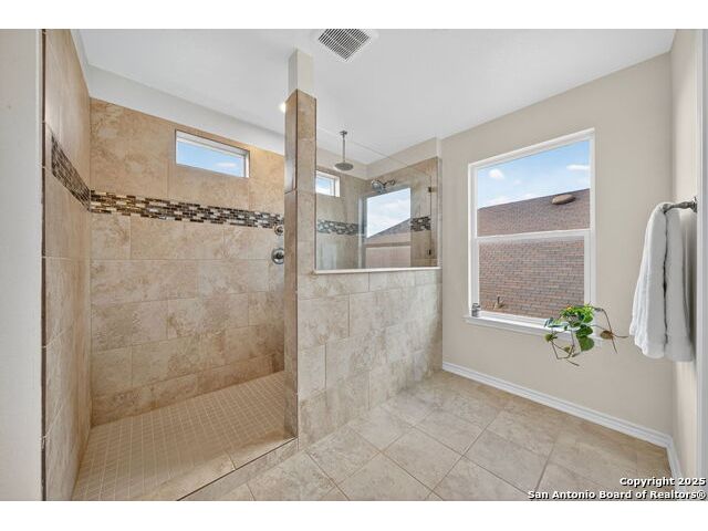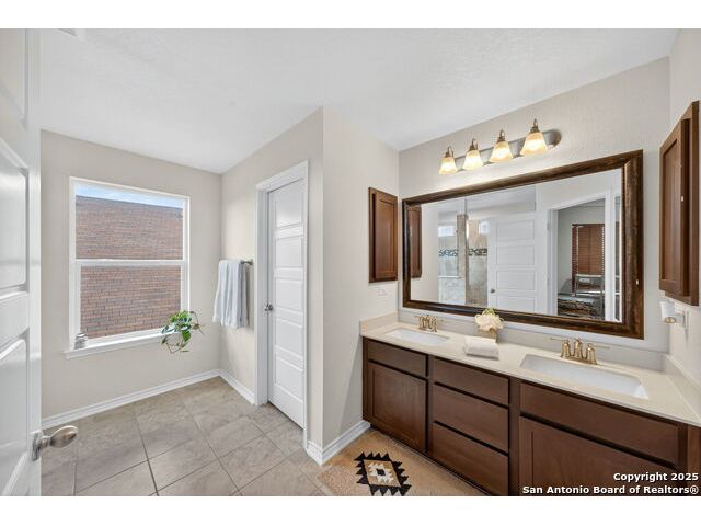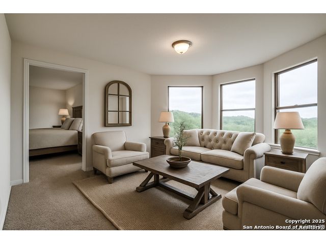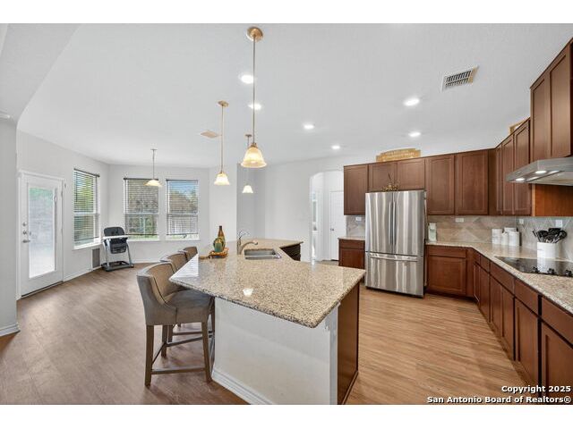 Welcome to this beautifully maintained two-story home set in a wonderful neighborhood and backing to a peaceful greenbelt. From the moment you step inside, the open floor plan and abundance of natural light create a warm, inviting atmosphere perfect for both entertaining and everyday living. At the heart of the home, the chef's kitchen boasts rich wood cabinetry, gleaming granite countertops, stainless steel appliances with WiFi connectivity, and a generous center island with bar seating. A cozy breakfast nook and large family room wrapped in windows make this the ideal gathering space. For those working from home, a private study with double doors offers quiet and functionality. Upstairs, a spacious game room provides plenty of room for fun, while the private primary retreat impresses with its sitting area, spa-inspired ensuite featuring dual sinks, a multi-head walk-in shower, and a large walk-in closet. Secondary bedrooms are well-sized, providing comfort for family or guests. Step outside to a covered patio overlooking a generous backyard framed by lush greenbelt views-perfect for summer barbecues, evening relaxation, or playtime. Ideally located just minutes from Loop 1604, top-rated schools, Alamo Ranch Shopping Center, SeaWorld, and countless dining and entertainment options, this home truly blends comfort, convenience, and lifestyle.