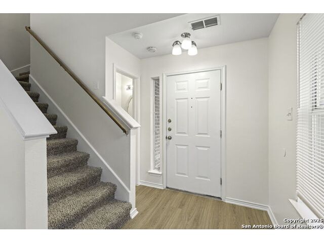 Welcome to this charming 3-bedroom, 2.5-bathroom home nestled in the gated community of Crossings at Quail Creek. Step inside to a bright and open living area featuring soaring ceilings, a cozy fireplace, and walls of windows that fill the space with natural light. The eat-in kitchen with breakfast nook is perfect for casual dining and entertaining. Upstairs, you'll find spacious bedrooms, including a comfortable primary suite. Enjoy a private backyard retreat with a covered patio-ideal for relaxing or hosting gatherings. Conveniently located near the Medical Center, Lackland AFB, USAA, plus shopping and dining along Bandera and Tezel Rd. Outdoor lovers will appreciate quick access to the Leon Creek Greenway Trail System.