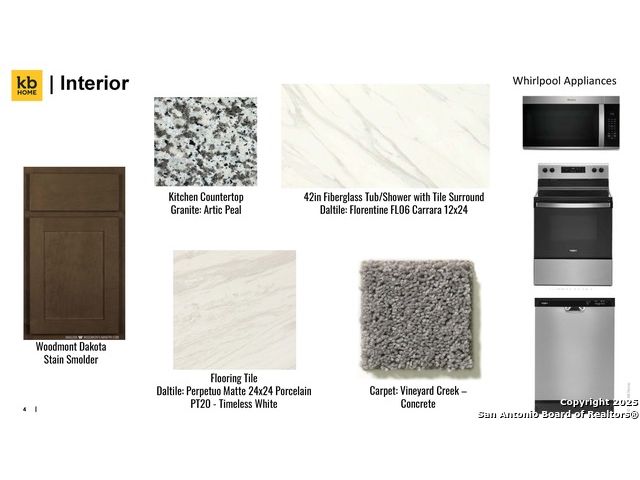 This beautifully appointed home features 9-ft. first-floor ceilings and elegant Perpetuo Matte ceramic tile flooring in the kitchen, great room, and bathrooms. The kitchen shines with Whirlpool stainless steel appliances, Woodmont Dakota Shaker panel 42-in. upper cabinets, granite countertops in Arctic Pearl, and an extended breakfast bar. The primary bath offers a relaxing 42-in. garden tub/shower with a Daltile tile surround and upgraded cabinets. Decorative details include a Carrara-style entry door and Kwikset Polo knob interior hardware. A wireless security system, fully sodded yard, and automatic sprinkler system complete this impressive home.
