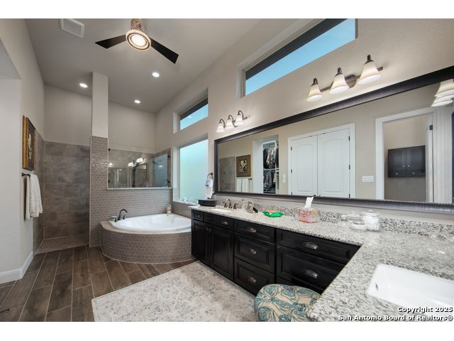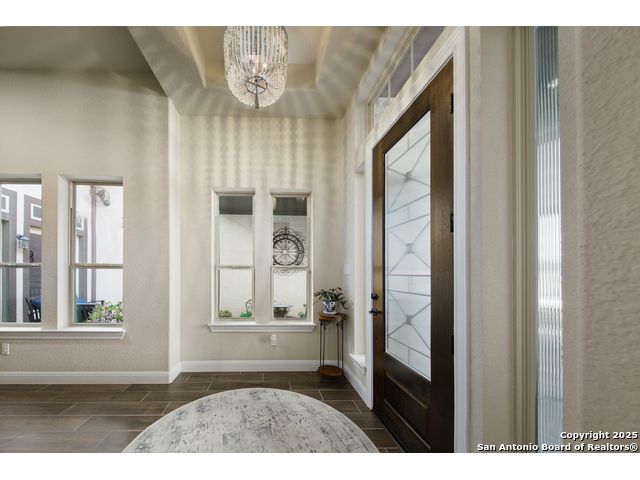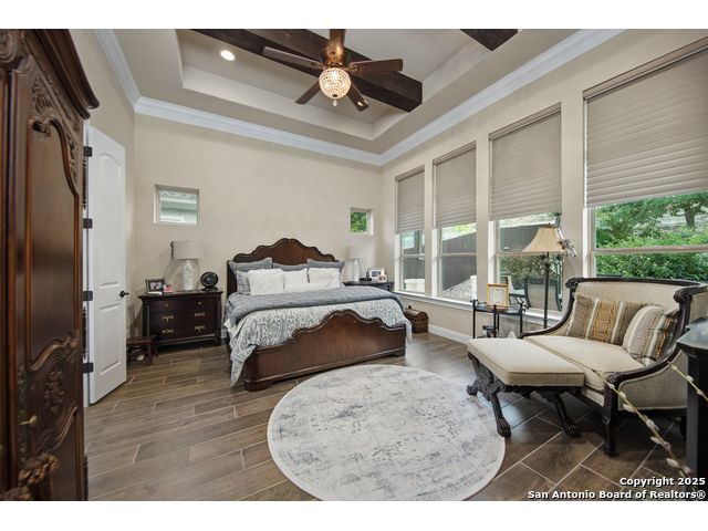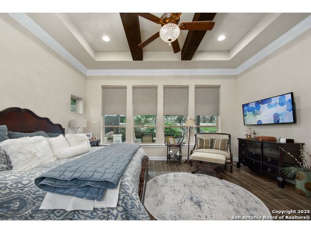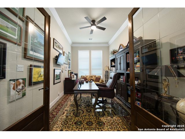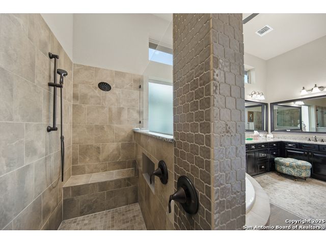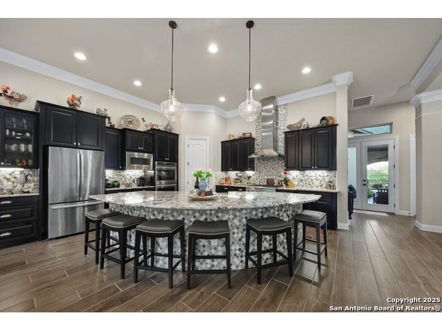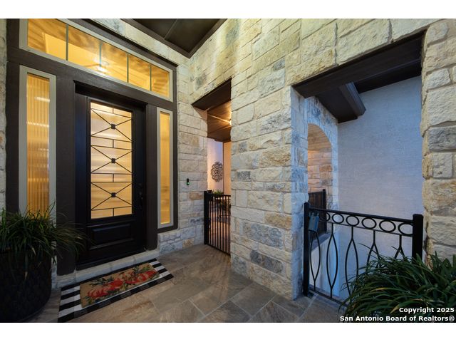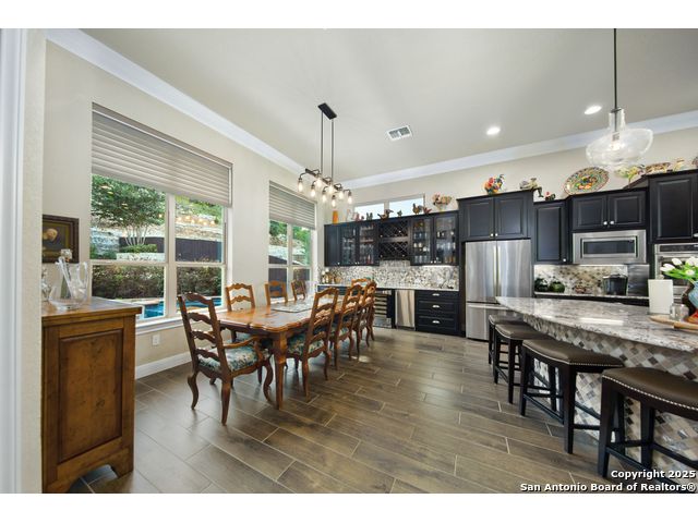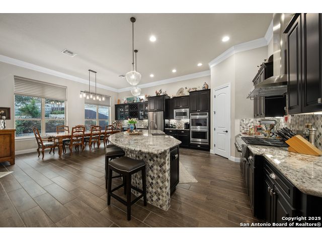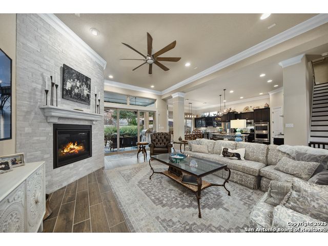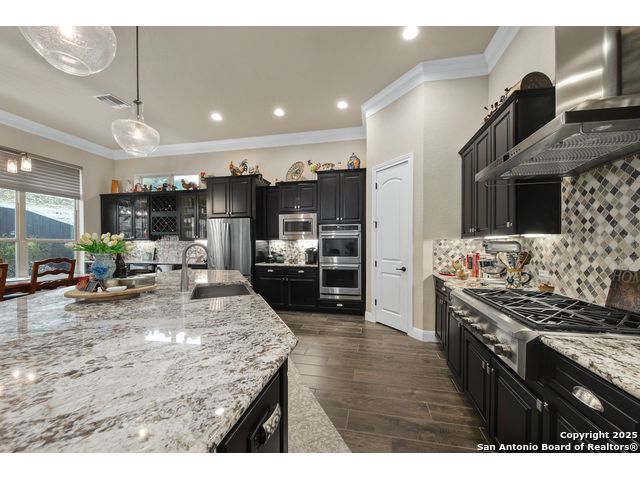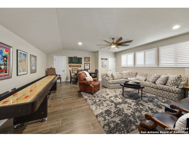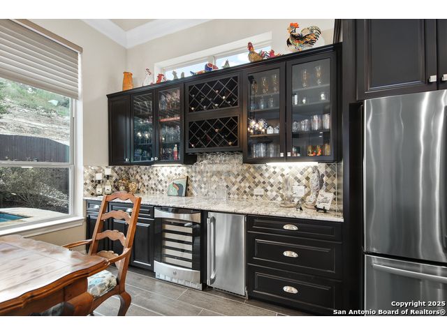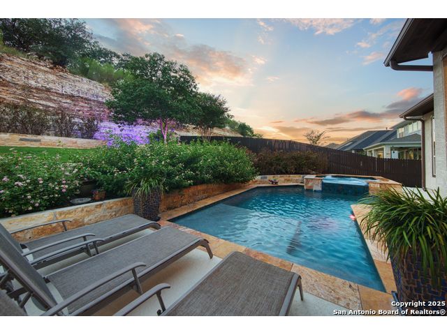 Luxury living awaits on this beautiful hillside lot with consummate back yard privacy. This David Weekly custom home ushers you into a grand open floor plan allowing the best of times for family and friends to gather. Enjoy visiting with your guests at the generous granite island with comfortable seating for 6 with the option to have a seated meal in the adjoining dining area and custom bar. Home chefs will delight in this gourmet kitchen with gas cooking opportunity, double ovens and oversized fridge that is surrounded by exquisite glass tile backsplash. Pool views invite you out to the covered patio to dine al fresco if you prefer and offers a gas grill and beverage center poolside. Immense privacy and lush plantings and landscaping enhance the custom pool and spa features. Inside, the owner's suite and 2 other bedrooms are all downstairs. Upstairs is a large gameroom/living room for the 4th bedroom and bath. This is a one owner custom build with tons of extras and upgrades. Don't miss this home in highly desirable Shavano Highlands.