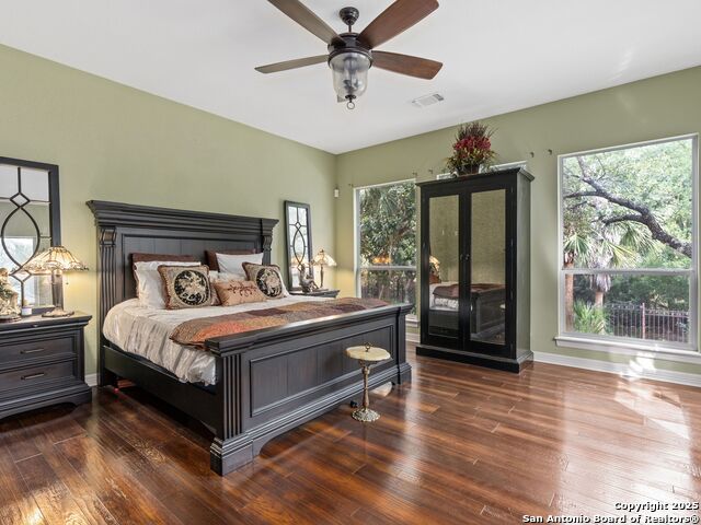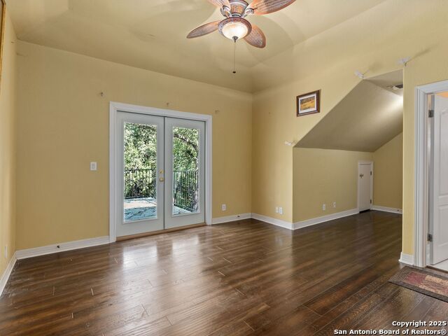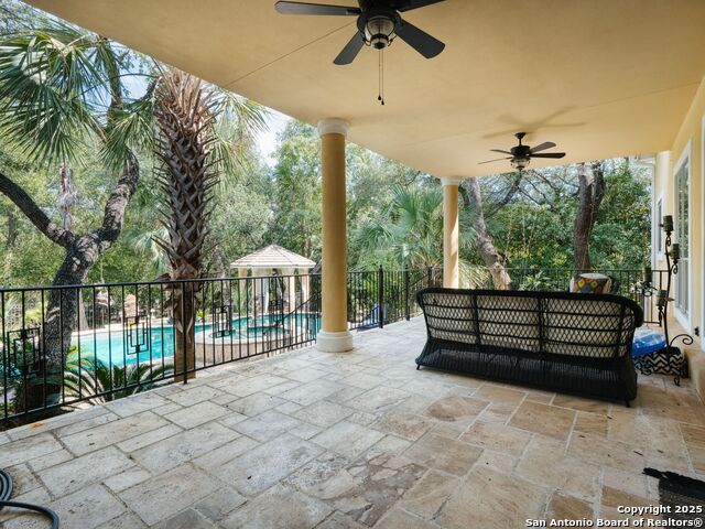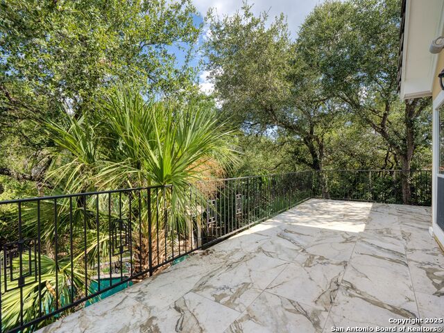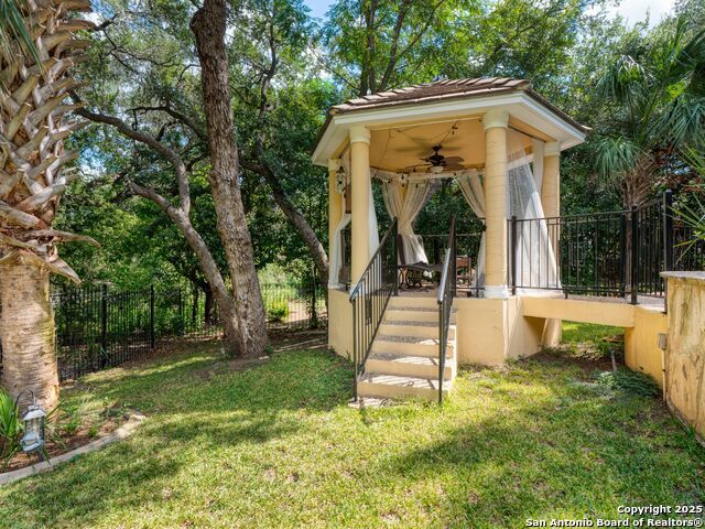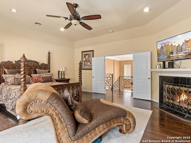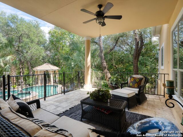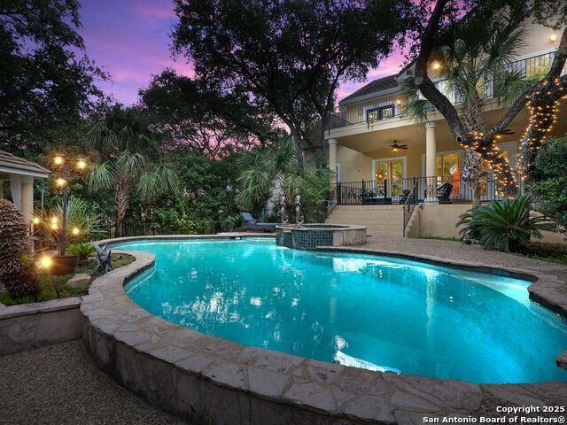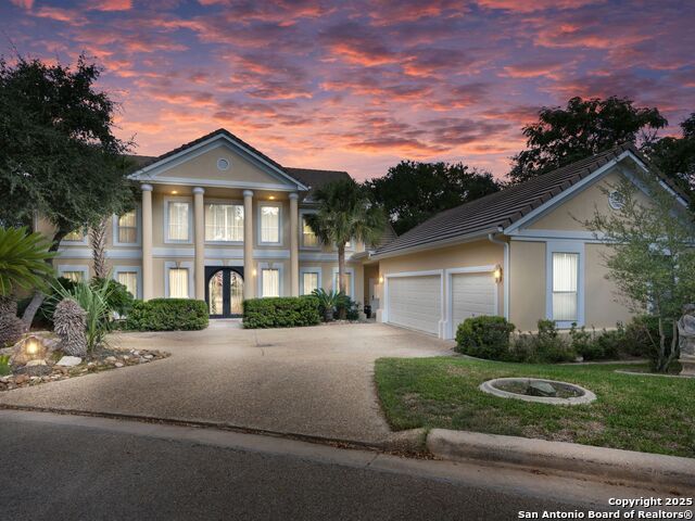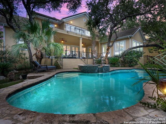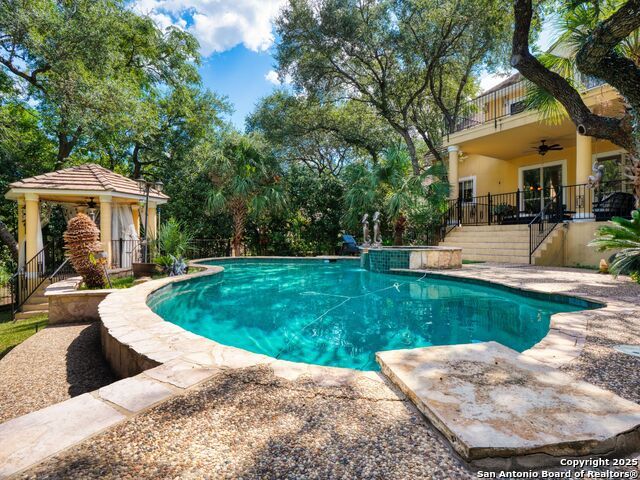 Elegant home tucked away on a quiet cul-de-sac in the prestigious guarded community of Elm Creek, offering the perfect blend of privacy, sophistication, and modern updates. Step into a grand foyer with soaring 24-foot ceilings, a dramatic double staircase, and a striking custom iron front door. The foyer is anchored by a beautiful fleur-de-lis chandelier, setting the tone for timeless elegance. The open floor plan flows effortlessly, showcasing two spacious living areas-one with a cozy wood-burning fireplace-plus a versatile media/game room equipped with a projector and movie-sized screen. The island kitchen features a breakfast bar and gas cooktop (replaced in 2024), ideal for casual dining and entertaining. The luxurious primary suite includes its own fireplace and access to a completely rebuilt balcony (2023) that spans the full width of the home. The spa-like primary bath offers a whirlpool tub for relaxation. All rooms throughout the home are generously sized, with fresh paint in the foyer and bathrooms, and the downstairs bathroom fully renovated. Extensive updates completed in 2024 include: new balcony, HVAC system, water heater, water softener, sprinkler system, ceiling fans, pool pump and heater, exterior paint, and more. Outdoors, enjoy your private oasis with a sparkling pool and spa, charming gazebo, covered deck, and a built-in BBQ pit perfect for entertaining. Mature trees and a stately iron fence provide shade and seclusion for gatherings large or small. This is Elm Creek living at its finest!