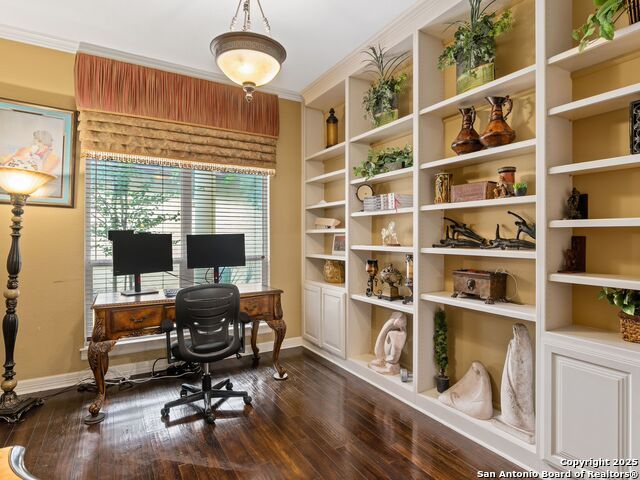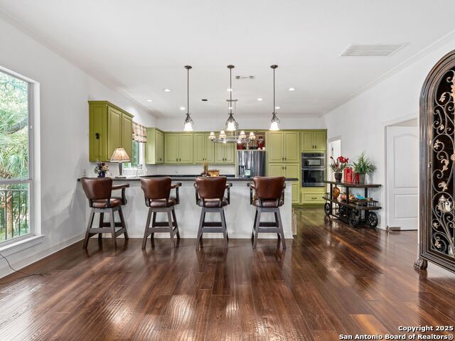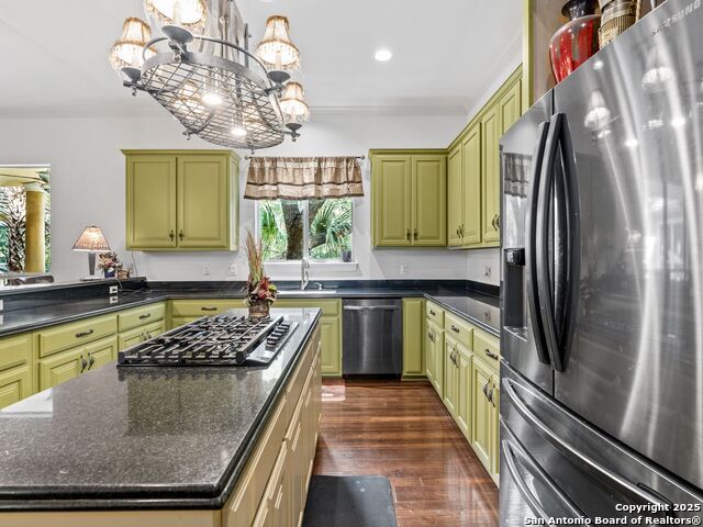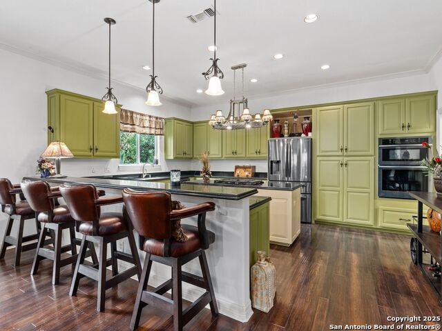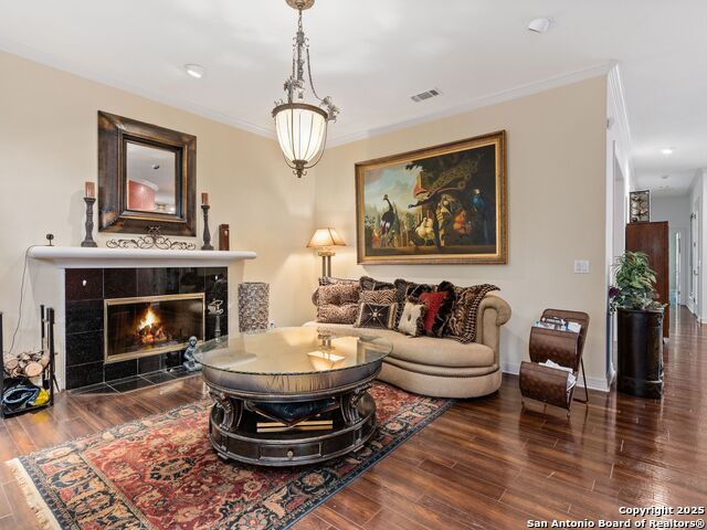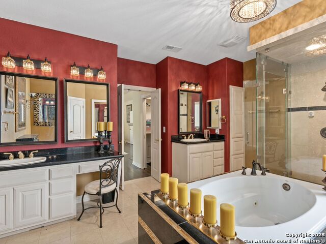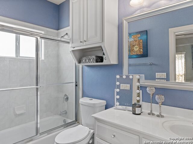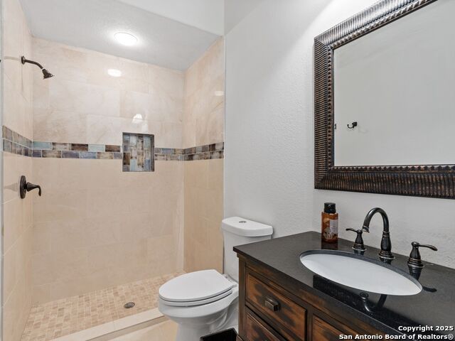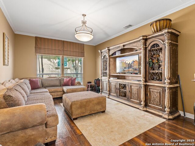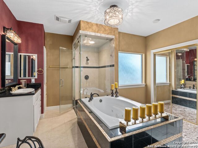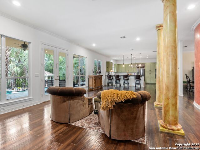 Elegant home tucked away on a quiet cul-de-sac in the prestigious guarded community of Elm Creek, offering the perfect blend of privacy, sophistication, and modern updates. Step into a grand foyer with soaring 24-foot ceilings, a dramatic double staircase, and a striking custom iron front door. The foyer is anchored by a beautiful fleur-de-lis chandelier, setting the tone for timeless elegance. The open floor plan flows effortlessly, showcasing two spacious living areas-one with a cozy wood-burning fireplace-plus a versatile media/game room equipped with a projector and movie-sized screen. The island kitchen features a breakfast bar and gas cooktop (replaced in 2024), ideal for casual dining and entertaining. The luxurious primary suite includes its own fireplace and access to a completely rebuilt balcony (2023) that spans the full width of the home. The spa-like primary bath offers a whirlpool tub for relaxation. All rooms throughout the home are generously sized, with fresh paint in the foyer and bathrooms, and the downstairs bathroom fully renovated. Extensive updates completed in 2024 include: new balcony, HVAC system, water heater, water softener, sprinkler system, ceiling fans, pool pump and heater, exterior paint, and more. Outdoors, enjoy your private oasis with a sparkling pool and spa, charming gazebo, covered deck, and a built-in BBQ pit perfect for entertaining. Mature trees and a stately iron fence provide shade and seclusion for gatherings large or small. This is Elm Creek living at its finest!