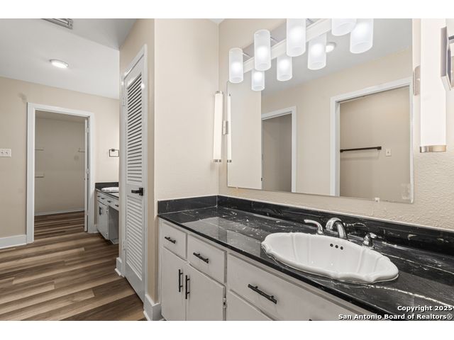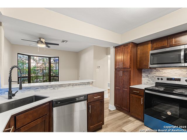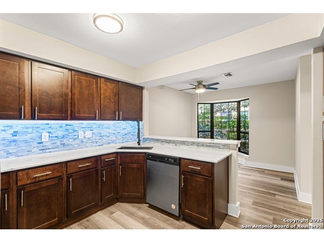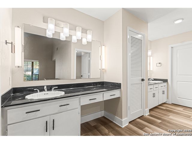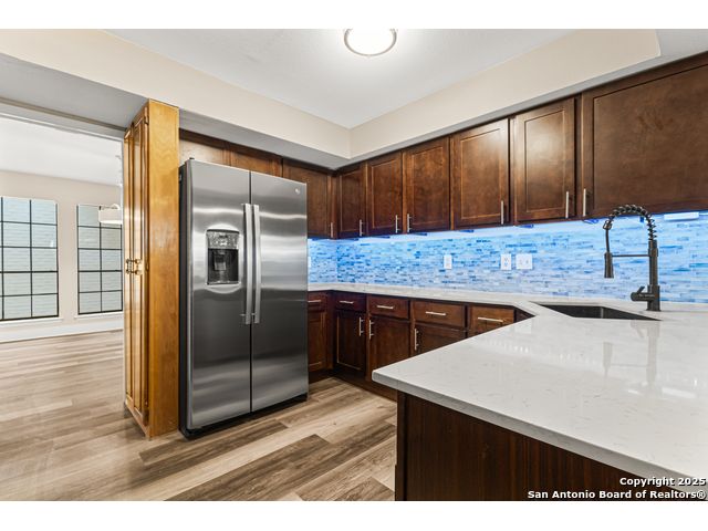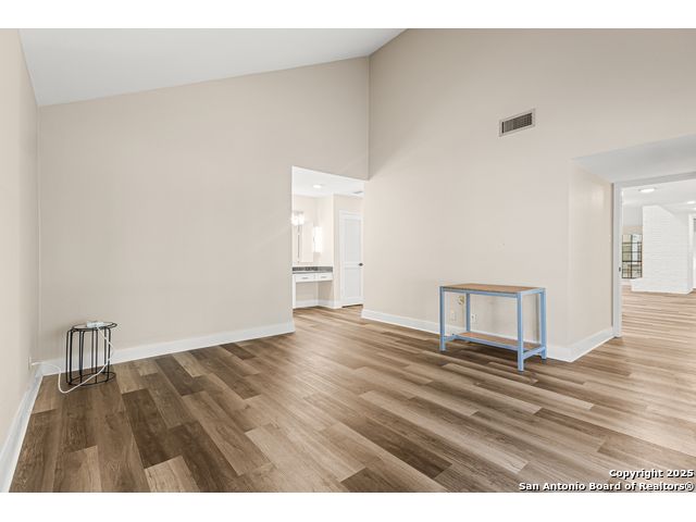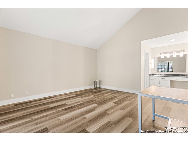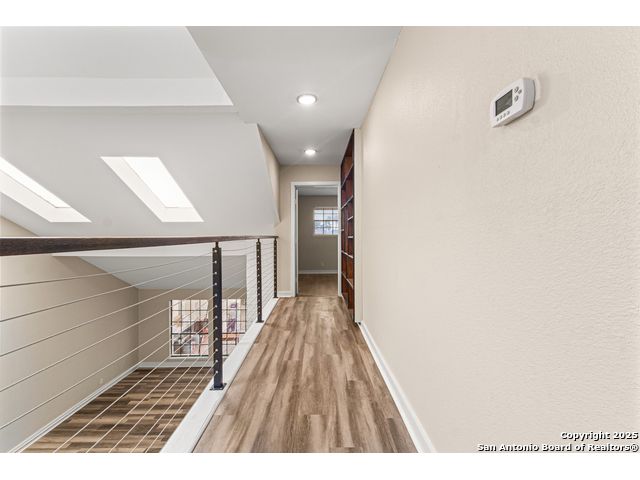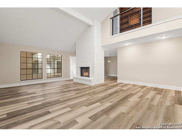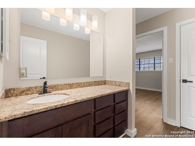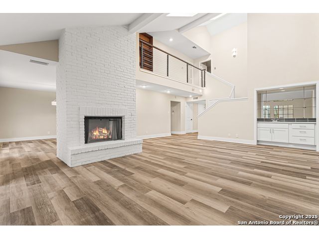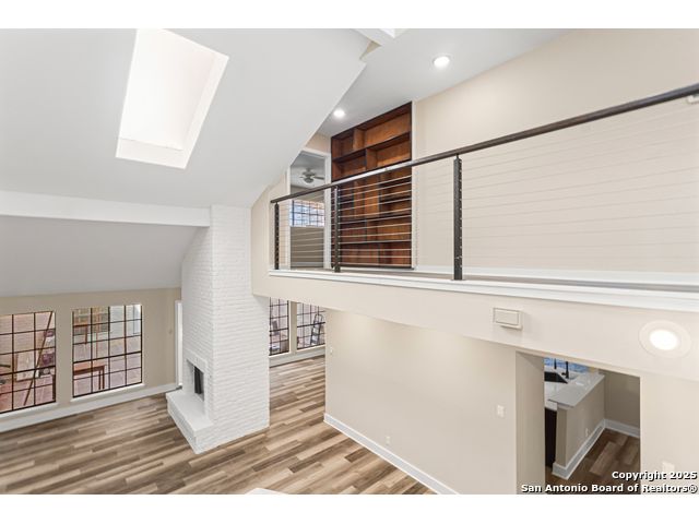 A rare, fully modernized townhouse in gated Idlewood within NEISD, offering unparalleled style and sophistication. The first-floor PRIMARY BEDROOM, dramatic living room with vaulted ceilings, fireplace, wet bar, and a stunning sunroom/terrace create the perfect setting for refined living. The chef-ready kitchen boasts custom cabinetry, granite countertops, and luxury vinyl plank flooring for effortless elegance. Upstairs features generous bedrooms and a versatile OFFICE / LOFT AREA ideal for work, media, or fitness. Skylights, bay windows, and an open layout flood the home with natural light, highlighting every high-end finish. Minutes from Northeast Baptist Hospital, about 8 miles to SAT, with quick access to Loop 410, Wurzbach Parkway, and U.S. 281 - schedule your private showing today and experience a one-of-a-kind residence.
