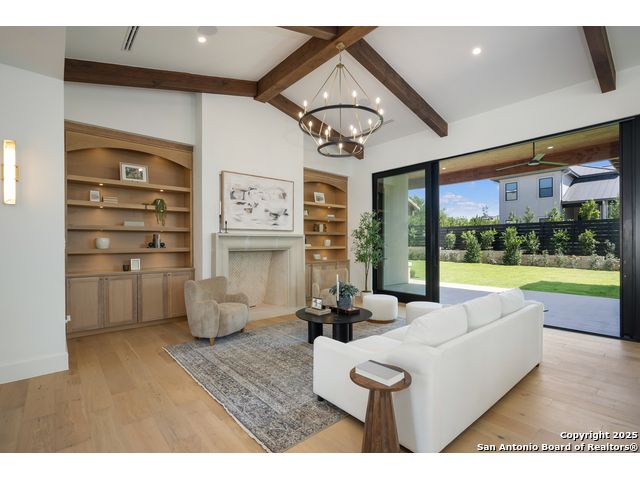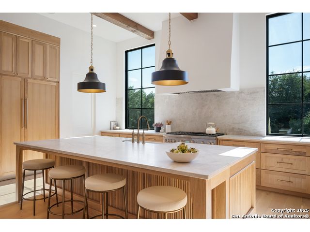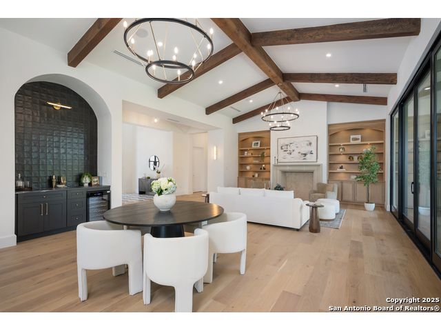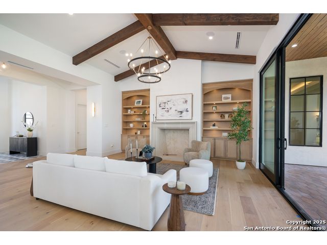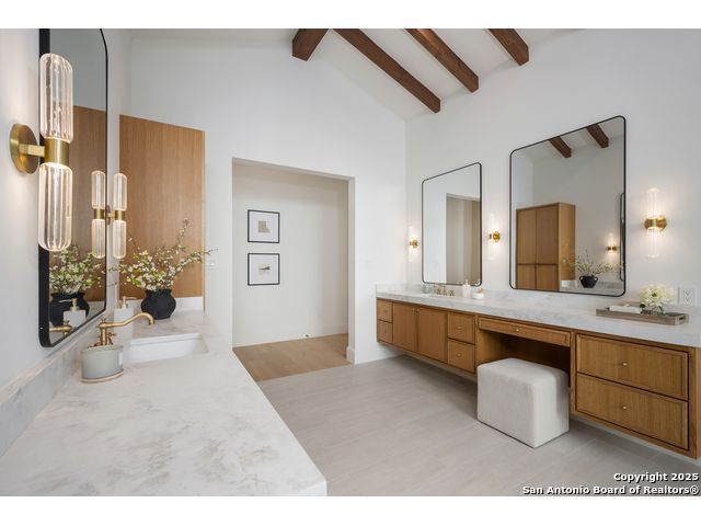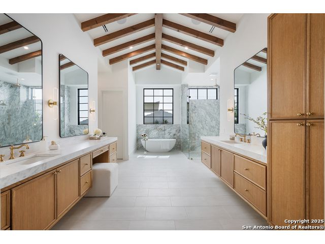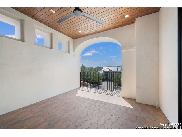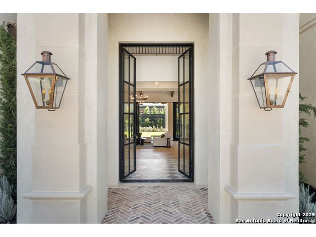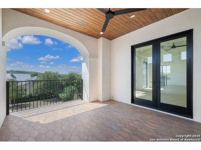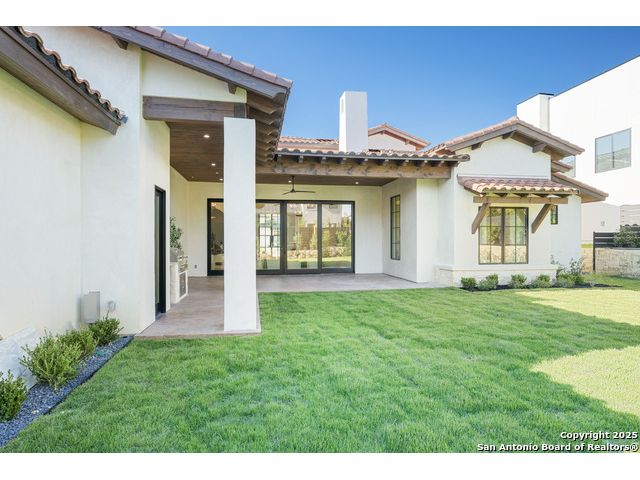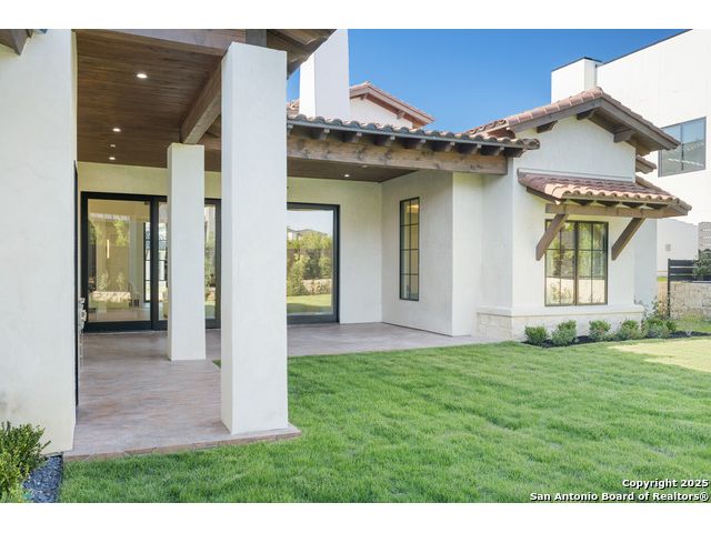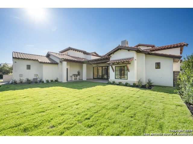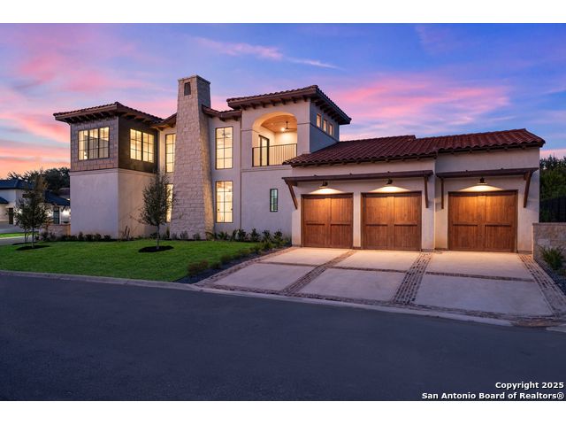 Meticulously designed by award-winning architect Oscar E. Flores and masterfully constructed by Magnolia Custom Homes, this Spanish architectural gem in The Bluffs Dominion is a rare expression of timeless elegance and modern luxury. Rising from a private corner lot, the residence stuns with its unique stucco facade, complemented by natural stone and metal accents. The grand entrance boats a brick-paved walkway and porch, a solid architectural cast-stone entry, 11 foot wrought-iron French doors crowned by Spanish tile roof with exposed rafter tails. The limestone and landscaping complete its commanding exterior presence. Beyond the grand entry, interiors unfold with soaring ceilings, Douglas Fir beams, white oak flooring in herringbone pattern, marble tile accents and smooth plastered walls enriched by alabaster, brass, and glass lighting. A custom bar with floating shelves, bold wall treatments, and coffered ceilings with integrated lighting throughout elevate every space with refinement. The chef's kitchen is a showpiece with reeded white oak cabinetry, a Taj Mahal quartzite island, matching stone backsplash, fluted glass cabinets, plastered vent hood, and a hidden butler's pantry with sink, counter space, and room for an additional refrigerator. Outfitted with professional-grade Thermador appliances- including a WiFi-enabled built in 48-inch refrigerator/ freezer columns, six-burner range with griddle and double gas oven, plus an additional built-in electrical wall oven, microwave, and paneled dishwasher. An apron sink, adorned with antique brass fixtures, frames a picturesque view into the living room, where a stately fire place and exquisite architectural detailing harmoniously tie the living room together. Retreat to the primary suite, a sanctuary of exposed beams, dual custom closets including secondary washer/dryer, a spa-worthy tub and high-design frame-less glass shower and custom floating vanities. Designated for seamless indoor/outdoor entertaining, the oversized sliding doors lead to a beautifully tiled sizable patio with Douglas Fir ceiling and beams, stone-clad BBQ grill, and an elegant exterior half bath. The generous square footage of the private level backyard with stone-tiered garden terraces and extensive landscaping provide and idyllic canvas for a custom swimming pool or resort-style retreat. The luxurious office features classic wall panel moldings, rich moody paint and custom lighting, plus a built-in 'secret' murphy book shelf leading to an substantially sized closet with room for a safe that adds a touch of modern sophistication. The downstairs guest suite indulges in serene views of the front courtyard, complemented by a show-stopping en-suite bathroom adorned with intricate marble mosaic tile, generous walk-in closet, and bespoke nickel fixtures that exude timeless sophistication. The second living upstairs showcase a stunning display of floor to ceiling windows and a Spanish-tiled balcony offers sweeping hilltop views. Two large upstairs bedrooms are accompanied by private walk-in closets and bathrooms, each thoughtfully finished with its own signature mix of marble, tile, and floating vanities- spaces as unique as the rooms they serve. The expansive three-car garage boats soaring ceilings, a built-in work bench and custom cabinetry, an additional storage closet, plus two electric car enabled charging outlets in total to offer maximum functionality and potential. Smart home features, Sonos sound systems, CAT-6 wiring, three HVAC units, and tankless water heaters ensure modern convenience throughout this brand new construction residence. With every detail curated to embody the romance of Spanish architecture combined with sophistication of contemporary luxury, this estate is a crown jewel within the gates of the Dominion.