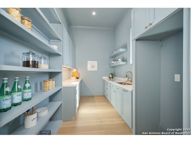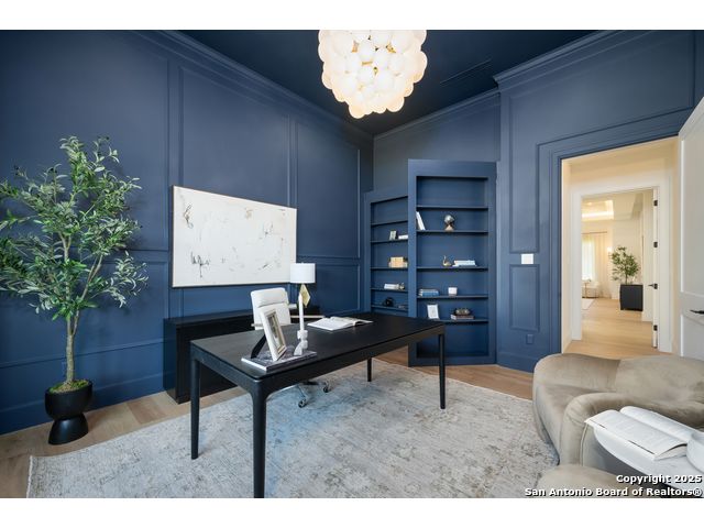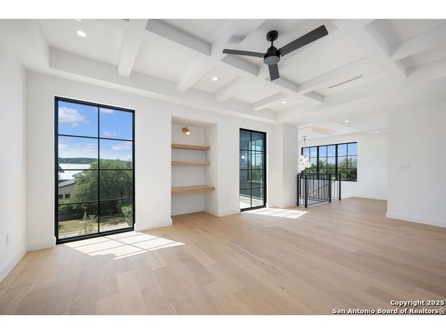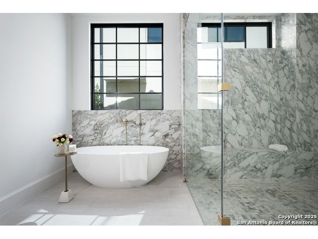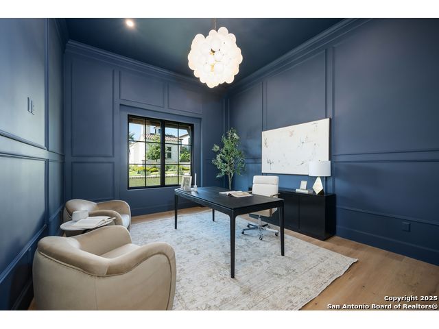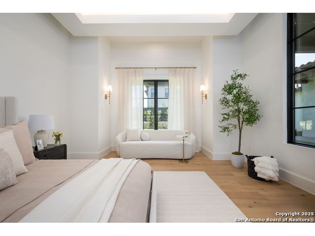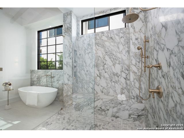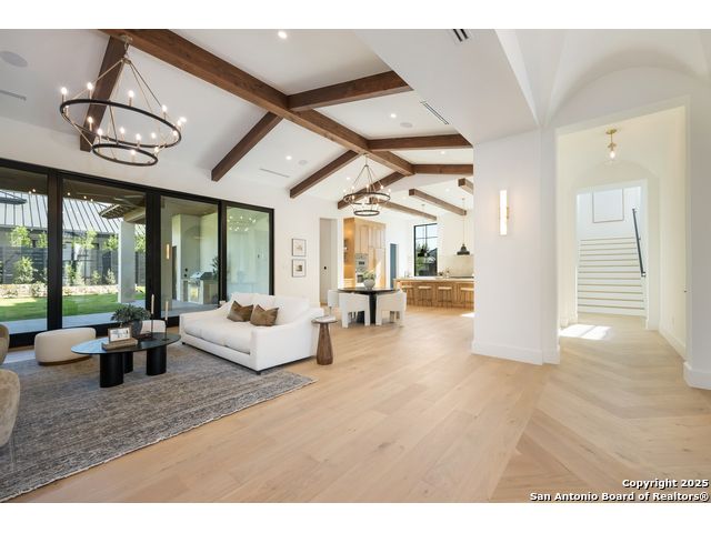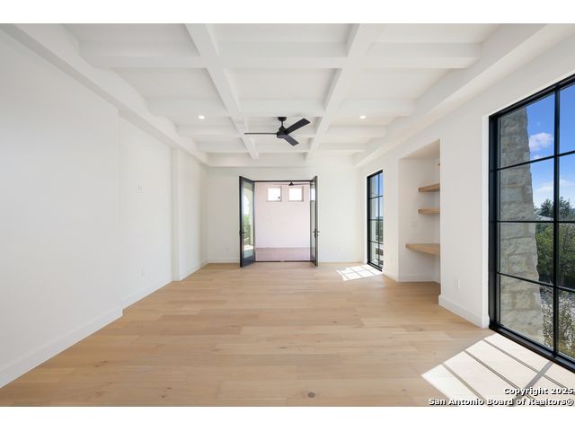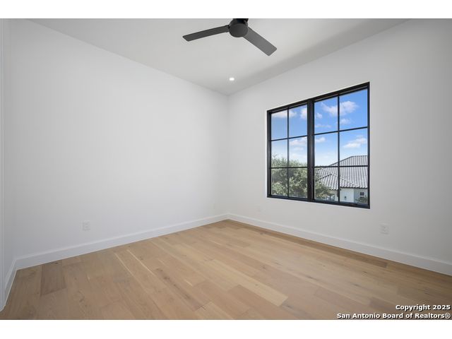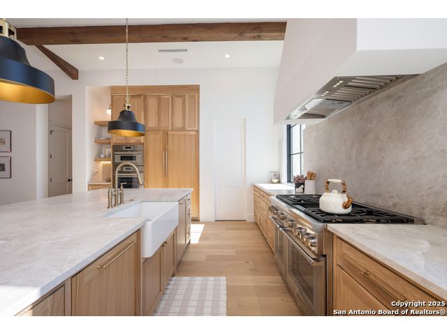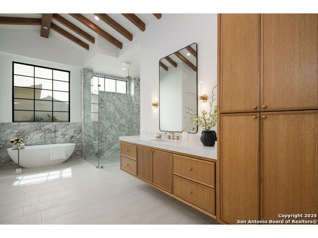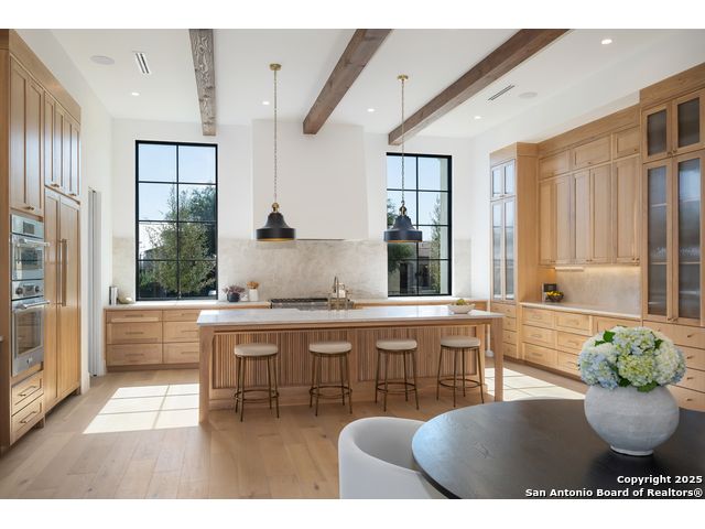 Meticulously designed by award-winning architect Oscar E. Flores and masterfully constructed by Magnolia Custom Homes, this Spanish architectural gem in The Bluffs Dominion is a rare expression of timeless elegance and modern luxury. Rising from a private corner lot, the residence stuns with its unique stucco facade, complemented by natural stone and metal accents. The grand entrance boats a brick-paved walkway and porch, a solid architectural cast-stone entry, 11 foot wrought-iron French doors crowned by Spanish tile roof with exposed rafter tails. The limestone and landscaping complete its commanding exterior presence. Beyond the grand entry, interiors unfold with soaring ceilings, Douglas Fir beams, white oak flooring in herringbone pattern, marble tile accents and smooth plastered walls enriched by alabaster, brass, and glass lighting. A custom bar with floating shelves, bold wall treatments, and coffered ceilings with integrated lighting throughout elevate every space with refinement. The chef's kitchen is a showpiece with reeded white oak cabinetry, a Taj Mahal quartzite island, matching stone backsplash, fluted glass cabinets, plastered vent hood, and a hidden butler's pantry with sink, counter space, and room for an additional refrigerator. Outfitted with professional-grade Thermador appliances- including a WiFi-enabled built in 48-inch refrigerator/ freezer columns, six-burner range with griddle and double gas oven, plus an additional built-in electrical wall oven, microwave, and paneled dishwasher. An apron sink, adorned with antique brass fixtures, frames a picturesque view into the living room, where a stately fire place and exquisite architectural detailing harmoniously tie the living room together. Retreat to the primary suite, a sanctuary of exposed beams, dual custom closets including secondary washer/dryer, a spa-worthy tub and high-design frame-less glass shower and custom floating vanities. Designated for seamless indoor/outdoor entertaining, the oversized sliding doors lead to a beautifully tiled sizable patio with Douglas Fir ceiling and beams, stone-clad BBQ grill, and an elegant exterior half bath. The generous square footage of the private level backyard with stone-tiered garden terraces and extensive landscaping provide and idyllic canvas for a custom swimming pool or resort-style retreat. The luxurious office features classic wall panel moldings, rich moody paint and custom lighting, plus a built-in 'secret' murphy book shelf leading to an substantially sized closet with room for a safe that adds a touch of modern sophistication. The downstairs guest suite indulges in serene views of the front courtyard, complemented by a show-stopping en-suite bathroom adorned with intricate marble mosaic tile, generous walk-in closet, and bespoke nickel fixtures that exude timeless sophistication. The second living upstairs showcase a stunning display of floor to ceiling windows and a Spanish-tiled balcony offers sweeping hilltop views. Two large upstairs bedrooms are accompanied by private walk-in closets and bathrooms, each thoughtfully finished with its own signature mix of marble, tile, and floating vanities- spaces as unique as the rooms they serve. The expansive three-car garage boats soaring ceilings, a built-in work bench and custom cabinetry, an additional storage closet, plus two electric car enabled charging outlets in total to offer maximum functionality and potential. Smart home features, Sonos sound systems, CAT-6 wiring, three HVAC units, and tankless water heaters ensure modern convenience throughout this brand new construction residence. With every detail curated to embody the romance of Spanish architecture combined with sophistication of contemporary luxury, this estate is a crown jewel within the gates of the Dominion.