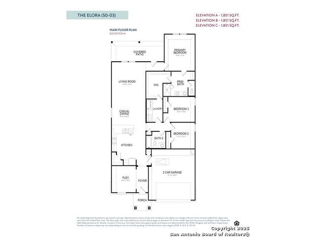 The Elora floorplan is a beautifully crafted single-story home offering 1,851 square feet of flexible, modern living. This three-bedroom, two-bath layout features a bright open-concept living room and casual dining area that seamlessly flow into a designer kitchen, complete with a large island and walk-in pantry. A flex room near the front entry provides the perfect space for a home office, gym, or reading nook. The private primary suite is tucked at the rear of the home and includes a large walk-in closet and spa-style bath with dual vanities and a glass-enclosed tiled shower. Two secondary bedrooms are thoughtfully placed near a full bath, making this layout ideal for families or guests. The covered patio expands the living space outdoors, while a spacious laundry room and two-car garage add daily convenience. Premium finishes like quartz countertops, shaker cabinetry, and Moen chrome fixtures complement energy-saving upgrades such as a tankless water heater, radiant barrier decking, and a SEER 2 Lennox HVAC system