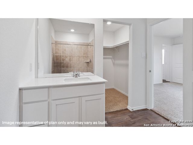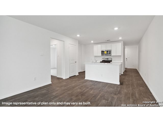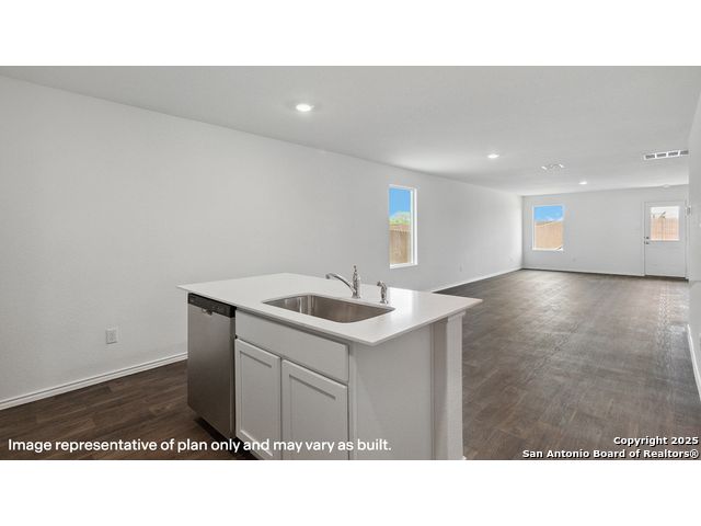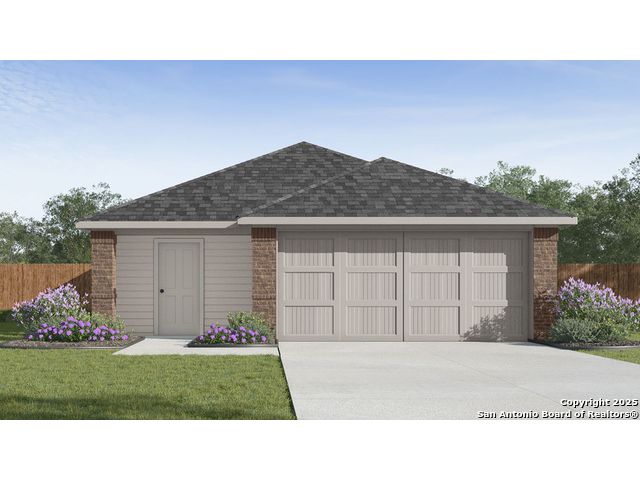 The Caprock is a charming one-story home featured at Sereno Springs in Converse, TX. Featuring 2 classic front exteriors, this 3 bedroom, 2 bathroom home also offers 1435 square feet of living space and a 2-car garage. A front porch (per plan) welcomes you into the home and opens to the gourmet kitchen which includes quartz counter tops, quality cabinets, stainless steel appliances and an open concept floorplan with the kitchen flowing seamlessly into the dining room and living room. The main bedroom has an attractive ensuite bathroom that features a quartz vanity countertop and quality cabinetry. Enjoy additional storage with a spacious walk-in closet located off of the primary bathroom. Your secondary bedrooms all feature quality carpet flooring and a closet, and can be used as bedrooms, offices, work out spaces or other bonus rooms. The possibilities are endless with The Caprock floor plan. Additional features include sheet vinyl flooring in entry, living room, and all wet areas, quartz counter tops in all bathrooms and HOME IS CONNECTED base package. Using one central hub that talks to all the devices in your home, you can control the lights, thermostat and locks, all from your cellular device.