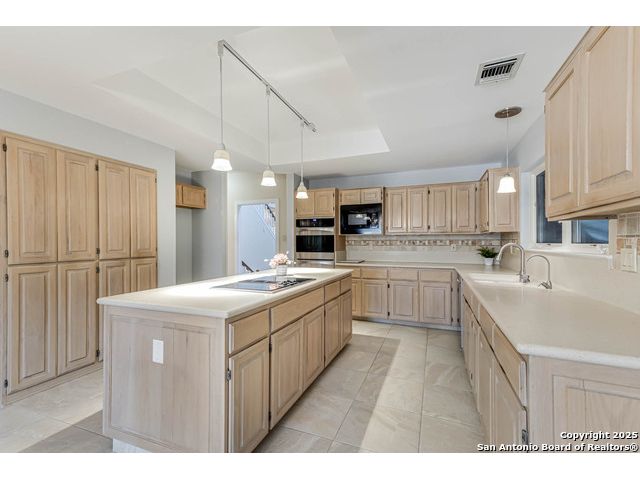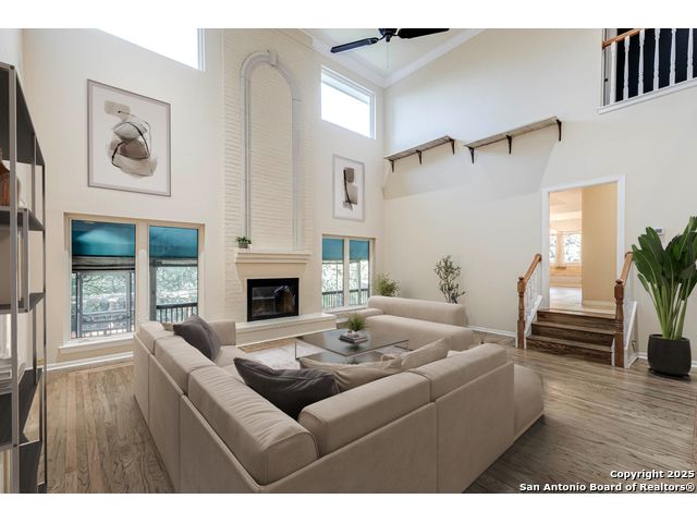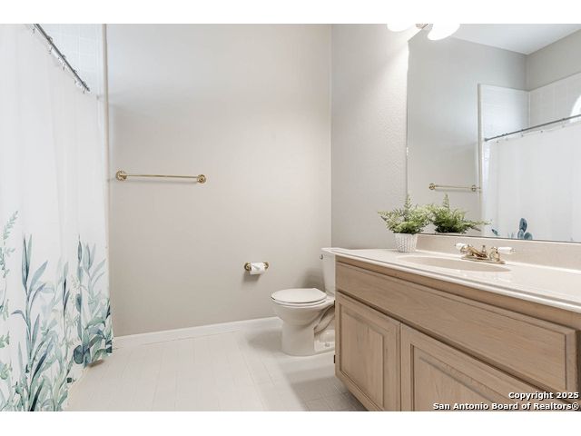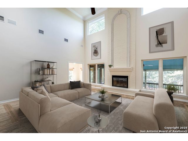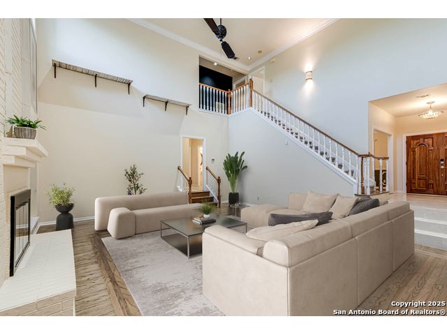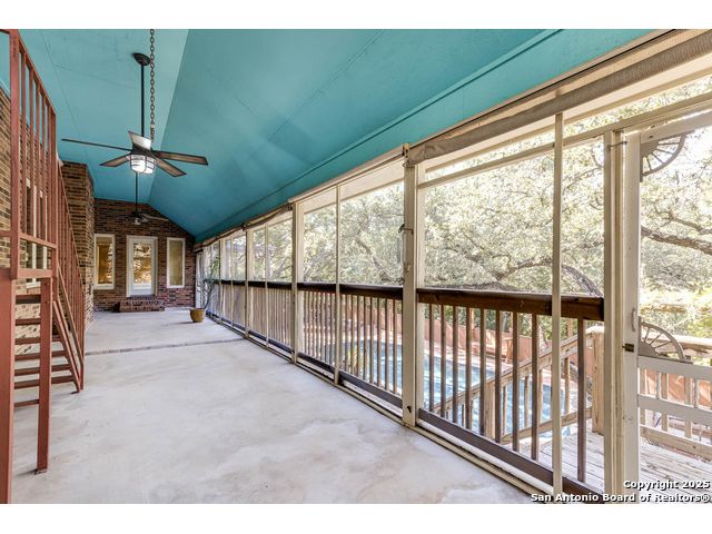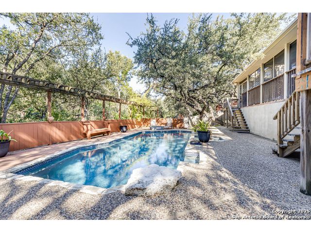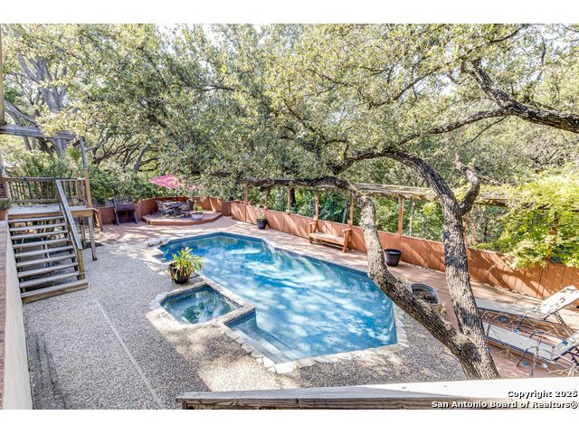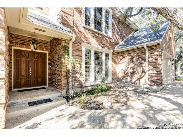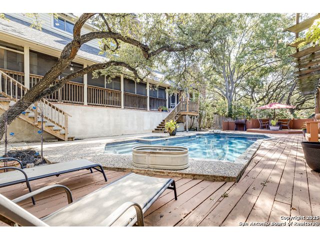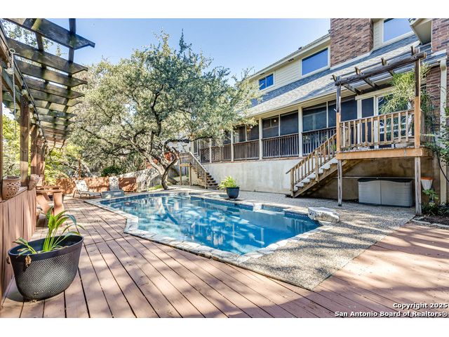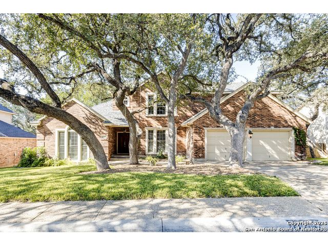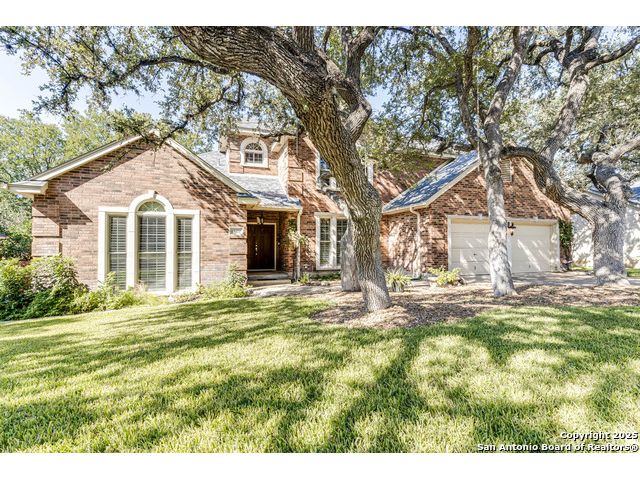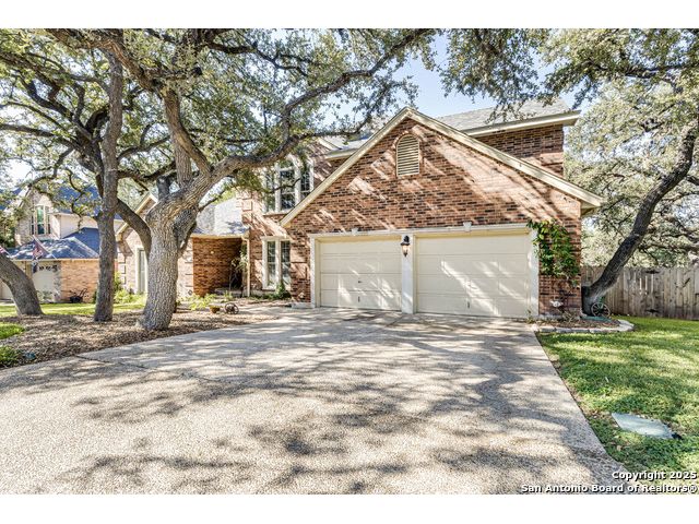 Set among mature oak trees and backing up to a serene greenbelt, this stunning brick home offers timeless curb appeal and a thoughtfully designed THREE-STORY floor plan. The main level features a spacious kitchen with island, double ovens, and abundant cabinetry, opening to the dining and living areas. The primary suite is also on the main floor, showcasing a spa-inspired bath with soaking tub, glass-enclosed shower, dual vanities, and elegant finishes. An open flex space adds versatility for work, study, or hobbies. The second level provides three generously sized bedrooms and two full baths, creating comfortable accommodations for family and guests, while the third floor offers a large game/media room - the perfect space for entertainment, hobbies, or a private retreat. The backyard is a true oasis with a screened-in patio, expansive deck, and sparkling pool. Surrounded by mature trees and designed with multiple seating areas, it's ideal for entertaining or unwinding at home. Located in the desirable Deerfield community, residents enjoy neighborhood amenities including a pool, tennis courts, clubhouse, playground, and BBQ area. Deerfield also benefits from SAPD OFFICERS PATROL, providing enhanced community security. With three convenient entrances off Huebner, Blanco, and Bitters, you'll have easy access in and out of the neighborhood. This Deerfield gem offers the perfect blend of flexible living spaces, outdoor enjoyment, and a secure, community-focused lifestyle.