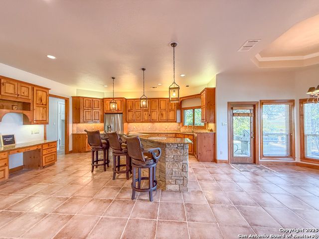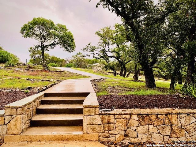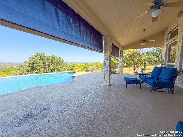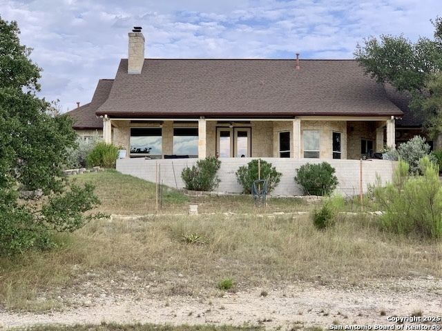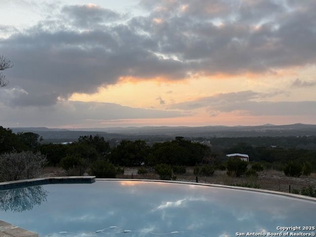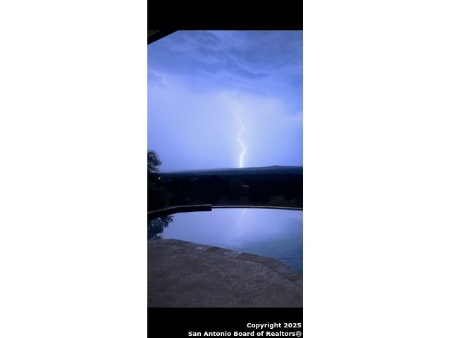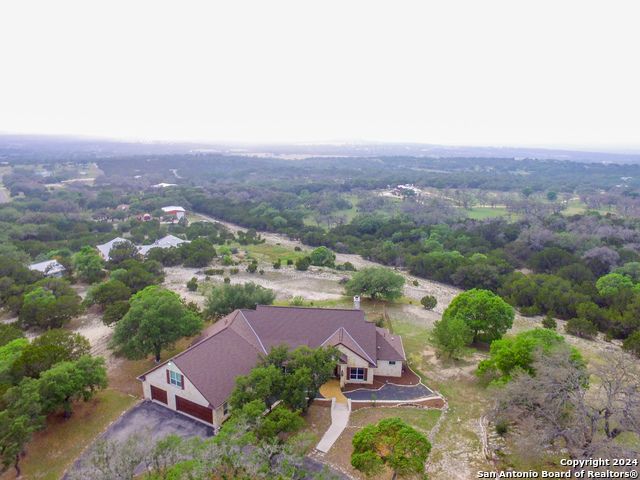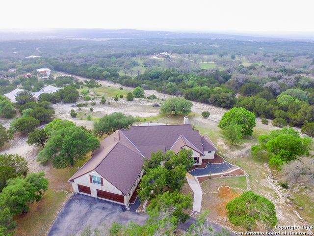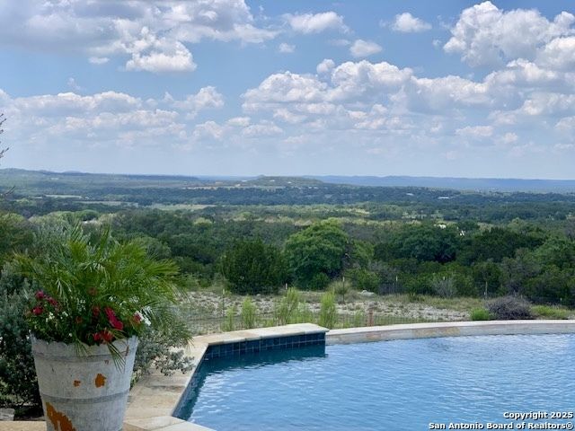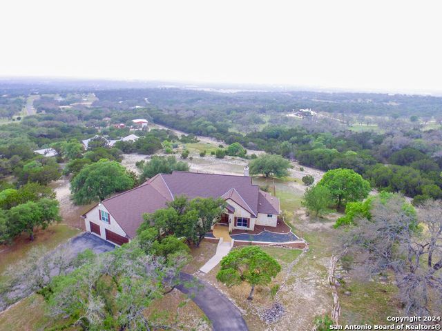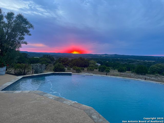 If you are looking for a prime hill country oasis with unbelievable, unobstructed, long range, GORGEOUS hill country views, then you have just found a once in a lifetime property! Once you enter the private automatic gate, the long winding drive will lead you to this beautiful custom home which is nestled towards the back of an oak studded 5 -acre lot. Open the freshly refinished front door of this beautiful rustic stone home, with heart pine floors, and you will encounter breathtaking hill country views from the wall of large picture windows in the living room. There are incredible views from every angle in this home, and it's a good thing because whether you are waking up to a beautiful sunrise, relaxing on the patio with dual ceiling fans and a cool drink in your hand, lounging in the pool, or preparing a delicious meal in the gourmet kitchen with Bosch and Jenn-Air appliances, you will never cease to be amazed by the stunning sunsets and brilliant star studded nights with the occasional shooting star in the night sky. When you're ready to retire to the primary suite, you will be delighted by the 100 percent hypoallergenic, odor neutralizing carpet from Home Fresh Line. The luxurious primary bathroom has recently been remodeled with new flooring, light fixtures, and boasts an incredible 5x7 walk in shower with a 5x5 rainfall encased window. Off the primary master bathroom is a California walk- in closet with built in shelving and drawers. There is also a hideaway area beside the shower that would accommodate a safe or extra storage if needed. The secondary bedrooms are also spacious and offer a jack and jill bath with rainfall encased window. This home has a large study that could easily be a 4th bedroom if necessary. Above the garage is a climate controlled loft which is perfect for extra guests, or a hobby/workout room. The open living room with soaring ceilings and floor to wall stacked stone fireplace is both inviting and cozy. This home is absolutely move in ready with remodeled features, and freshly painted interior with recently installed upgraded carpet. With every season that passes, this home will reveal truly awe inspiring moments that will help you see and appreciate all the beauty that the Texas Hill Country has to offer! Welcome Home!