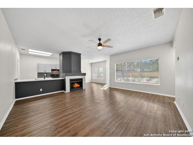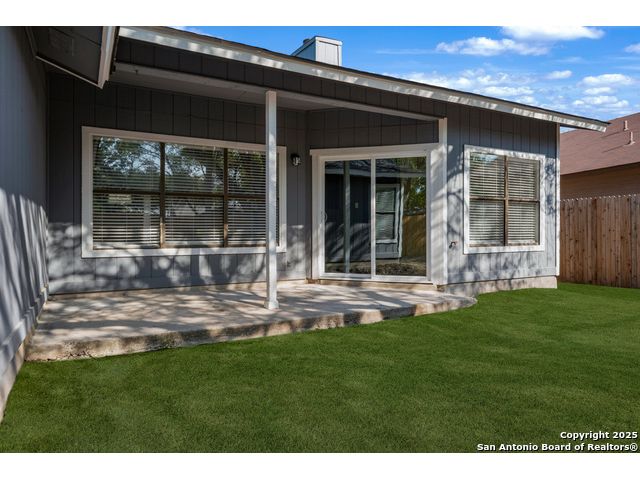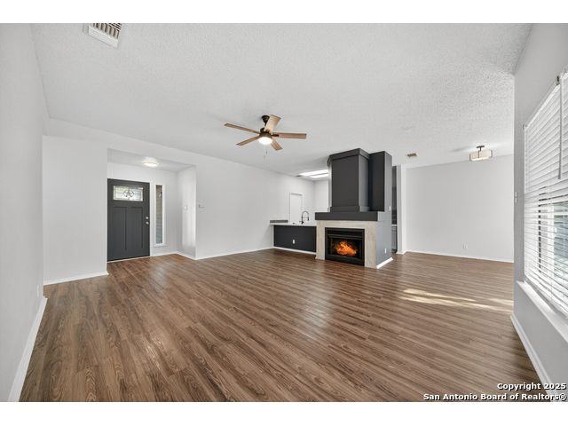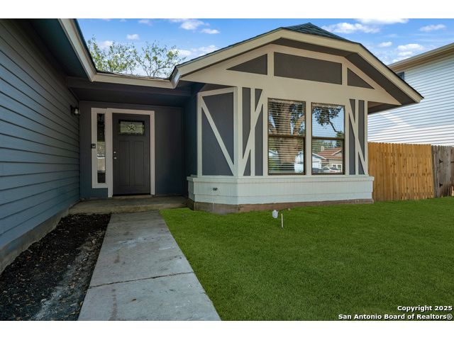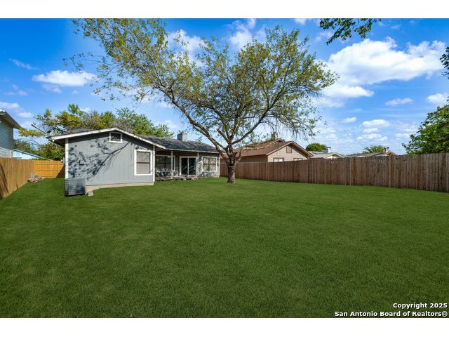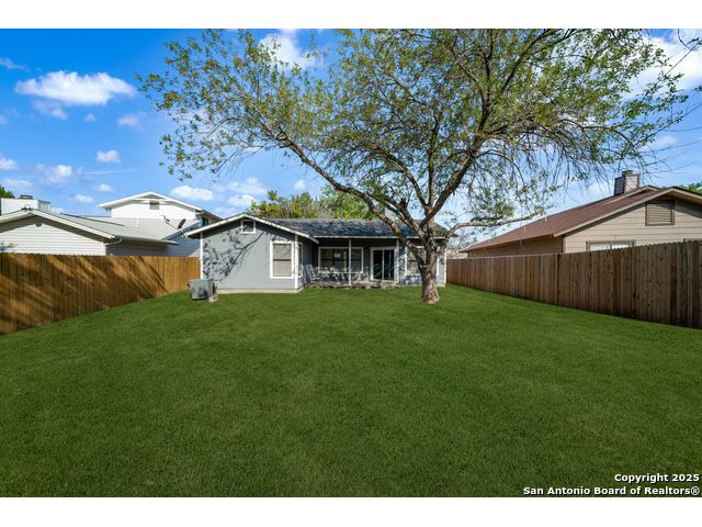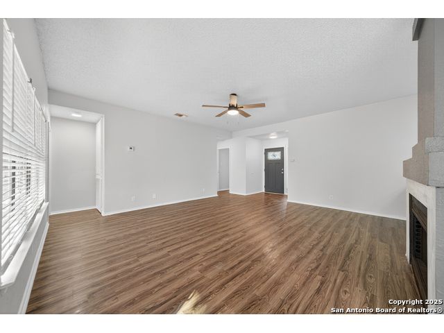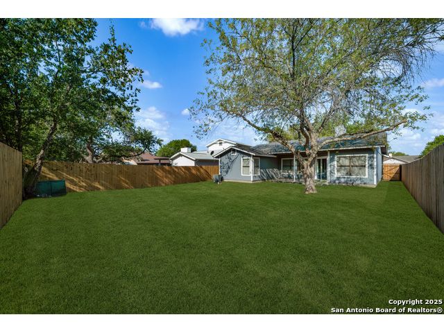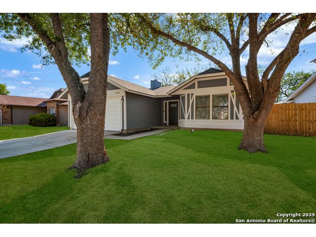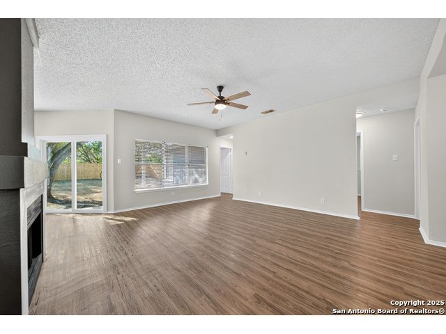 This is the home you've been searching for! Remodeled and move-in ready, this stunning single-story home offers 3 spacious bedrooms, 2 full baths, and a bright, modern interior. Inside, a wall of windows across the back fill the open living area with natural light, complemented by beautiful finishes like new luxury vinyl plank flooring (no carpet!), and neutral paint. The stylish kitchen opens to the spacious family room with a wood-burning fireplace and sliding glass doors to the backyard, and includes quartz countertops with custom backsplash, black appliances, grey cabinetry, and a breakfast bar. Both bathrooms have been tastefully updated with quartz counters, new vanity cabinets, under-mount sinks, framed mirrors, custom tile surrounds, and new fixtures. Outside, enjoy a spacious backyard with new privacy fence and covered patio, plus mature trees in the front and back, offering shade and curb appeal. The roof was replaced just 7 years ago, and the water heater is new, offering peace of mind and added value for years to come. This home is located in a well-maintained, walkable neighborhood just blocks from Spring Meadow Elementary and Ventura Community Pool. With nearby shopping, restaurants, and coffee shops-and only about 12 miles from downtown San Antonio-this one checks all the boxes!
