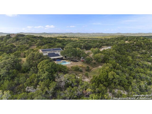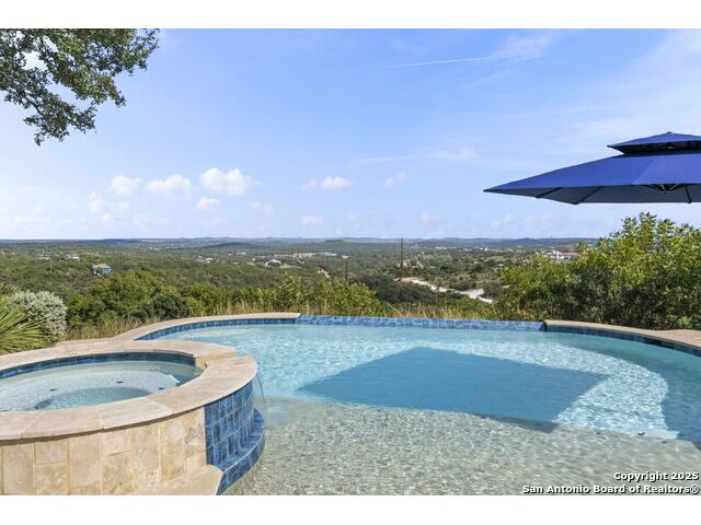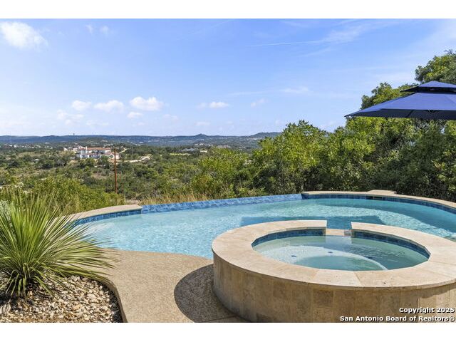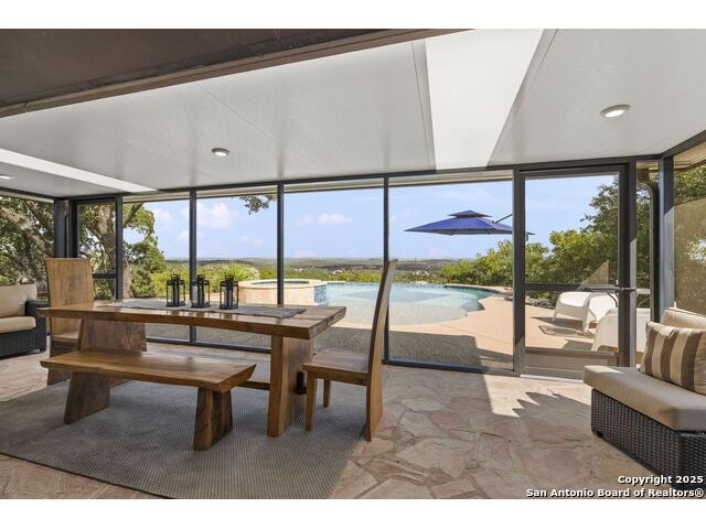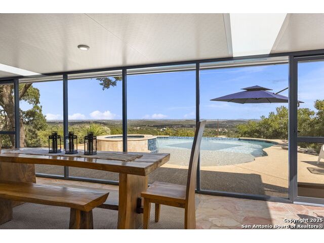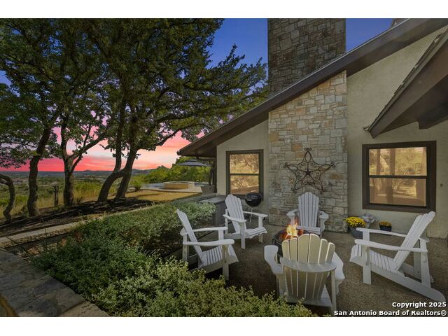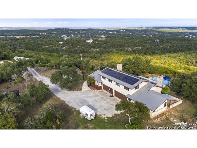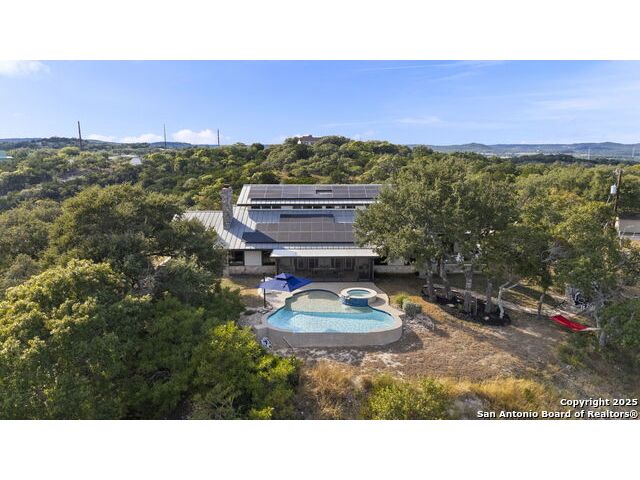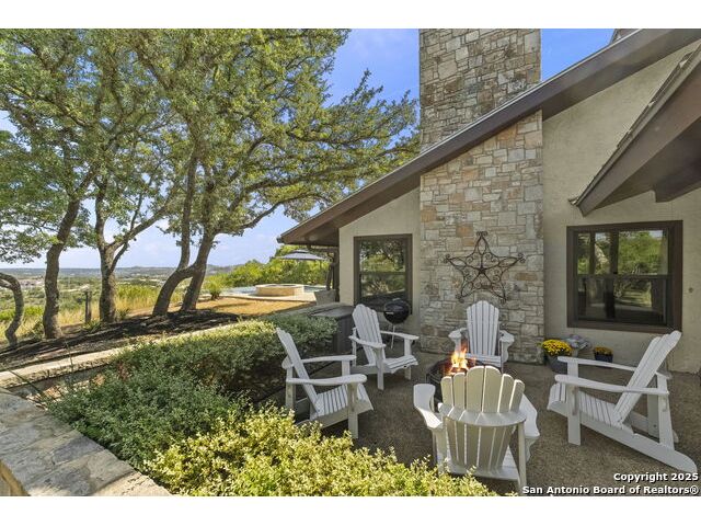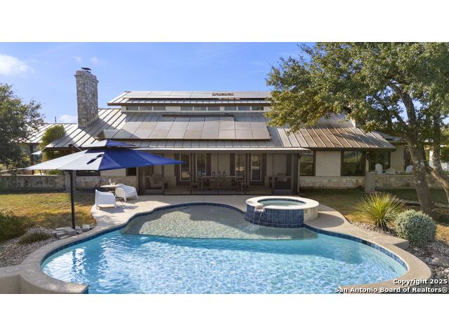 HILL COUNTRY RETREAT WITH PANORAMIC VIEWS, DUAL LIVING SPACES AND TINY HOME -- Perched on a private hilltop with absolutely breathtaking panoramic views, this 3,519 sq. ft. newly renovated stone and stucco duplex offers the perfect blend of privacy, versatility, and timeless Hill Country charm. Situated on 4.95 acres, this one-of-a-kind property is ideal for multigenerational living, guest accommodations, or income potential with two fully independent residences under one roof. UNIT A features two master suites, 2.5 baths, and a private 225 sq. ft. outdoor terrace. UNIT B offers one master suite, two additional bedrooms, 2.5 baths, and its own 225 sq. ft. outdoor terrace. Both residences welcome you with Saltillo-tiled entries that open into expansive living and dining areas, each anchored by a dramatic floor-to-ceiling rock fireplace. At the heart of each home lies a beautifully updated kitchen with custom soft-close cabinetry, high end countertops, designer lighting, and high-end finishes-perfect for everyday living or entertaining in style. Spacious master suites on both sides provide updated spa-inspired baths, private laundry closets, and direct access to sweeping Hill Country views. A screened-in 250 sq. ft. porch connects the two units and overlooks a sparkling pool and hot tub, creating a shared oasis for relaxation, fun, and entertaining. Enjoy quiet mornings, vibrant sunsets, abundant wildlife, and even Fiesta fireworks from the privacy of your own hilltop retreat. Energy efficiency comes built-in with a durable metal roof and 86 ION solar panels (installed in 2019). Adding even more versatility, a fully functional tiny home sits on the property-perfect for guests, extended family, a private office, or an income opportunity. Tucked away at the end of a private road, this residence provides the serenity of country living while being just 15 minutes from Downtown Boerne and Leon Springs, and only 20-30 minutes from San Antonio's modern conveniences. Whether you're gathering family under one roof, welcoming guests, or simply seeking a private Hill Country escape, this retreat offers a rare opportunity to experience Texas living at its finest. Award-winning Boerne School District, voluntary HOA fee of $400 for garbage, and NO city taxes!