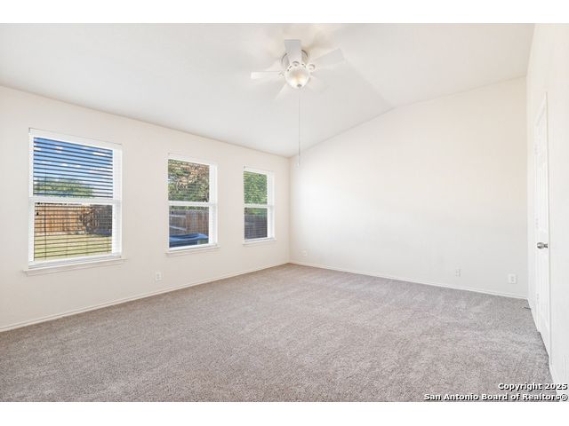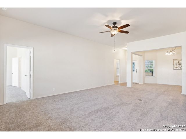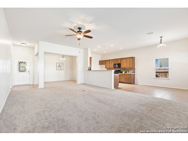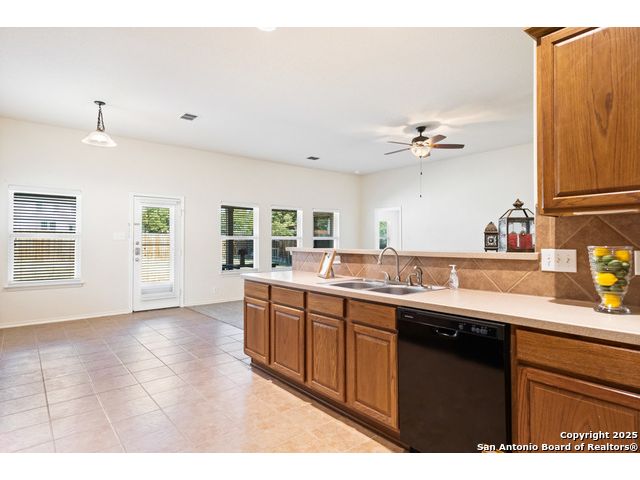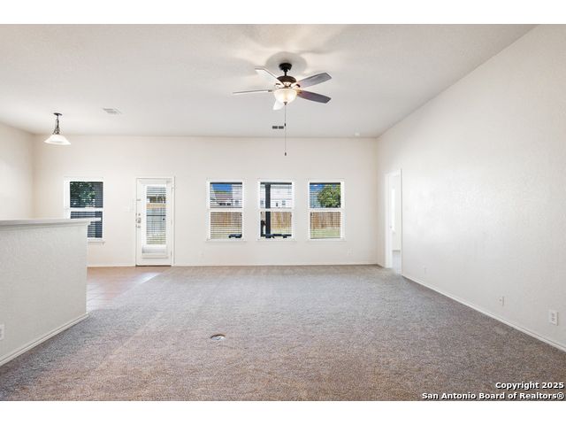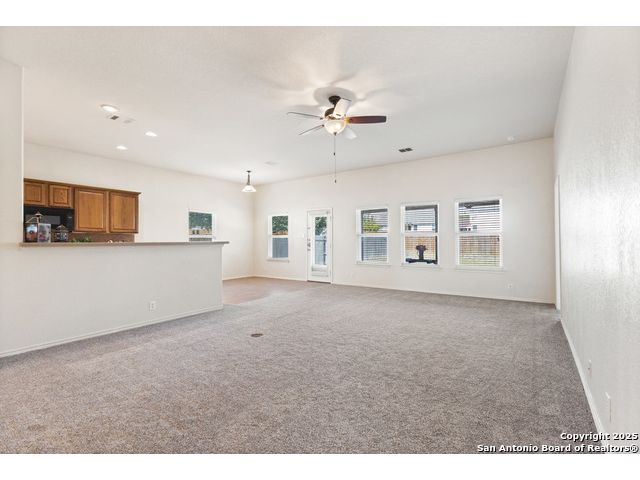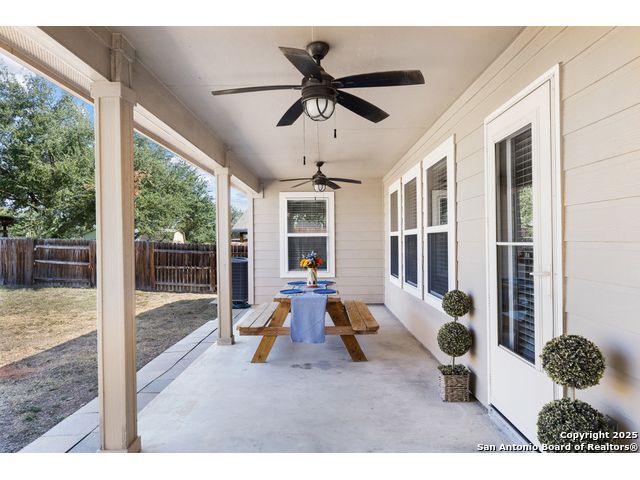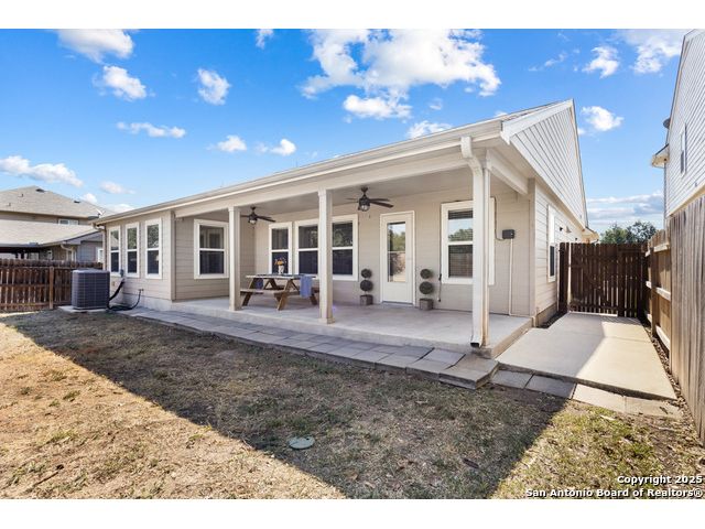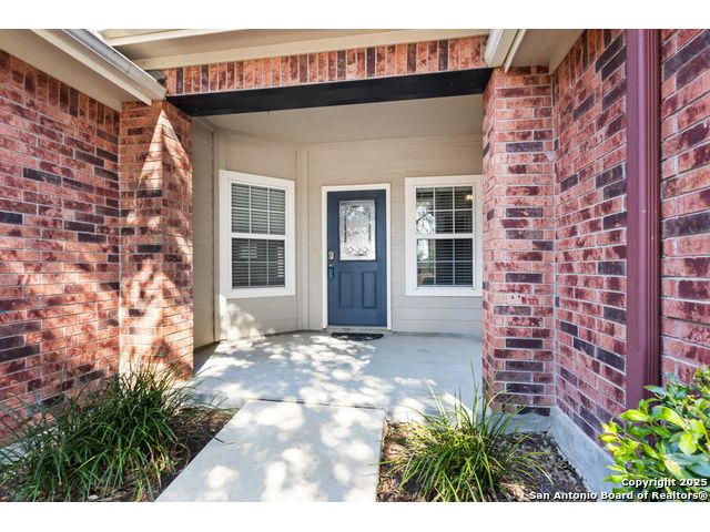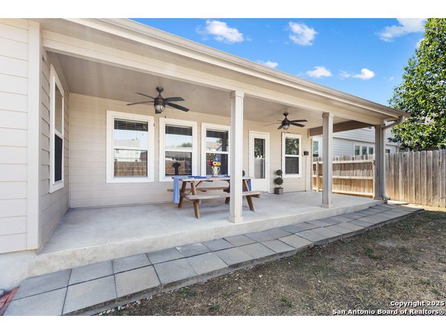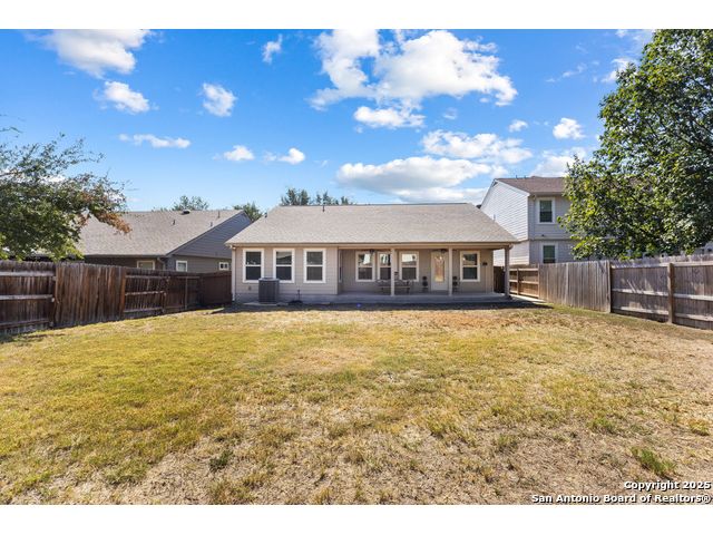 Welcome to this beautifully maintained Ryland-built home located in the sought-after Bentwood Ranch community. Situated on a level lot with no steps, this 3-bedroom, 2-bathroom residence features an open-concept layout and elevated ceilings throughout, offering both comfort and style. The spacious living area is ideal for entertaining and flows seamlessly into two dining spaces-breakfast and formal (or use for a study/2nd living space) - adjacent to a galley-style kitchen. The kitchen is equipped with all new appliances (oven, dishwasher & microwave Sept. 2025), 42" cabinets, recessed lighting and Corian countertops. The private primary suite is filled with natural light from four large windows and features high ceilings, a walk-in closet, dual sinks, and both a shower and garden tub. Two additional bedrooms and a full bath with a tub/shower combo are located at the front of the home-perfect for guests or family members. In the spacious backyard, you'll appreciate the large covered patio with 2 ceiling fans. Additional highlights include: Fresh interior paint and deep cleaning throughout, recent roof 2023, new carpet installed Sept. 2025, multiple ceiling fans, large pantry space, exterior gutters, convenient concrete sidewalk on side of home, xeriscaped front yard for easy yard maintenance, an easement separating homes from behind & partial fence replacement 2023. Located in the highly rated SCUCISD school district. Community amenities include a pool, sport courts, park, and playground.