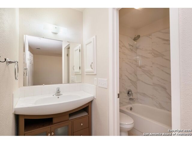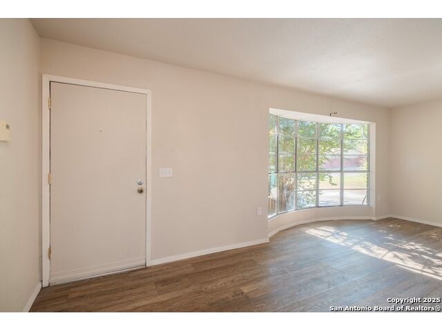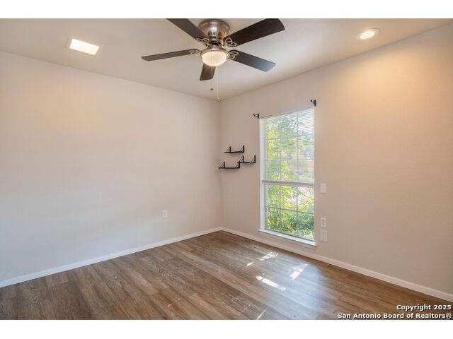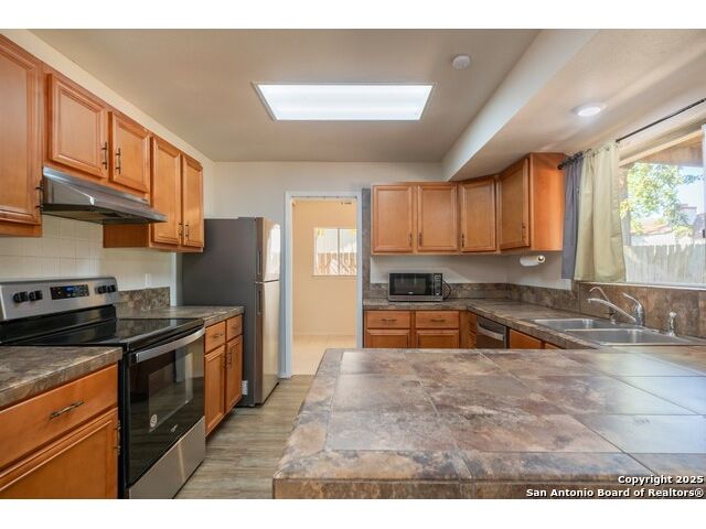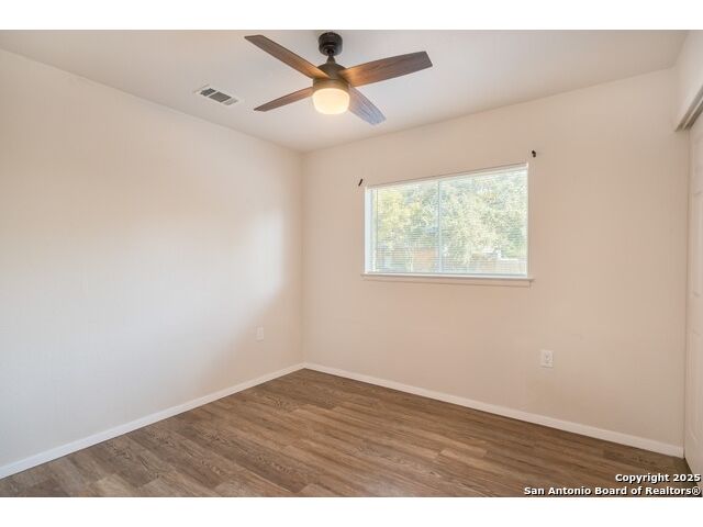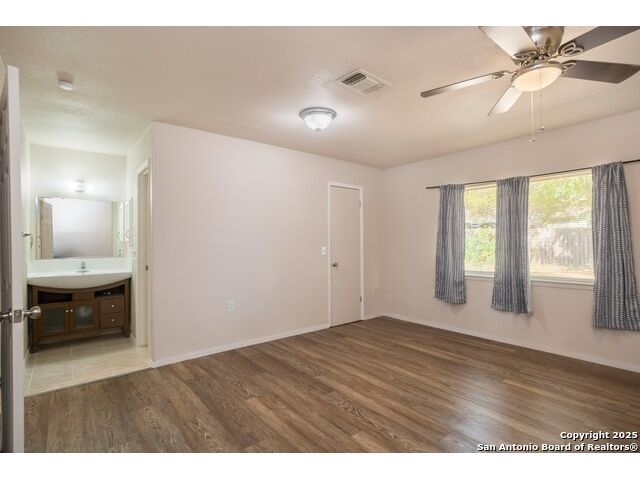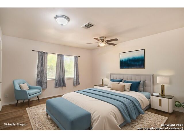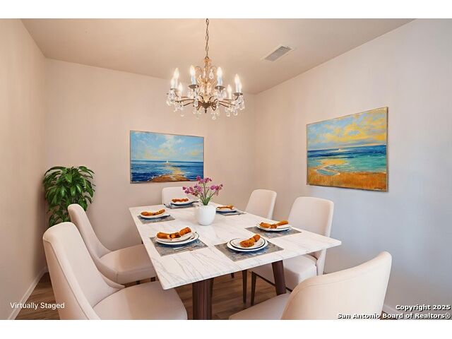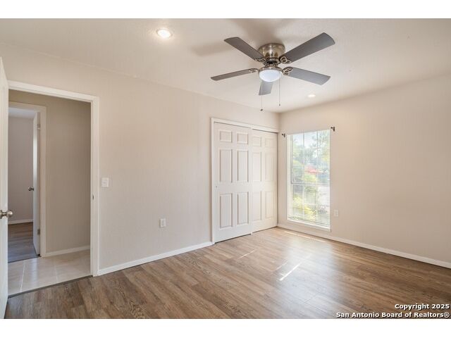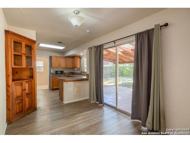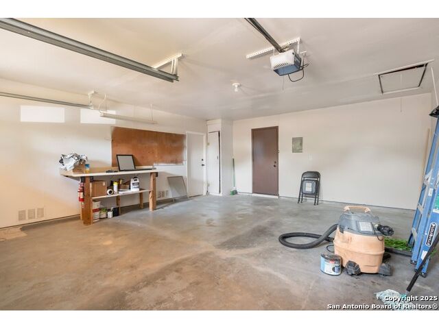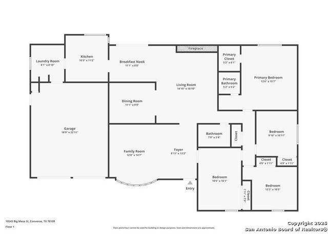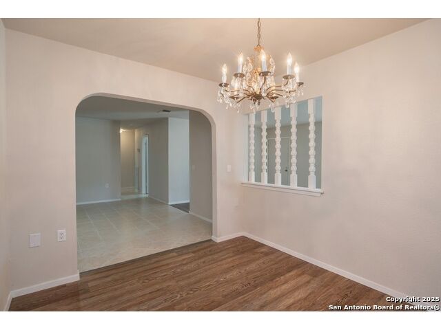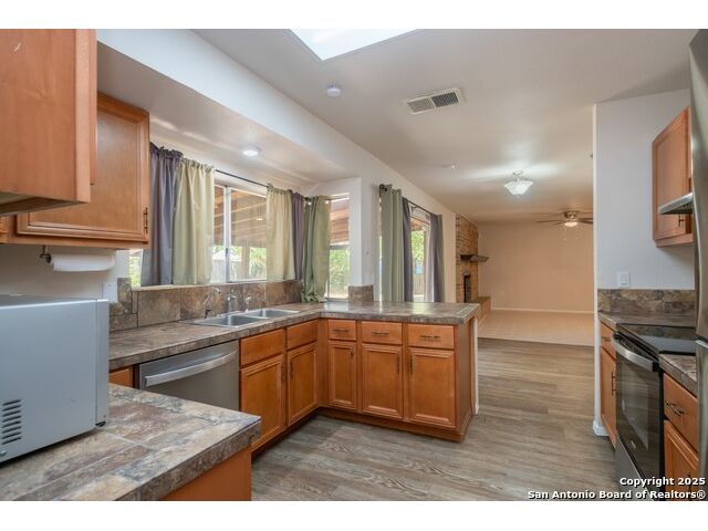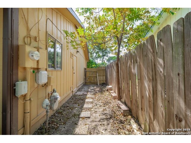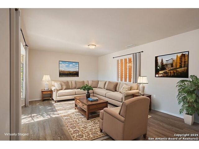 Welcome to this vacant 4-bedroom, 2-bath home offering 1,694 sq. ft. of living space in the desirable Cimarron subdivision. Set on a spacious 0.24-acre corner lot, this single-story home combines comfort, function, and convenience. The thoughtful floor plan is designed for flexibility. The foyer opens to a family room, while the living room serves as the heart of the home with a cozy brick fireplace. The kitchen includes an eat-in breakfast nook that seamlessly connects to the living room and provides direct access to the backyard for easy indoor-outdoor gatherings. The laundry room is conveniently located off the kitchen and accessible through the attached 2-car garage. The private primary suite is tucked away at the rear of the home and offers an ensuite bath with a shower/tub combo, single vanity, and walk-in closet. Three secondary bedrooms share a full bath, making the layout ideal for family, guests, or a home office. Outdoors, enjoy a covered patio, privacy-fenced backyard, mature trees, and plenty of space for relaxation or entertaining. Highlights include a roof repaired two years ago with a transferable warranty and a transferable foundation warranty. The home is also being sold AS-IS. Located just minutes from Loop 1604, I-35, Randolph AFB, schools, parks, shopping, and dining, this property blends suburban comfort with easy access to everything San Antonio has to offer.