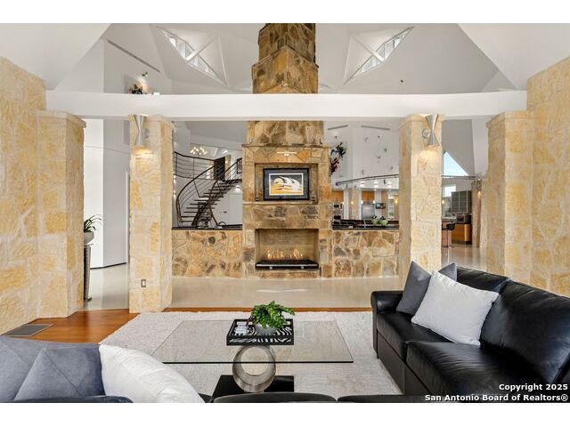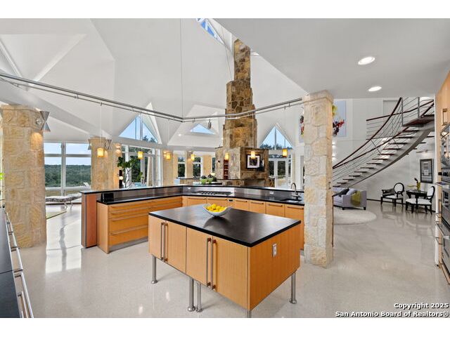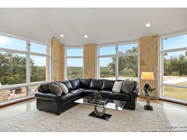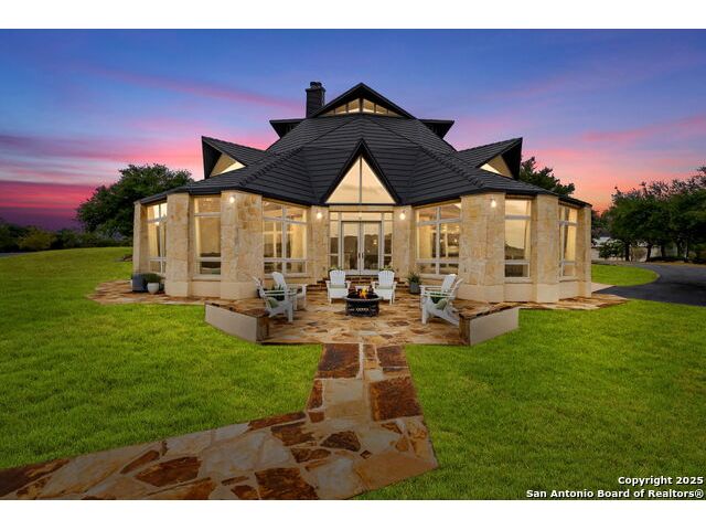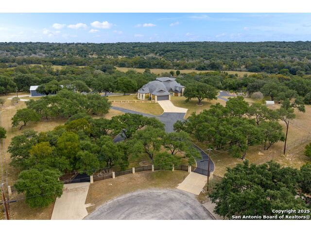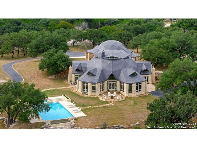 This luxurious, custom home features a geodesic design combined with a hill country aesthetic creating a one-of-a-kind masterpiece with privacy and unparalleled views! The plan behind the geodesic design was to take full advantage of the natural lighting by using a pin wheel skylight and multiple dormer windows. When the sun goes down you, have stunning views of the starlite sky! The home is situated on 25.29 private, sprawling acres with over 1,500 feet of Guadalupe River Frontage! The property has dual private automatic gates and a meandering driveway that leads you to the main residence, pool and gardening areas, the shop and down to the river! Being nestled on an elevated section of River Mountain Ranch allows you to live an extraordinary hill country lifestyle. The vast and unique floor plan is special! Throughout every space, the different textures, tones, dormers, windows, fixtures and soaring ceilings all cohesively blend to create your very own art museum. Walls of floor to ceiling and wraparound around Pella windows and doors allow you to be one with nature! The views can be appreciated throughout the entirety of the home. The entertaining enthusiast will appreciate the formal and informal living areas. The focal point is the floor to ceiling telescoping style fireplace that separates the great room and a secondary living space! There is a serving bar conveniently positioned on each side for entertaining. One containing a wet bar and the other a wine and beverage cooler - ideal for all of your mixology and serving needs. For the culinarian - the gourmet kitchen will not disappoint! Features include upscale Viking appliances, a 6 burner gas range, double ovens and side-by-side sub-zero refrigerator and freezer! There is a plethora of custom cabinetry and workspace. The wraparound sitting bar has seating for up to 8 and offers a relaxed eating space. For more refined dining experiences and holiday gatherings, the separate dining room offers an abundance of space and a buffet style serving area! The primary suite is situated on the main level and is complete with a spa-infused bath, double vanity, soaking tub, a seamless glass walk-in shower and dual custom wardrobe rooms. Completing the main level are the private study with an abundance of built-in bookshelves, a game room or flex room, and utility room with an adjoining storage room. A striking suspended staircase leads you to the grand foyer with a double door entry - which exudes an atmosphere of an art gallery. This level also hosts two spacious guest bedrooms with en-suite baths, a window desk area and a private balcony with more exceptional views! For the in-laws and overnight night guests, there is a separate, attached wing which features its own entrance with an open patio, as well as an entrance into the home! This wing provides the ultimate experience and is complete with a living area, kitchenette, bedroom suite, full bath, a flex room, which could serve as a second bedroom and stackable washer and dryer hookups. The outdoor spaces were designed for year-round living and entertaining. From evenings in front of the fire to lounging in the sparkling pool or spa, boredom is not an option! The gardening enthusiast will enjoy the raised bed garden area and the greenhouse with electricity, water and fan system for planting. Sprawling lawns provide ample space for leisure and play! The Morton barn features an automatic door and is ideal for housing all of your outdoor equipment, boat or up to nine cars. The most extraordinary thing about 117 Clear Springs Drive is the utmost privacy and accessible river access. No more having to plan river trips away when you have the river running through your property. A natural limestone sitting area is the perfect spot for relaxing with your feet in the water. The river is also a great spot for visiting with guests and enjoying a swim on warm days! Come experience hill country living at its finest while creating memories.