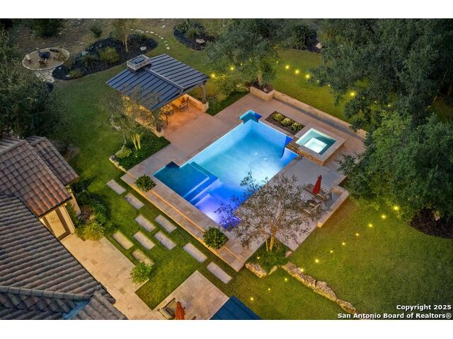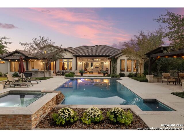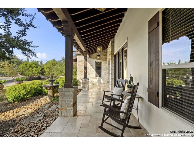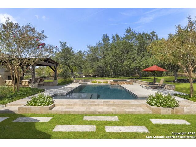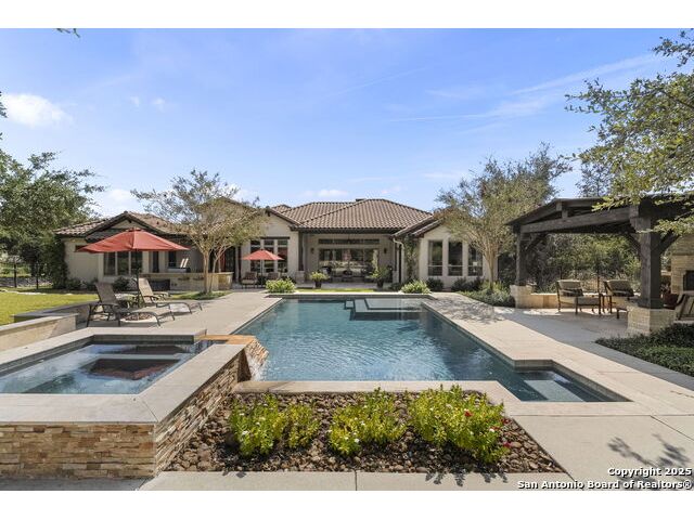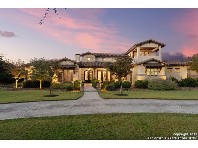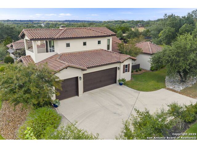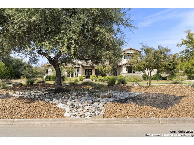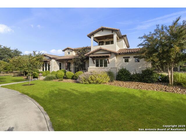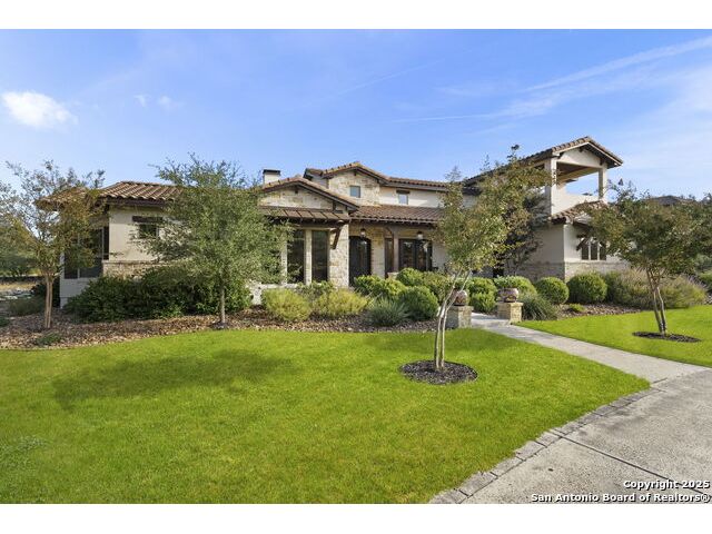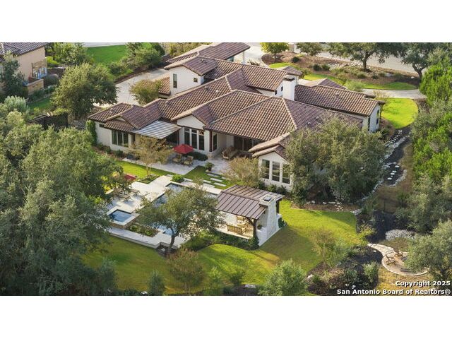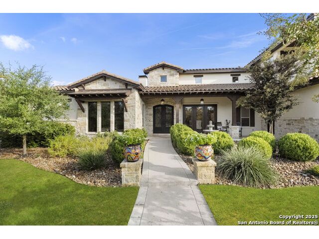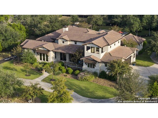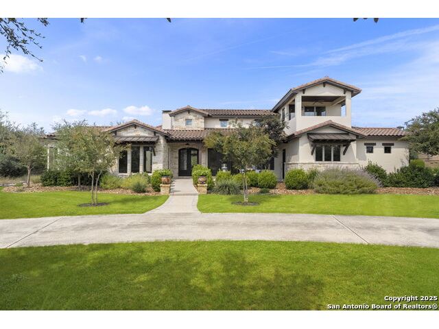 This stunning home is nestled on 1.16 resort-like acres and seamlessly blends Santa Barbara elegance with Hill Country charm creating a timeless allure inside and out! The Mediterranean and Spanish infused stylings complement each other striking the perfect balance between grandeur and warmth. The inviting foyer is a welcoming introduction boasting sophisticated, distressed wood beams and a set of double glass doors that open to an intimate courtyard with a soothing water feature. Walls of windows, transoms and glass doors provide natural lighting throughout creating warm and inviting spaces. Refined finishes include art niches with accent lighting, designer chandeliers and fixtures, crown mouldings, wood-like tile flooring in a herringbone pattern, furniture style cabinetry and detailed ceiling treatments. For a theater style experience there is a 5.1 surround sound system in the great room and game room. There are additional speakers in the dining room, master bedroom and main outdoor patio for listening to your favorite music while relaxing or entertaining. The great room boasts distressed wood beams, a soaring floor to ceiling stone fireplace, a custom built-in entertainment piece and a set of sliding glass doors opening to al fresco living spaces. The keen chef will appreciate the gourmet island kitchen that is well-equipped with upscale Jenn-Air stainless steel appliances including a 6 burner gas cooktop, built in refrigerator/freezer and a breakfast bar with under island storage cabinets. In addition, there is a wet bar complete with a sink and disposal, a secondary dishwasher drawer, U-line beverage cooler, built-in wine glass rack and custom cabinets! A butler's pantry services the formal dining room and boasts an abundance of storage cabinets. A haven of relaxation, the owner's retreat features outside access, natural lighting and serene backyard views. The spa-infused bath boasts separate vanities, plus a sitting vanity, garden tub, a seamless glass shower with multiple shower heads and a sprawling custom wardrobe room with a secondary laundry room. The private study and three spacious bedrooms, each boasting a walk-in closet complete the lower level. Upstairs is the spacious game room with outside access to a private balcony, a walk-in storage closet and a partial bath. For year-round enjoyment, the inspirational backyard oasis will not disappoint and is reminiscent of a private resort! There are multiple areas that are perfect for entertaining! The sprawling pool takes center stage! Details include a soothing water feature, adjoining spa, lounging deck and is surrounded by professional landscaping and open sitting areas. A picturesque cabana with a beautiful stone, wood burning fireplace borders the pool area. Additional appointments include a spacious covered patio, an additional covered patio with an outdoor kitchen and built-in grill, firepit area and a treehouse! The sprawling lawns boasts an abundance of mature trees and are ideal for leisure and play! For housing your vehicles, the attached 3-car garage affords ample space for your vehicles and includes epoxy flooring, storage space and workshop area with a sink. Set within the gated community of Stone Creek Ranch, residents also enjoy access to neighborhood amenities including a resort-style pool, clubhouse, and playground, offering the perfect blend of privacy, comfort, and community connection. You'll simply love coming home to this superb property!
