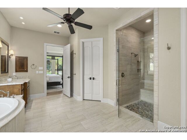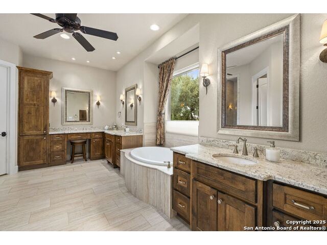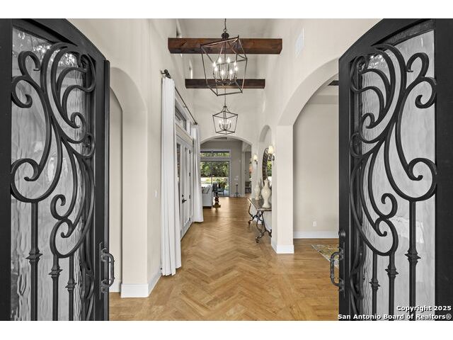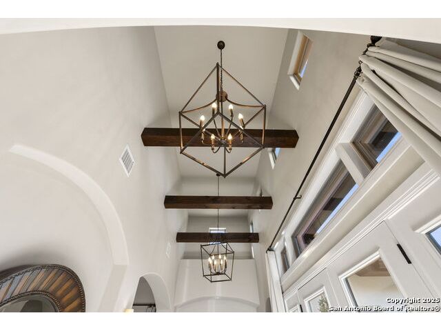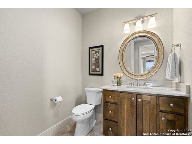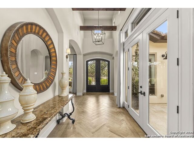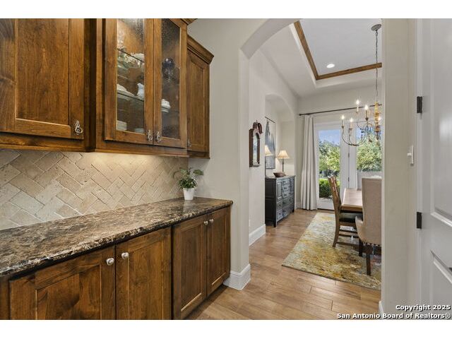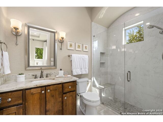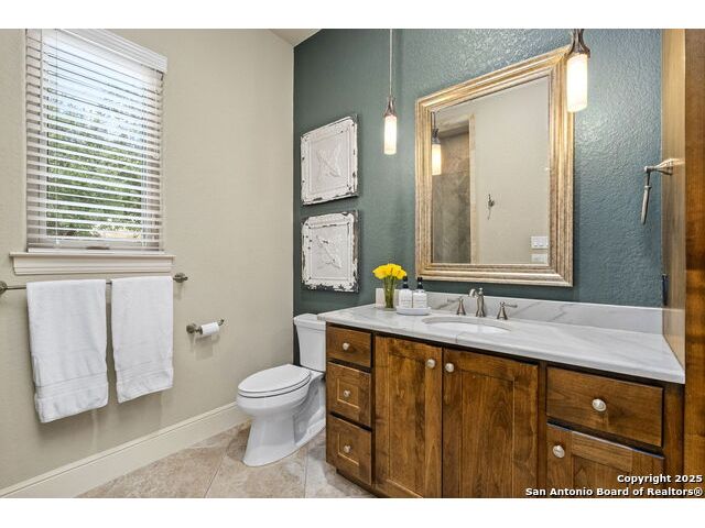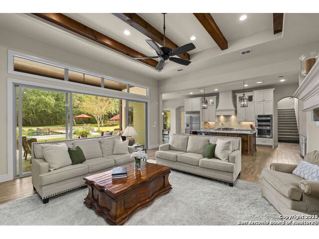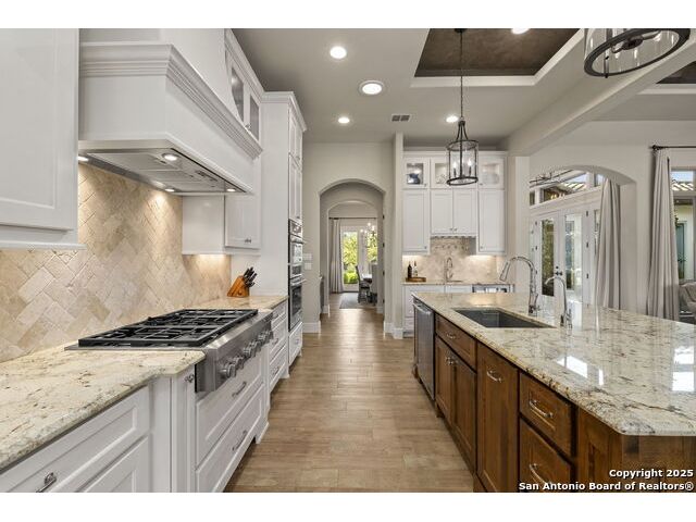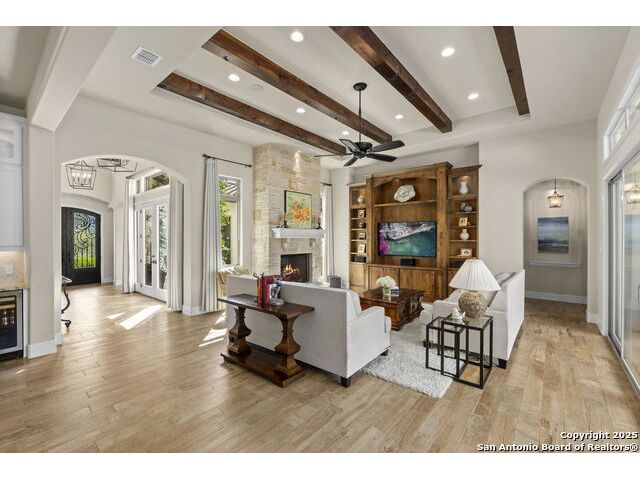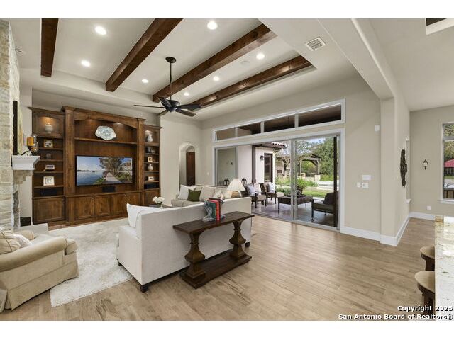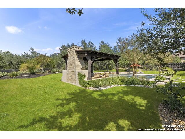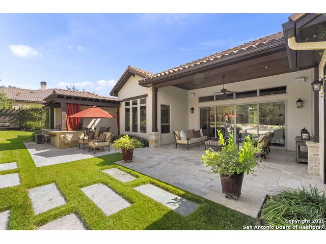 This stunning home is nestled on 1.16 resort-like acres and seamlessly blends Santa Barbara elegance with Hill Country charm creating a timeless allure inside and out! The Mediterranean and Spanish infused stylings complement each other striking the perfect balance between grandeur and warmth. The inviting foyer is a welcoming introduction boasting sophisticated, distressed wood beams and a set of double glass doors that open to an intimate courtyard with a soothing water feature. Walls of windows, transoms and glass doors provide natural lighting throughout creating warm and inviting spaces. Refined finishes include art niches with accent lighting, designer chandeliers and fixtures, crown mouldings, wood-like tile flooring in a herringbone pattern, furniture style cabinetry and detailed ceiling treatments. For a theater style experience there is a 5.1 surround sound system in the great room and game room. There are additional speakers in the dining room, master bedroom and main outdoor patio for listening to your favorite music while relaxing or entertaining. The great room boasts distressed wood beams, a soaring floor to ceiling stone fireplace, a custom built-in entertainment piece and a set of sliding glass doors opening to al fresco living spaces. The keen chef will appreciate the gourmet island kitchen that is well-equipped with upscale Jenn-Air stainless steel appliances including a 6 burner gas cooktop, built in refrigerator/freezer and a breakfast bar with under island storage cabinets. In addition, there is a wet bar complete with a sink and disposal, a secondary dishwasher drawer, U-line beverage cooler, built-in wine glass rack and custom cabinets! A butler's pantry services the formal dining room and boasts an abundance of storage cabinets. A haven of relaxation, the owner's retreat features outside access, natural lighting and serene backyard views. The spa-infused bath boasts separate vanities, plus a sitting vanity, garden tub, a seamless glass shower with multiple shower heads and a sprawling custom wardrobe room with a secondary laundry room. The private study and three spacious bedrooms, each boasting a walk-in closet complete the lower level. Upstairs is the spacious game room with outside access to a private balcony, a walk-in storage closet and a partial bath. For year-round enjoyment, the inspirational backyard oasis will not disappoint and is reminiscent of a private resort! There are multiple areas that are perfect for entertaining! The sprawling pool takes center stage! Details include a soothing water feature, adjoining spa, lounging deck and is surrounded by professional landscaping and open sitting areas. A picturesque cabana with a beautiful stone, wood burning fireplace borders the pool area. Additional appointments include a spacious covered patio, an additional covered patio with an outdoor kitchen and built-in grill, firepit area and a treehouse! The sprawling lawns boasts an abundance of mature trees and are ideal for leisure and play! For housing your vehicles, the attached 3-car garage affords ample space for your vehicles and includes epoxy flooring, storage space and workshop area with a sink. Set within the gated community of Stone Creek Ranch, residents also enjoy access to neighborhood amenities including a resort-style pool, clubhouse, and playground, offering the perfect blend of privacy, comfort, and community connection. You'll simply love coming home to this superb property!