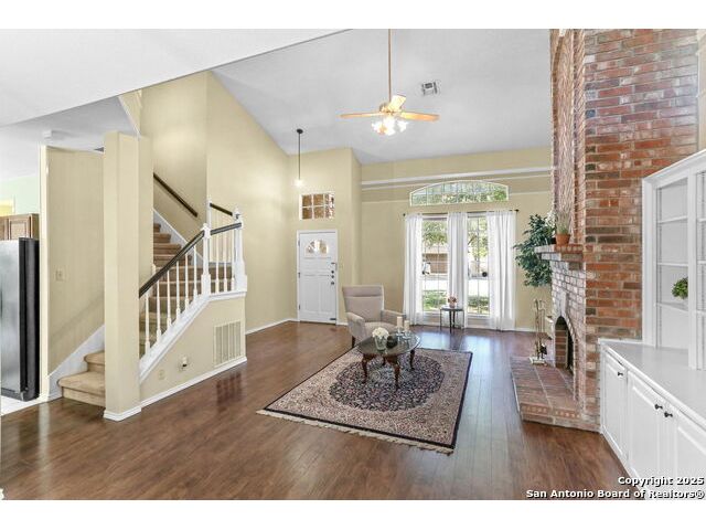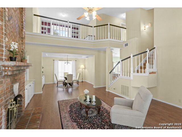 A true gem in Castle Hills Forest ! Welcome to this beautiful home located in the sought-after community of Castle Hills. Curb appeal abounds with a classic brick exterior, a mature shade tree, and a welcoming front entrance that sets the tone for the rest of this beautiful home. As you step inside, you'll be greeted by a cozy living room featuring a charming brick fireplace and built-in shelving that blend seamlessly into the space. The soaring ceilings and open loft create a wonderful sense of openness and light. Adjacent to the living room is a formal dining area accented with a large wall mirror and elegant cabinetry - perfect for showcasing your fine china. A large window fills the space with natural light and offers views of the backyard. The wood laminate flooring adds a warm, stylish touch. The spacious kitchen features rich brown cabinets, granite countertops, a centered island and an electric range, making it as functional as it is beautiful. A breakfast area surrounded by windows offers a relaxing spot to enjoy your morning coffee. Upstairs, you'll find all the bedrooms for added privacy. The primary suite boasts high ceilings, a full ensuite bath, and a tile and stone-tiled shower that complements the cabinetry beautifully - the perfect retreat after a long day. Steps to Salado Trails for walking, biking, and enjoying nature. Minutes from Alon Town Center for shopping, restaurants and top rated schools. Charm, and space come together in this exceptional home! Schedule a tour today!