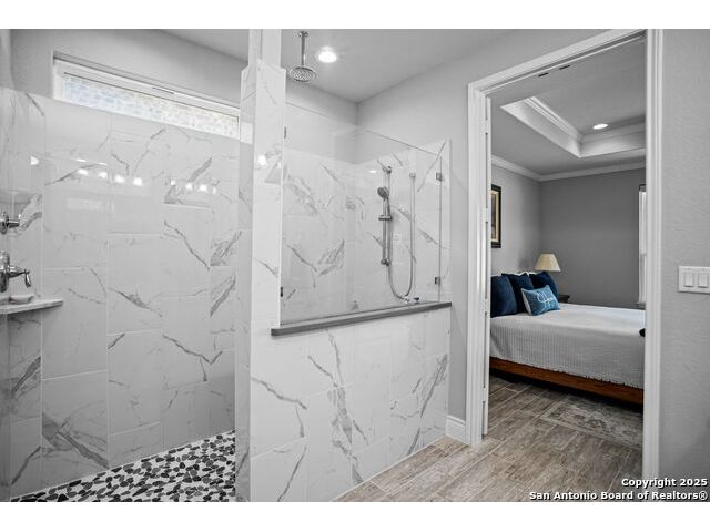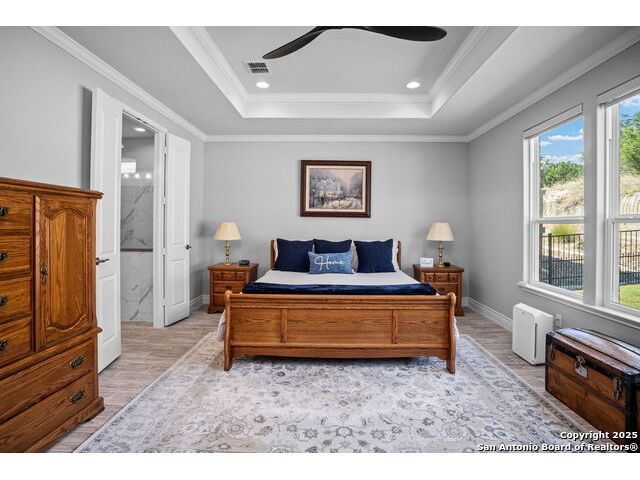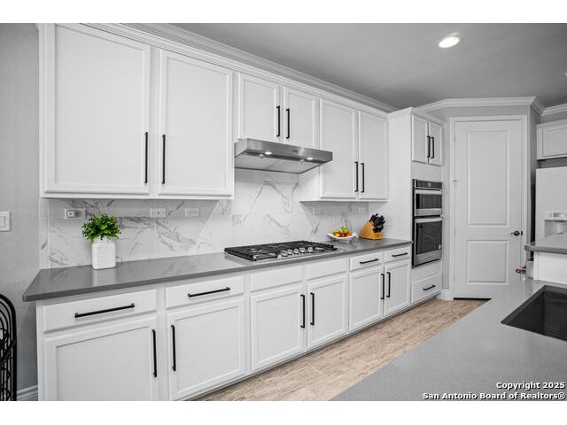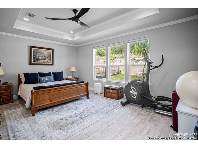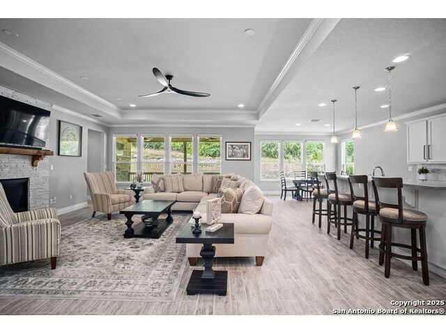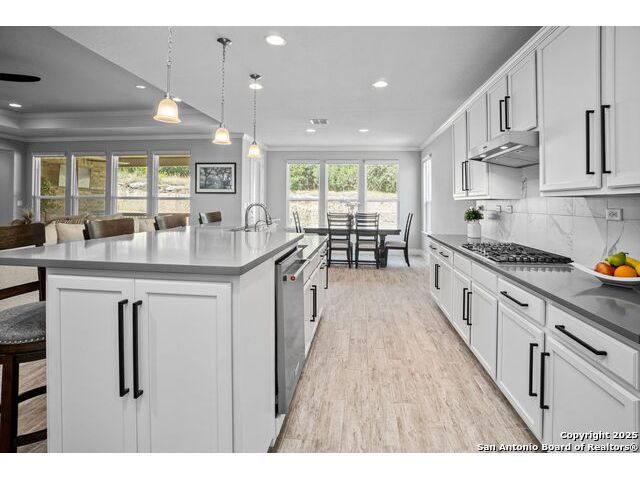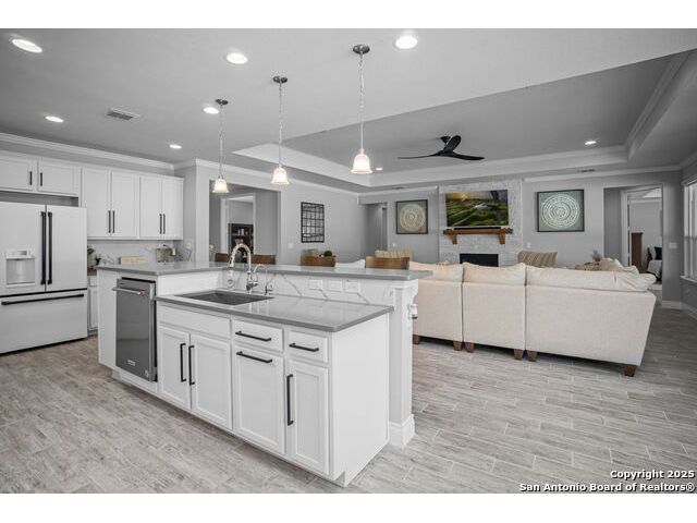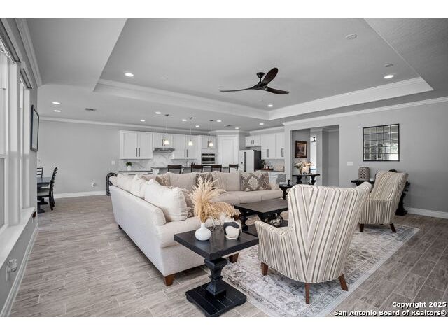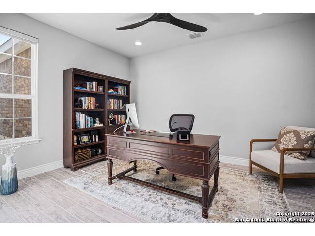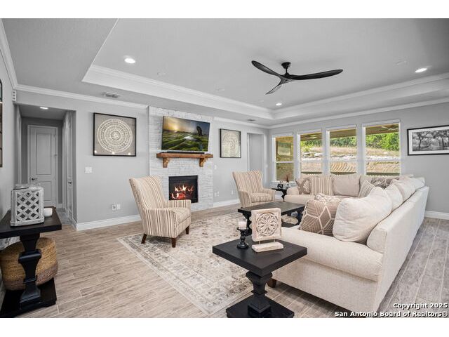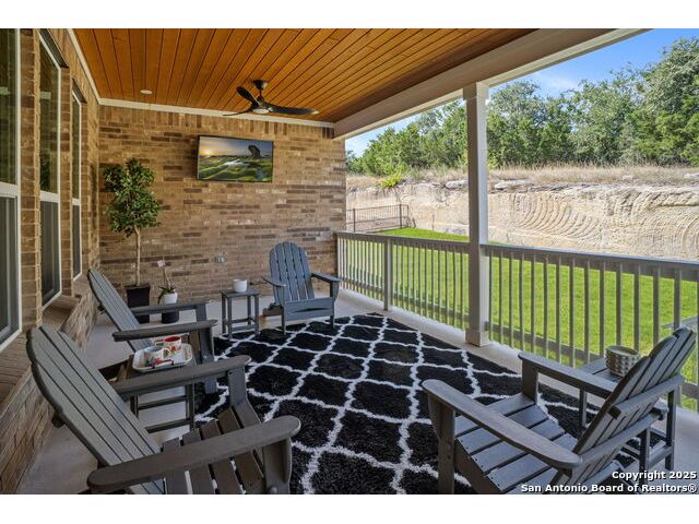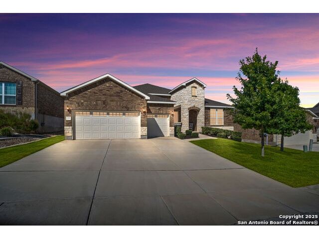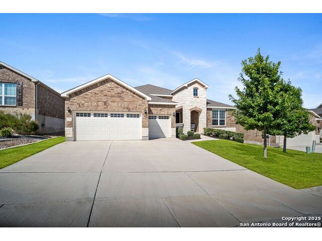 Welcome Home to resort style living! Crisp, clean curb appeal and a charming covered front porch create a warm invitation, perfect for a bench and seasonal decorations. From the moment you step inside the greenbelt lot captures your attention that immediately sets a relaxing tone. Elegant double doors open to the study with a window and view of your front porch. Bright and Spacious secondary bedroom has its own private full bathroom with a walk in shower. Open concept living area, tray ceilings with a 70" ceiling fan, cozy fireplace and room for oversized furniture. Expansive windows along the back of the home showcase your tranquil greenbelt views with glimpses of deer and mature trees. All windows have XPEL window coating for energy efficiency and custom remote-controlled/Bluetooth automatic shades for effortless comfort. Gourgous kitchen is a chef's dream with plenty of upgraded cabinetry and black metal hardware. An elevated built in dishwasher for easy access, stainless steel appliances, gas cooktop and a custom Cafe series refrigerator that offers hot and cold water. Island with a deep sink and additional eating area with bar stool seating complete the kitchen. Throughout the home, appreciate all wood-like tile making this a carpet free home. Half bath for guests down the hall near the laundry room that offers a wash sink, cabintry and space for a refrigerator and extra storage. Relax and unwind is your oversized primary suite with large picture windows, private views, tray ceiling and decorative fan. Primary bathroom offers a spa like walk-in rain shower, dual vanities and an amazing oversized closet. Step outside to your expansive covered patio with a wood-paneled ceiling and fan perfect for morning coffee or evening dining in the shade. This patio offers so much room and space and is truly an extension of your living space with afternoon shade. 3 car garage with a tandem bump out for storage or a 4th car. This beauty was built to be loved. Move in ready with so many well thought extras that you will appreciate. Del Webb offers full resort living with a full time on site activity coordinator, fitness center, courts, 3 pools, plenty of walking trails and more!